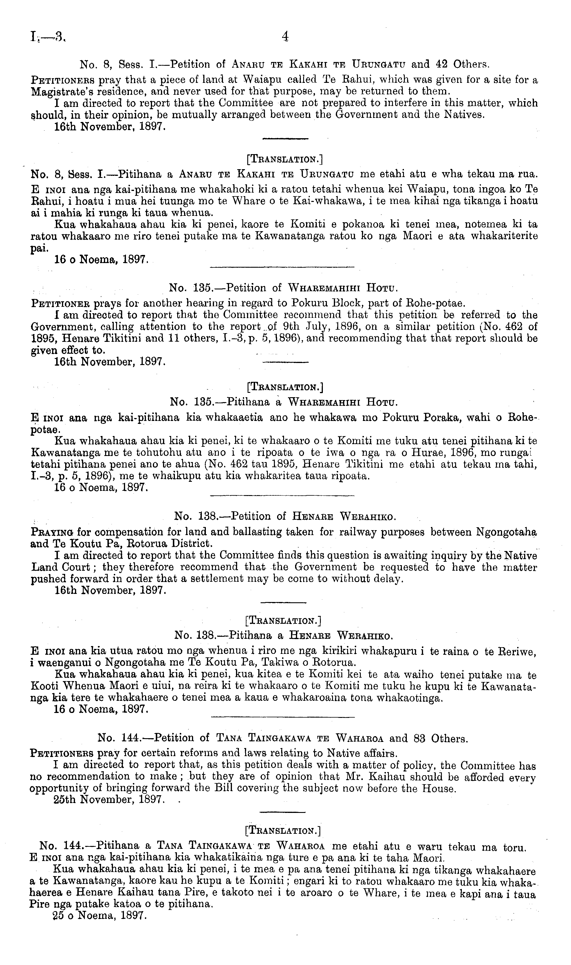 [Translation.] No. 135.—Pitihana a Wharemahihi Hotu. E iNOi ana nga kai-pitihana kia whakaaetia ano he whakawa mo Pokuru Poraka, wahi o Eohepotae. Kua whakahaua ahau kia ki penei, kite whakaaro o te Komiti me tuku atu tenei pitihana kite Kawanatanga me te tohutohu atu ano i te ripoata o to iwa o nga ra o Hurae, 1896, mo rungai tetahi pitihana penei ano te ahua (No. 462 tau 1895, Henare Tikitini me etahi atu tekau ma tahi, 1.-3, p. 5, 1896), me te whaikupu atu kia whakaritea taua ripoata. 16 o Noema, 1897.