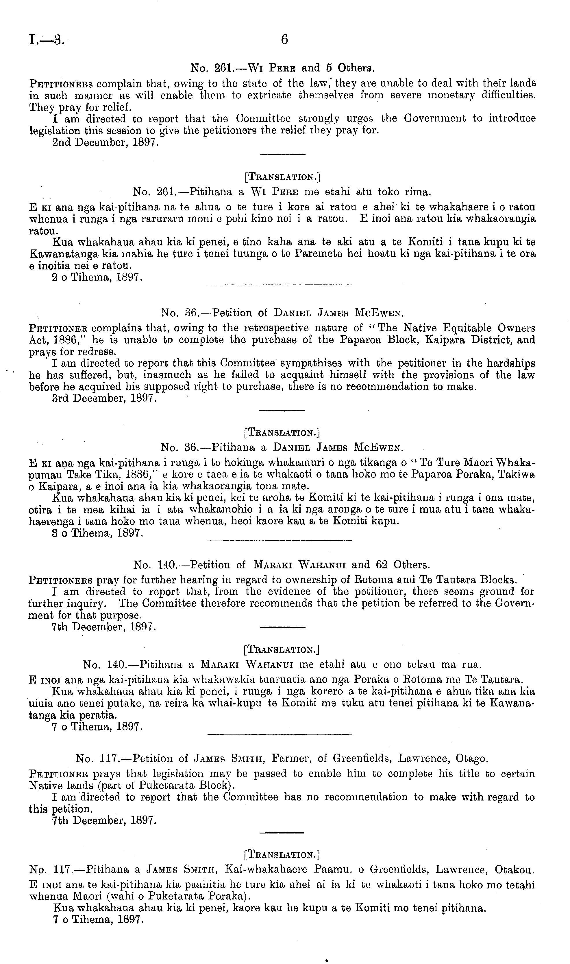 [Translation.] No. 36. —Pitihana a Daniel James McEwen. E ki ana nga kai-pitihana i runga i te hokinga whakamuri o nga tikanga o " Te Ture Maori Whakapumau Take Tika, 1886," c kore c taea c ia te whakaoti o tana hoko mo te Paparoa Poraka, Takiwa o Kaipara, a c inoi ana ia kia whakaorangia tona mate. Kua whakahaua ahau kia ki penei, kei te aroha te Komiti kite kai-pitihana i runga i ona mate, otira i te mea kihai ia i ata whakamohio i a ia ki nga aronga o te ture i mua atu i tana whakahaerenga i tana hoko mo taua whenua, heoi kaore kau a te Komiti kupu. 3 o Tihema, 1897.
