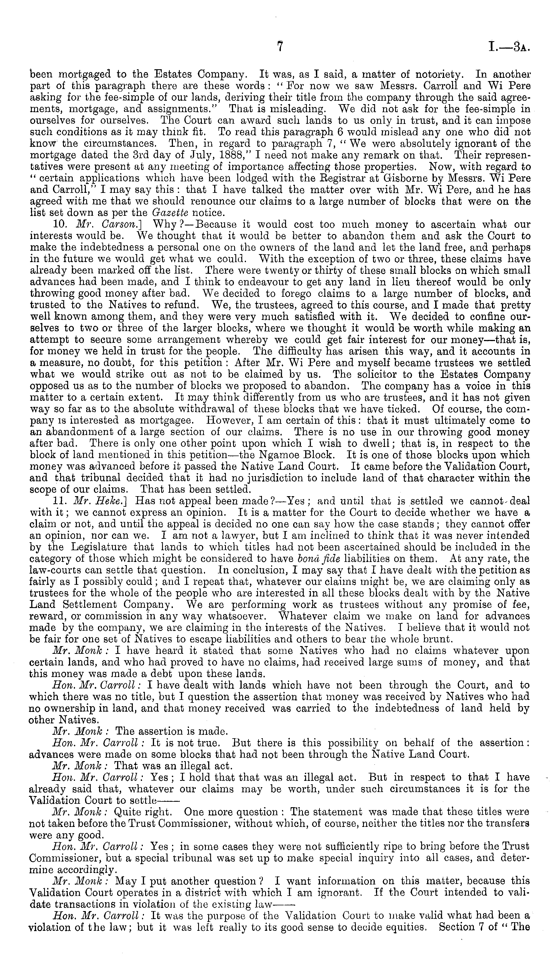 been mortgaged to the Estates Company. It was, as I said, a matter of notoriety. In another part of this paragraph there are these words : " For now we saw Messrs. Carroll and Wi Pere asking for the fee-simple of our lands, deriving their title from the company through the said agreements, mortgage, and assignments." That is misleading. We did not ask for the fee-simple in ourselves for ourselves. The Court can award such lands to us only in trust, and it can impose such conditions as it may think fit. To read this paragraph 6 would mislead any one who did not know the circumstances. Then, in regard to paragraph 7, "We were absolutely ignorant of the mortgage dated the 3rd day of July, 1888," I need not make any remark on that. Their representatives were present at any meeting of importance affecting those properties. Now, with regard to " certain applications which have been lodged with the Registrar at Gisborne by Messrs. Wi Pere and Carroll," I may say this : that I have talked the matter over with Mr. Wi Pere, and he has agreed with me that we should renounce our claims to a large number of blocks that were on the list set down as per the Gazette notice. 10. Mr. Carson.'] Why?— Because it would cost too much money to ascertain what our interests would be. We thought that it would be better to abandon them and ask the Court to make the indebtedness a personal one on the owners of the land and let the land free, and perhaps in the future we would get what we could. With the exception of two or three, these claims have already been marked off the list. There were twenty or thirty of these small blocks on which small advances had been made, and I think to endeavour to get any land in lieu thereof would be only throwing good money after bad. We decided to forego claims to a large number of blocks, and trusted to the Natives to refund. We, the trustees, agreed to this course, and I made that pretty well known among them, and they were very much satisfied with it. We decided to confine ourselves to two or three of the larger blocks, where we thought it would be worth while making an attempt to secure some arrangement whereby we could get fair interest for our money—that is, for money we held in trust for the people. The difficulty has arisen this way, and it accounts in a measure, no doubt, for this petition : After Mr. Wi Pere and myself became trustees we settled what we would strike out as not to be claimed by us. The solicitor to the Estates Company opposed us as to the number of blocks we proposed to abandon. The company has a voice in this matter to a certain extent. It may think differently from us who are trustees, and it has not given way so far as to the absolute withdrawal of these blocks that we have ticked. Of course, the company is interested as mortgagee. However, lam certain of this : that it must ultimately come to an abandonment of a large section of our claims. There is no use in our throwing good money after bad. There is only one other point upon which I wish to dwell; that is, in respect to the block of land mentioned in this petition—the Ngamoe Block. It is one of those blocks upon which money was advanced before it passed the Native Land Court. It came before the Validation Court, and that tribunal decided that it had no jurisdiction to include land of that character within the scope of our claims. That has been settled. 11. Mr. Heke.] Has not appeal been made? —Yes; and until that is settled we cannot deal with it; we cannot express an opinion. It is a matter for the Court to decide whether we have a claim or not, and until the appeal is decided no one can say how the case stands; they cannot offer an opinion, nor can we. I am not a lawyer, but lam inclined to think that it was never intended by the Legislature that lands to which titles had not been ascertained should be included in the category of those which might be considered to have bond fide liabilities on them. At any rate, the law-courts can settle that question. In conclusion, I may say that I have dealt with the petition as fairly as I possibly could; and I repeat that, whatever our claims might be, we are claiming only as trustees for the whole of the people who are interested in all these blocks dealt with by the Native Land Settlement Company. We are performing work as trustees without any promise of fee, reward, or commission in any way whatsoever. Whatever claim we make on land for advances made by the company, we are claiming in the interests of the Natives. I believe that it would not be fair for one set of Natives to escape liabilities and others to bear the whole brunt. Mr. Monk : I have heard it stated that some Natives who had no claims whatever upon certain lands, and who had proved to have no claims, had received large sums of money, and that this money was made a debt upon these lands. Hon. Mr. Carroll: I have dealt with lands which have not been through the Court, and to which there was no title, but I question the assertion that money was received by Natives who had no ownership in land, and that money received was carried to the indebtedness of land held by other Natives. Mr. Monk : The assertion is made. Hon. Mr. Carroll: It is not true. But there is this possibility on behalf of the assertion : advances were made on some blocks that had not been through the Native Land Court. Mr. Monk: That was an illegal act. Hon. Mr. Carroll: Yes ; I hold that that was an illegal act. But in respect to that I have already said that, whatever our claims may be worth, under such circumstances it is for the Validation Court to settle Mr. Monk : Quite right. One more question : The statement was made that these titles were not taken before the Trust Commissioner, without which, of course, neither the titles nor the transfers were any good. Hon. Mr. Carroll: Yes ;in some cases they were not sufficiently ripe to bring before the Trust Commissioner, but a special tribunal was set up to make special i