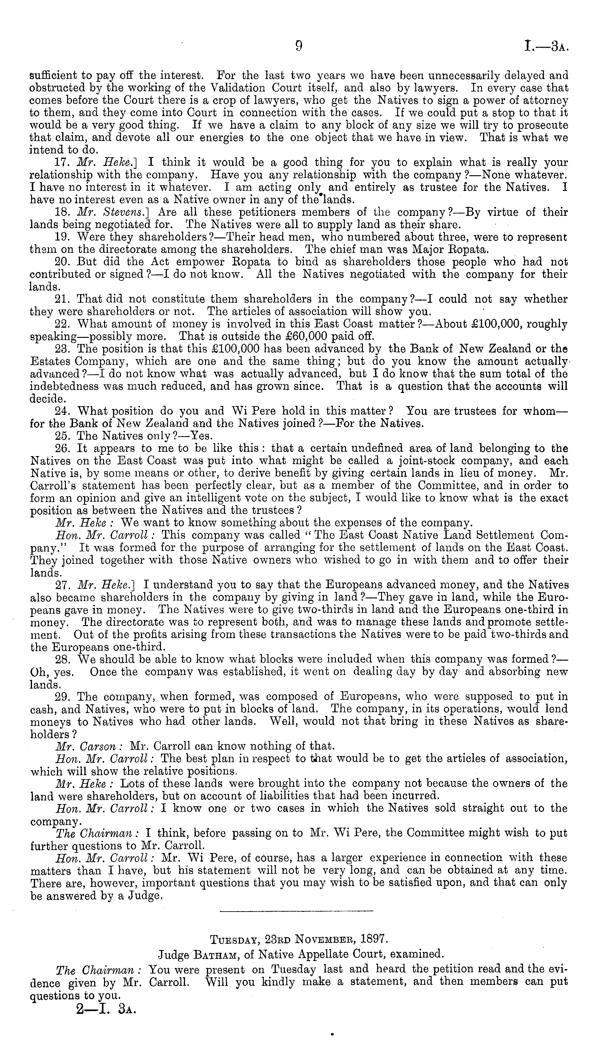 Tuesday, 23bd November, 1897. •Judge Batham, of Native Appellate Court, examined. The Chairman : You were present on Tuesday last and heard the petition read and the evidence given by Mr. Carroll. Will you kindly make a statement, and then members can put questions to you.