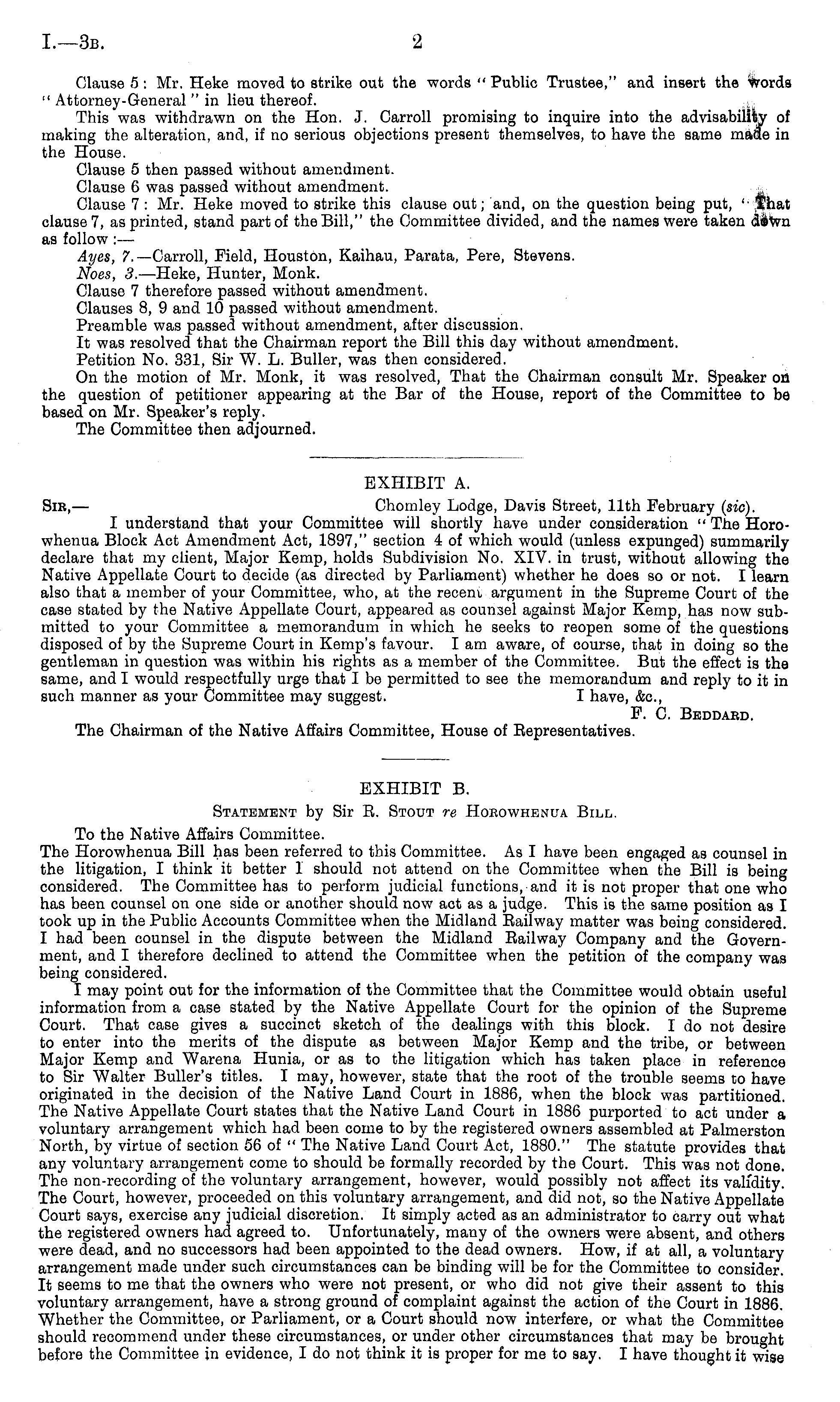 EXHIBIT A. Sir, — Chomley Lodge, Davis Street, 11th February (sic). I understand that your Committee will shortly have under consideration " The Horowhenua Block Act Amendment Act, 1897," section 4 of which would (unless expunged) summarily declare that my client, Major Kemp, holds Subdivision No. XIV. in trust, without allowing the Native Appellate Court to decide (as directed by Parliament) whether he does so or not. I learn also that a member of your Committee, who, at the receni argument in the Supreme Court of the case stated by the Native Appellate Court, appeared as counsel against Major Kemp, has now submitted to your Committee a memorandum in which he seeks to reopen some of the questions disposed of by the Supreme Court in Kemp's favour. lam aware, of course, that in doing so the gentleman in question was within his rights as a member of the Committee. But the effect is the same, and I would respectfully urge that I be permitted to see the memorandum and reply to it in such manner as your Committee may suggest. I have, &c, F. C. Beddard. The Chairman of the Native Affairs Committee, House of Eepresentatives.