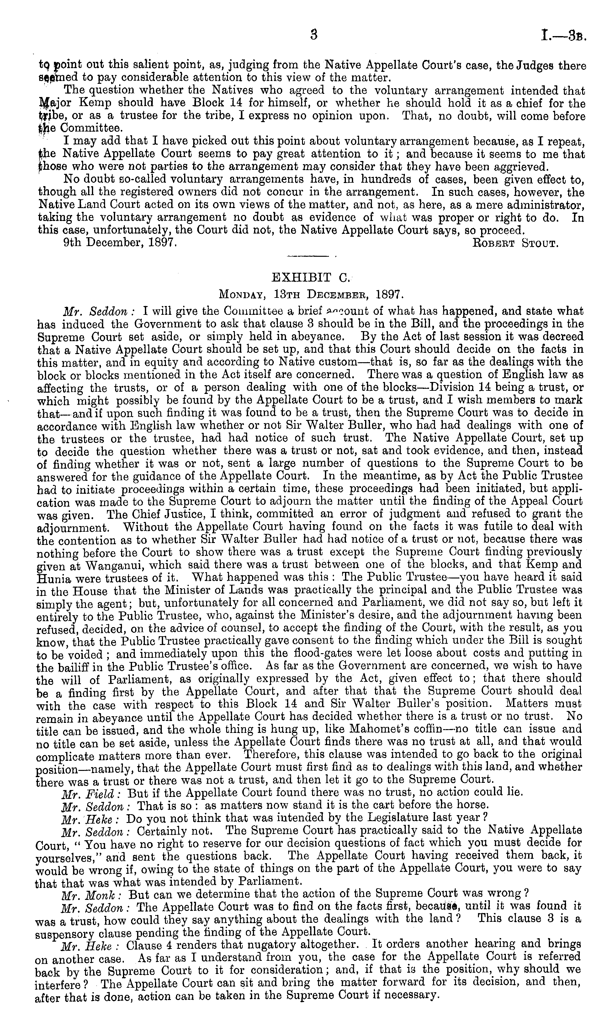 EXHIBIT C. Monday, 13th December, 1897. Mr. Seddon : I will give the Committee a brief »"eount of what has happened, and state what has induced the Government to ask that clause 3 should be in the Bill, and the proceedings in the Supreme Court set aside, or simply held in abeyance. By the Act of last session it was decreed that a Native Appellate Court should be set up, and that this Court should decide on the facts in this matter, and in equity and according to Native custom —that is, so far as the dealings with the block or blocks mentioned in the Act itself are concerned. There was a question of English law as affecting the trusts, or of a person dealing with one of the blocks—Division 14 being a trust, or which might possibly be found by the Appellate Court to be a trust, and I wish members to mark that— and if upon such finding it was found to be a trust, then the Supreme Court was to decide in accordance with English law whether or not Sir Walter Buller, who had had dealings with one of the trustees or the trustee, had had notice of such trust. The Native Appellate Court, set up to decide the question whether there was a trust or not, sat and took evidence, and then, instead of finding whether it was or not, sent a large number of questions to the Supreme Court to be answered for the guidance of the Appellate Court. In the meantime, as by Act the Public Trustee had to initiate proceedings within a certain time, these proceedings had been initiated, but application was made to the Supreme Court to adjourn the matter until the finding of the Appeal Court was given. The Chief Justice, I think, committed an error of judgment and refused to grant the adjournment. Without the Appellate Court having found on the facts it was futile to deal with the contention as to whether Sir Walter Buller had had notice of a trust or not, because there was nothing before the Court to show there was a trust except the Supreme Court finding previously given at Wanganui, which said there was a trust between one of the blocks, and that Kemp and Hunia were trustees of it. What happened was this : The Public Trustee—you have heard it said in the House that the Minister of Lands was practically the principal and the Public Trustee was simply the agent; but, unfortunately for all concerned and Parliament, we did not say so, but left it entirely to the Public Trustee, who, against the Minister's desire, and the adjournment having been refused, decided, on the advice of counsel, to accept the finding of the Court, with the result, as you know, that the Public Trustee practically gave consent to the finding which under the Bill is sought to be voided ; and immediately upon this the flood-gates were let loose about costs and putting in the bailiff in the Public Trustee's office. As far as the Government are concerned, we wish to have the will of Parliament, as originally expressed by the Act, given effect to; that there should be a finding first by the Appellate Court, and after that that the Supreme Court should deal with the case with respect to this Block 14 and Sir Walter Buller's position. Matters must remain in abeyance until the Appellate Court has decided whether there is a trust or no trust. No title can be issued, and the whole thing is hung up, like Mahomet's coffin —no title can issue and no title can be set aside, unless the Appellate Court finds there was no trust at all, and that would complicate matters more than ever. Therefore, this clause was intended to go back to the original position namely, that the Appellate Court must first find as to dealings with this land, and whether there was a trust or there was not a trust, and then let it go to the Supreme Court. Mr. Field: But if the Appellate Court found there was no trust, no action could lie. Mr. Seddon : That is so : as matters now stand it is the cart before the horse. Mr. Heke : Do you not think that was intended by the Legislature last year ? Mr. Seddon : Certainly not. The Supreme Court has practically said to the Native Appellate Court " You have no right to reserve for our decision questions of fact which you must decide for yourselves," and sent the questions back. The xippellate Court having received them back, it would be wrong if, owing to the state of things on the part of the Appellate Court, you were to say that that was what was intended by Parliament. Mr. Monk: But can we determine that the action of the Supreme Court was wrong ? Mr. Seddon: The Appellate Court was to find on the facts first, because, until it was found it was a trust, how could they say anything about the dealings with the land ? This clause 3is a suspensory clause pending the finding of the Appellate Court. Mr. Heke : Clause 4 renders that nugatory altogether. It orders another hearing and brings on another case. As far as I understand from you, the case for the Appellate Court is referred back by the Supreme Court to it for consideration; and, if that is the position, why should we interfere ? The Appellate Court can sit and bring the matter forward for its decision, and then, after that is done, action can be taken in the Supreme Court if necessary.