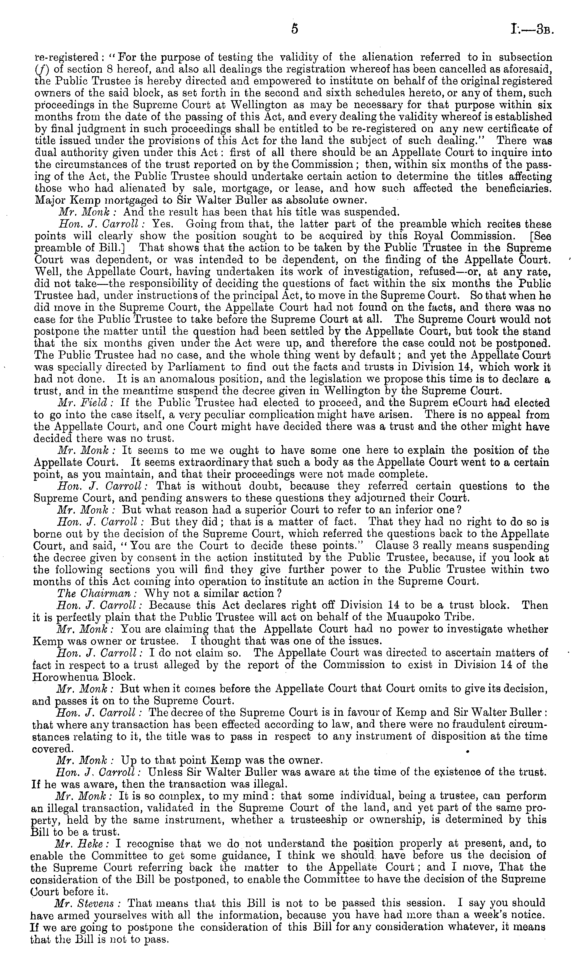 re-registered :" For the purpose of testing the validity of the alienation referred to in subsection (/) of section 8 hereof, and also all dealings the registration whereof has been cancelled as aforesaid, the Public Trustee is hereby directed and empowered to institute on behalf of the original registered owners of the said block, as set forth in the second and sixth schedules hereto, or any of them, such proceedings in the Supreme Court at Wellington as may be necessary for that purpose within six months from the date of the passing of this Act, and every dealing the validity whereof is established by final judgment in such proceedings shall be entitled to be re-registered on any new certificate of title issued under the provisions of this Act for the land the subject of such dealing." There was dual authority given under this Act: first of all there should be an Appellate Court to inquire into the circumstances of the trust reported on by the Commission ; then, within six months of the passing of the Act, the Public Trustee should undertake certain action to determine the titles affecting those who had alienated by sale, mortgage, or lease, and how such affected the beneficiaries. Major Kemp mortgaged to Sir Walter Buller as absolute owner. Mr. Monk : And the result has been that his title was suspended. Hon. J. Carroll: Yes. Going from that, the latter part of the preamble which recites these points will clearly show the position sought to be acquired by this Royal Commission. [See preamble of Bill.] That shows that the action to be taken by the Public Trustee in the Supreme Court was dependent, or was intended to be dependent, on the finding of the Appellate Court. Well, the Appellate Court, having undertaken its work of investigation, refused—or, at any rate, did not take—the responsibility of deciding the questions of fact within the six months the Public Trustee had, under instructions of the principal Act, to move in the Supreme Court. So that when he did move in the Supreme Court, the Appellate Court had not found on the facts, and there was no case for the Public Trustee to take before the Supreme Court at all. The Supreme Court would not postpone the matter until the question had been settled by the Appellate Court, but took the stand that the six months given under the Act were up, and therefore the case could not be postponed. The Public Trustee had no case, and the whole thing went by default; and yet the Appellate Court was specially directed by Parliament to find out the facts and trusts in Division 14, which work it had not done. It is an anomalous position, and the legislation we propose this time is to declare a trust, and in the meantime suspend the decree given in Wellington by the Supreme Court. Mr. Field: If the Public Trustee had elected to proceed, and the Supreme Court had elected to go into the case itself, a very peculiar complication might have arisen. There is no appeal from the Appellate Court, and one Court might have decided there was a trust and the other might have decided there was no trust. Mr. Monk : It seems to me we ought to have some one here to explain the position of the Appellate Court. It seems extraordinary that such a body as the Appellate Court went to a certain point, as you maintain, and that their proceedings were not made complete. Hon. J. Carroll: That is without doubt, because they referred certain questions to the Supreme Court, and pending answers to these questions they adjourned their Court. Mr. Monk : But what reason had a superior Court to refer to an inferior one ? Hon. J. Carroll: But they did ; that is a matter of fact. That they had no right to do so is borne out by the decision of the Supreme Court, which referred the questions back to the Appellate Court, and said, "You are the Court to decide these points." Clause 3 really means suspending the decree given by consent in the action instituted by the Public Trustee, because, if you look at the following sections you will find they give further power to the Public Trustee within two months of this Act coming into operation to institute an action in the Supreme Court. The Chairman : Why not a similar action ? Hon. J. Carroll: Because this Act declares right off Division 14 to be a trust block. Then it is perfectly plain that the Public Trustee will act on behalf of the Muaupoko Tribe. Mr. Monk: You are claiming that the Appellate Court had no power to investigate whether Kemp was owner or trustee. I thought that was one of the issues. Hon. J. Carroll: Ido not claim so. The Appellate Court was directed to ascertain matters of fact in respect to a trust alleged by the report of the Commission to exist in Division 14 of the Horowhenua Block. Mr. Monk : But when it comes before the Appellate Court that Court omits to give its decision, and passes it on to the Supreme Court. Hon. J. Carroll: The decree of the Supreme Court is in favour of Kemp and Sir Walter Buller : that where any transaction has been effected according to law, and there were no fraudulent circumstances relating to it, the title was to pass in respect to any instrument of disposition at the time covered. . Mr. Monk : Up to that point Kemp was the owner. Hon. J, Carroll: Unless Sir Walter Buller was aware at the time of the existence of the trust. If he was aware, then the transaction was illegal. Mr. Monk : It is so complex, to my mind : that some individual, being a trustee, can perform an illegal transaction, validated in the Supreme Court of the land, and yet part of the same property, held by the same instrument, whether a trusteeship or ownership, is determined by this Bill to be a trust. Mr. Heke: I recognise that we do not understand the position properly at present, and, to enable the Committee to get some guidance, I think we should have before us the decision of the Supreme Court referring back the matter to the Appellate Court; and I move, That the consideration of the Bill be postponed, to enable