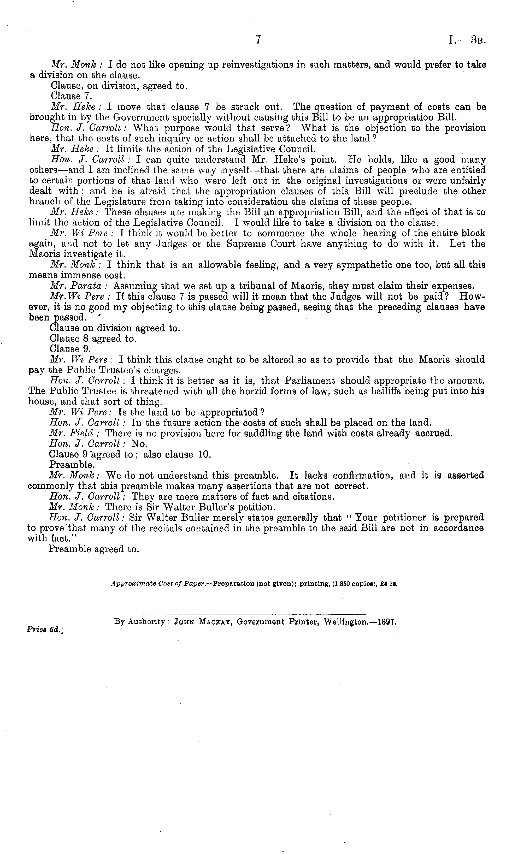 Mr. Monk : I do not like opening up reinvestigations in such matters, and would prefer to take a division on the clause. Clause, on division, agreed to. Clause 7. Mr. Heke : I move that clause 7 be struck out. The question of payment of costs can be brought in by the Government specially without causing this Bill to be an appropriation Bill. Hon. J. Carroll: What purpose would that serve ? What is the objection to the provision here, that the costs of such inquiry or action shall be attached to the land'? Mr. Heke: It limits the action of the Legislative Council. Hon. J. Carroll: I can quite understand Mr. Heke's point. He holds, like a good many others—and I am inclined the same way myself—that there are claims of people who are entitled to certain portions of that laud who were left out in the original investigations or were unfairly dealt with ; and he is afraid that the appropriation clauses of this Bill will preclude the other branch of the Legislature from taking into consideration the claims of these people. Mr. Heke : These clauses are making the Bill an appropriation Bill, and the effect of that is to limit the action of the Legislative Council. I would like to take a division on the clause. Mr. Wi Pere : I think it would be better to commence the whole hearing of the entire block again, and not to let any Judges or the Supreme Court have anything to do with it. Let the Maoris investigate it. Mr. Monk : I think that is an allowable feeling, and a very sympathetic one too, but all this means immense cost. Mr. Parata: Assuming that we set up a tribunal of Maoris, they must claim their expenses. Mr.Wi Pere : If this clause 7is passed will it mean that the Judges will not be paid? However, it is no good my objecting to this clause being passed, seeing that the preceding clauses have been passed. Clause on division agreed to. . Clause 8 agreed to. Clause 9. Mr. Wi Pere : I think this clause ought to be altered so as to provide that the Maoris should pay the Public Trustee's charges. Hon. J. Carroll : I think it is better as it is, that Parliament should appropriate the amount. The Public Trustee is threatened with all the horrid forms of law, such as bailiffs being put into his house, and that sort of thing. Mr. Wi Pere: Is the land to be appropriated ? Hon. J. Carroll: In the future action the costs of such shall be placed on the land. Mr. Field : There is no provision here for saddling the land with costs already accrued. Hon. J. Carroll: No. Clause 9 agreed to; also clause 10. Preamble. Mr. Monk: We do not understand this preamble. It lacks confirmation, and it is asserted commonly that this preamble makes many assertions that are not correct. Hon. J. Carroll: They are mere matters of fact and citations. Mr. Monk: There is Sir Walter Buller's petition. Hon. J. Carroll: Sir Walter Buller merely states generally that " Your petitioner is prepared to prove that many of the recitals contained in the preamble to the said Bill are not in accordance with fact." Preamble agreed to. Approximate Cost of Paper.— Preparation (not given); printing. (1,350 copies), £i I>,