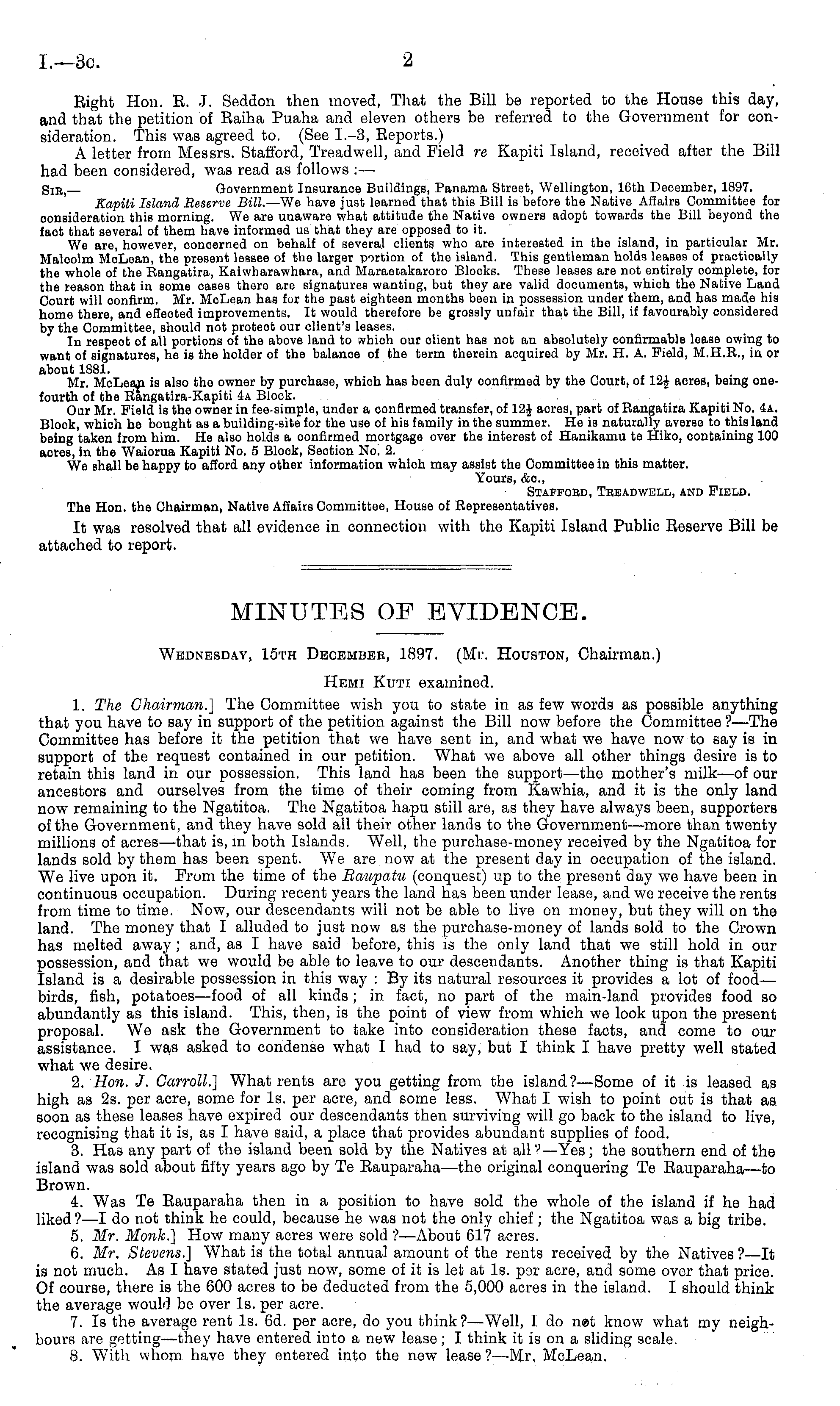 Wednesday, 15th December, 1897. (Mr. Houston, Chairman.) Hemi Kuti examined. 1. The Chairman.] The Committee wish you to state in as few words as possible anything that you have to say in support of the petition against the Bill now before the Committee?— The Committee has before it the petition that we have sent in, and what we have now to say is in support of the request contained in our petition. What we above all other things desire is to retain this land in our possession. This land has been the support—the mother's milk —of our ancestors and ourselves from the time of their coming from Kawhia, and it is the only land now remaining to the Ngatitoa. The Ngatitoa hapu still are, as they have always been, supporters of the Government, and they have sold all their other lands to the Government—more than twenty millions of acres—that is, in both Islands. Well, the purchase-money received by the Ngatitoa for lands sold by them has been spent. We are now at the present day in occupation of the island. We live upon it. From the time of the Baitpalu (conquest) up to the present day we have been in continuous occupation. During recent years the land has been under lease, and we receive the rents from time to time. Now, our descendants will not be able to live on money, but they will on the land. The money that I alluded to just now as the purchase-money of lands sold to the Crown has melted away ; and, as I have said before, this is the only land that we still hold in our possession, and that we would be able to leave to our descendants. Another thing is that Kapiti Island is a desirable possession in this way : By its natural resources it provides a lot of food— birds, fish, potatoes —food of all kinds ; in fact, no part of the main-land provides food so abundantly as this island. This, then, is the point of view from which we look upon the present proposal. We ask the Government to take into consideration these facts, and come to our assistance. I was asked to condense what I had to say, but I think I have pretty well stated what we desire. 2. Hon. J. Carroll.] What rents are you getting from the island?— Some of it is leased as high as 2s. per acre, some for Is. per acre, and some less. What I wish to point out is that as soon as these leases have expired our descendants then surviving will go back to the island to live, recognising that it is, as I have said, a place that provides abundant supplies of food. 3. Has any part of the island been sold by the Natives at all'—Yes; the southern end of the island was sold about fifty years ago by Te Eauparaha—the original conquering Te Eauparaha—to Brown. 4. Was Te Eauparaha then in a position to have sold the whole of the island if he had liked? —I do not think he could, because he was not the only chief; the Ngatitoa was a big tribe. 5. Mr. Monk.] How many acres were sold ? —About 617 acres. 6. Mr. Stevens.] What is the total annual amount of the rents received by the Natives ?—lt is not much. As I have stated just now, some of it is let at Is. per acre, and some over that price. Of course, there is the 600 acres to be deducted from the 5,000 acres in the island. I should think the average would be over Is. per acre. 7. Is the average rent Is. 6d. per acre, do you think?— Well, I do net know what my neighbours are getting—they have entered into a new lease; I think it is on a sliding scale. 8. With whom, have they entered into the new lease?— Mr. McLean.