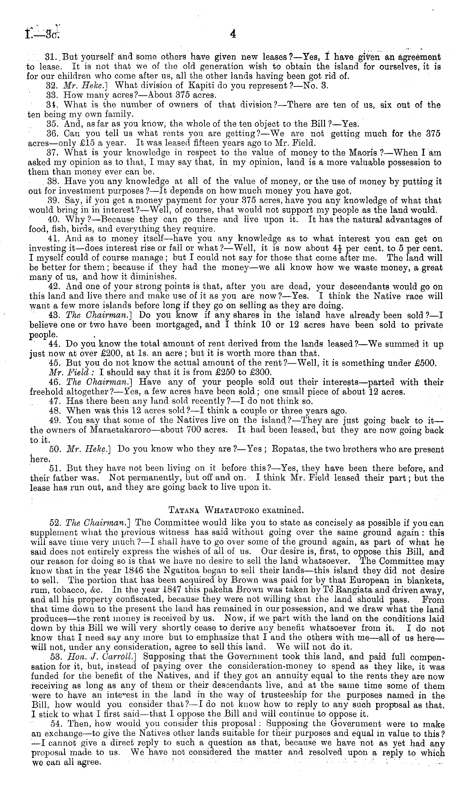 31..8ut yourself and Some others have given new leases?— Yes, I have given an agreement to lease. It is not that we of the old generation wish to obtain the island for ourselves, it is for our children who come after us, all the other lands having been got rid of. 32. Mr. Heke.] What division of Kapiti do you represent ? —No. 3. 33. How many acres? —About 375 acres. 31. What is the number of owners of that division?—-There are ten of us, six out of the ten being my own family. 35. And, as far as you know, the whole of the ten object to the Bill ?—Yes. 36. Can you tell us what rents you are getting?—We are not getting much for the 375 acres —only £15 a year. It was leased fifteen years ago to Mr. Field. 37. What is your knowledge in respect to tho value of money to the Maoris ?—When I am asked my opinion as to that, I may say that, in my opinion, land is a more valuable possession to them than money ever can be. 38. Have you any knowledge at all of the value of money, or the use of money by putting it out for investment purposes ?—lt depends on how much money you have got. 39. Say, if you get a money payment for your 375 acres, have you any knowledge of what that would bring in in interest?—-Well, of course, that would not support my people as the land would. 40. Why ? —Because they can go there and live upon it. It has the natural advantages of food, fish, birds, and everything they require. 41. And as to money itself—have you any knowledge as to what interest you can get on investing it—does interest rise or fall or what ?—Well, it is now about 4-J per cent, to 5 per cent. I myself could of course manage ; but I could not say for those that come after me. The land will be better for them ; because if they had the money—we all know how we waste money, a great many of us, and how it diminishes. 42. And one of your strong points is that, after you are dead, your descendants would go on this land and live there and make use of it as you are now?— Yes. I think the Native race will want a few more islands before long if they go on selling as they are doing. 43. The Chairman.] Do you know if any shares in the island have already been sold ? —I believe one or two have been mortgaged, and I think 10 or 12 acres have been sold to private people. 44. Do you know the total amount of rent derived from the lands leased? —We summed it up just now at over £200, at Is. an acre ; but it is worth more than that. 45. But you do not know the actual amount of the rent?— Well, it is something under £500. Mr. Field : I should say that it is from £250 to £300. 46. The Chairman.] Have any of your people sold out their interests—parted with their freehold altogether?— Yes, a few acres have been sold; one small piece of about 12 acres. 47. Has there been any land sold recently?—l do not think so. 48. When was this 12 acres sold?—I think a couple or three years ago. 49. You say that some of the Natives live on the island?— They are just going back to it— the owners of Maraetakaroro—about 700 acres. It had been leased, but they are now going back to it. 50. Mr. Heke.] Do you know who they are ?—Yes ; Eopatas, the two brothers who are present here. 51. But they have not been living on it before this?— Yes, they have been there before, and their father was. Not permanently, but off and on. I think Mr. Field leased their part; but the lease has run out, and they are going back to live upon it. Tatana Whataupoko examined. 52. The Chairman.] The Committee would like you to state as concisely as possible if you can supplement what the previous witness has said without going over the same ground again : this will save time very much ?—I shall have to go over some of the ground again, as part of what he said does not entirely express the wishes of all of us. Our desire is, first, to oppose this Bill, and our reason for doing so is that we have no desire to sell the land whatsoever. The Committee may know that in the year 1846 the Ngatitoa began to sell their lands—this island they did not desire to sell. The portion that has been acquired by Brown was paid for by that European in blankets, rum, tobacco, &c. In the year 1847 this pakeha Brown was taken by Te Eangiata and driven away, and all his property confiscated, because they were not willing that the land should pass. From that time down to the present the land has remained in our possession, and we draw what the land produces—the rent money is received by us. Now, if we part with the land on the conditions laid down by this Bill we will very shortly cease to derive any benefit whatsoever from it. Ido not know that I need say any more but to emphasize that I and the others with me—all of us here— will not, under any consideration, agree to sell this land. We will not do it. 53. Hon. J. Carroll.] Supposing that the Government took this land, and paid full compensation for it, but, instead of paying over the consideration-money to spend as they like, it was funded for the benefit of the Natives, and if they got an annuity equal to the rents they are now receiving as long as any of them or their descendants live, and at the same time some of them were to have an interest in the land in the way of trusteeship for the purposes named in the Bill, how would you consider that?—l do not know how to reply to any such proposal as that. I stick to what I first said —that I oppose the Bill and will continue to oppose it. 54. Then, how would you consider this proposal : Supposing the Government were to make an exchange—to give the Natives other lands suitable for their purposes and equal m value to this? —I cannot give a direct reply to such a question as that, because we have not as yet had any proposal made to us. We have not considered the matter and resolved upon a reply to which we can all agree.