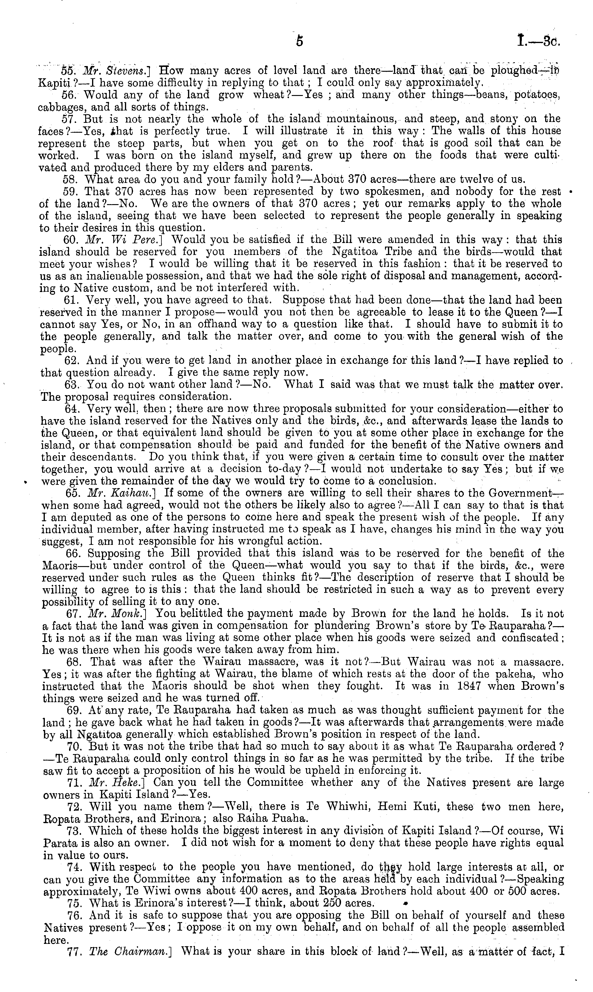 55. Mr. Stevens.] How many acres of level land are there—land that can be Kapiti ?—I have some difficulty in replying to that ; I could only say approximately. 56. Would any of the land grow wheat?— Yes ; and many other things—beans, potatoes, cabbages, and all sorts of things. 57. But is not nearly the whole of the island mountainous, and steep, and stony on the faces?— Yes, that is perfectly true. I will illustrate it in this way: The walls of this house represent the steep parts, but when you get on to the roof that is good soil that can be worked. I was born on the island myself, and grew up there on the foods that were cultivated and produced there by my elders and parents. 58. What area do you and your family hold ?—About 370 acres—there are twelve of us. 59. That 370 acres has now been represented by two spokesmen, and nobody for the rest of the land ? —No. We are the owners of that 370 acres ; yet our remarks apply to the whole of the island, seeing that we have been selected to represent the people generally in speaking to their desires in this question. 60. Mr. Wi Pere.] Would you be satisfied if the Bill were amended in this way : that this island should be reserved for you members of the Ngatitoa Tribe and the birds—would that meet your wishes ? I would be willing that it be reserved in this fashion : that it be reserved to us as an inalienable possession, and that we had the sole right of disposal and management, according to Native custom, and be not interfered with. 61. Very well, you have agreed to that. Suppose that had been done—that the land had been reserved in the manner I propose—would you not then be agreeable to lease it to the Queen? —I cannot say Yes, or No, in an offhand way to a question like that. I should have to submit it to the people generally, and talk the matter over, and come to you with the general wish of the people. 62. And if you were to get land in another place in exchange for this land?—l have replied to that question already. I give the same reply now. 63. You do not want other land?— No. What I said was that we must talk the matter over. The proposal requires consideration. 64. Very well, then ; there are now three proposals submitted for your consideration—either to have the island reserved for the Natives only and the birds, &c, and afterwards lease the lands to the Queen, or that equivalent land should be given to you at some other place in exchange for the island, or that compensation should be paid and funded for the benefit of the Native owners and their descendants. Do you think that, if you were given a certain time to consult over the matter together, you would arrive at a decision to-day ?—I would not undertake to say Yes; but if we were given the remainder of the day we would try to come to a conclusion. 65. Mr. Kaihau.] If some of the owners are willing to sell their shares to the Government— when some had agreed, would not the others be likely also to agree ?—All I can say to that is that lam deputed as one of the persons to come here and speak the present wish of the people. If any individual member, after having instructed me to speak as I have, changes his mind in the way you suggest, I am not responsible for his wrongful action. 66. Supposing the Bill provided that this island was to be reserved for the benefit of the Maoris—but under control of the Queen —what would you say to that if the birds, &c, were reserved under such rules as the Queen thinks fit ?—The description of reserve that I should be willing to agree to is this : that the land should be restricted in such a way as to prevent every possibility of selling it to any one. 67. Mr. Monk.] You belittled the payment made by Brown for the land he holds. Is it not a fact that the land was given in compensation for plundering Brown's store by Te- Eauparaha ?— It is not as if the man was living at some other place when his goods were seized and confiscated; he was there when his goods were taken away from him. 68. That was after the Wairau massacre, was it not?— But Wairau was not a massacre. Yes; it was after the fighting at Wairau, the blame of which rests at the door of the pakeha, who instructed that the Maoris should be shot when they fought. It was in 1847 when Brown's things were seized and he was turned off. 69. At any rate, Te Eauparaha had taken as much as was thought sufficient payment for the land ; he gave back what he had taken in goods?—-It was afterwards that .arrangementswere made by all Ngatitoa generally which established Brown's position in respect of the land. 70. But it was not the tribe that had so much to say about it as what Te Eauparaha ordered ? —Te Eauparaha could only control things in so far as he was permitted by the tribe. If the tribe saw fit to accept a proposition of his he would be upheld in enforcing it. 71. Mr. Heke.] Can you tell the Committee whether any of the Natives present are large owners in Kapiti Island ? —Yes. 72. Will you name them ?—Well, there is Te Whiwhi, Hemi Kuti, these two men here, Eopata Brothers, and Erinora; also Eaiha Puaha. 73. Which of these holds the biggest interest in any division of Kapiti Island ?—Of course, Wi Parata is also an owner. I did not wish for a moment to deny that these people have rights equal in value to ours. 74. With respect to the people you have mentioned, do they hold large interests at all, or can you give the Committee any information as to the areas held by each individual ?—Speaking approximately, Te Wiwi owns about 400 acres, and Eopata Brothers hold about 400 or 500 acres. 75. What is Erinora's interest?—l think, about 250 acres. • 76. And it is safe to suppose that you are opposing the Bill on behalf of yourself and these Natives present ?—Yes; I oppose it on my own behalf, and on behalf of all the people assembled here. 77. The Chairman.] What is your share in this block of land?— Well, as a matter of -fact, I
