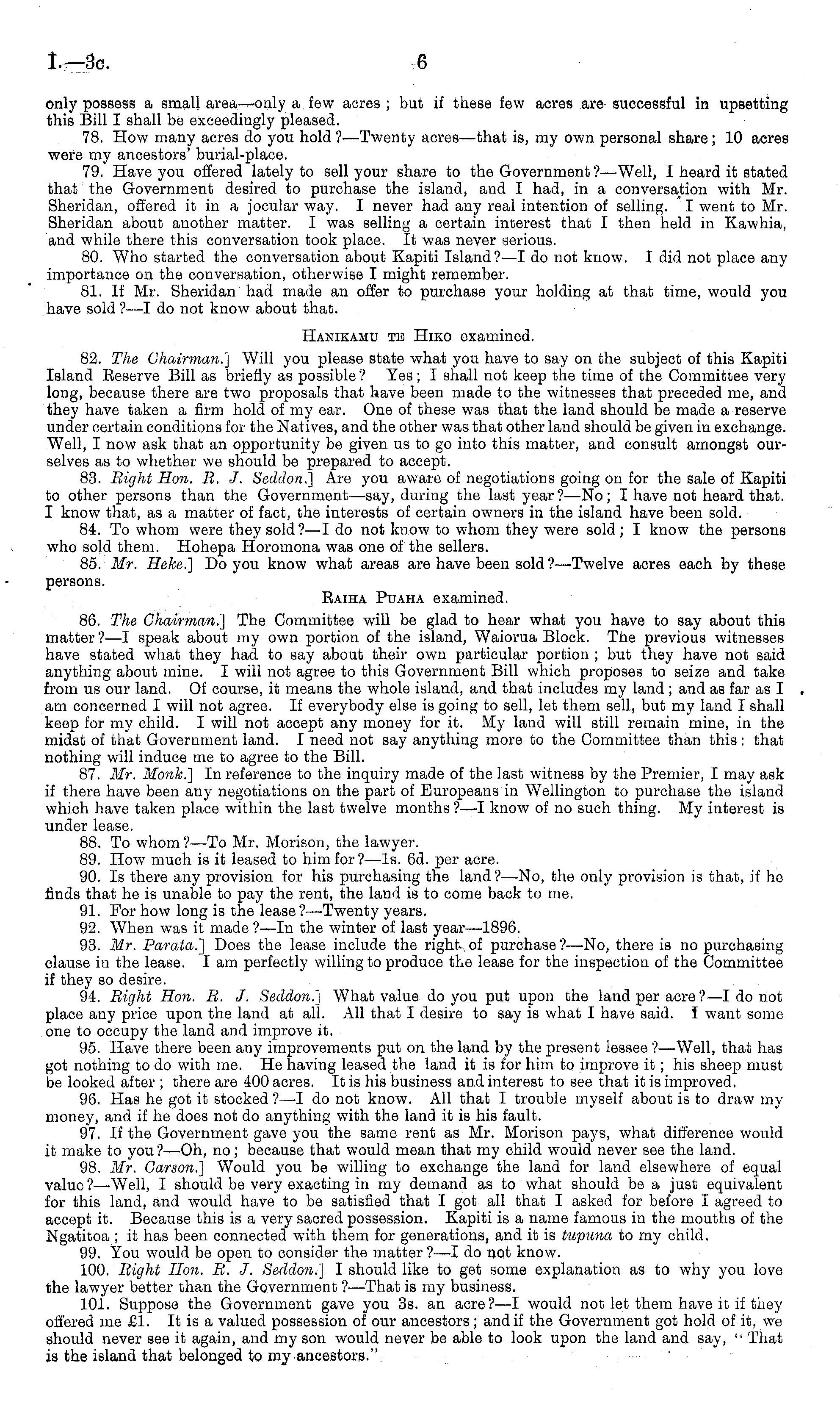 only possess a small area—only a few acres; but if these few acres are successful in upsetting this Bill I shall be exceedingly pleased. 78. How many acres do you hold ?—Twenty acres—that is, my own personal share; 10 acres were my ancestors' burial-place. 79. Have you offered lately to sell your share to the Government ?—Well, I heard it stated that the Government desired to purchase the island, and I had, in a conversation with Mr. Sheridan, offered it in a jocular way. I never had any real intention of selling. I went to Mr. Sheridan about another matter. I was selling a certain interest that I then held in Kawhia, and while there this conversation took place. It was never serious. 80. Who started the conversation about Kapiti Island?—l do not know. I did not place any importance on the conversation, otherwise I might remember. 81. If Mr. Sheridan had made an offer to purchase your holding at that time, would you have sold ?—I do not know about that. Hanikamu te Hiko examined. 82. The Chairman.] Will you please state what you have to say on the subject of this Kapiti Island Eeserve Bill as briefly as possible ? Yes ; I shall not keep the time of the Committee very long, because there are two proposals that have been made to the witnesses that preceded me, and they have taken a firm hold of my ear. One of these was that the land should be made a reserve under certain conditions for the Natives, and the other was that other land should be given in exchange. Well, I now ask that an opportunity be given us to go into this matter, and consult amongst ourselves as to whether we should be prepared to accept. 83. Bight Hon. B. J. Seddon.] Are you aware of negotiations going on for the sale of Kapiti to other persons than the Government —say, during the last year? —No; I have not heard that. I know that, as a matter of fact, the interests of certain owners in the island have been sold. 84. To whom were they sold ?—I do not know to whom they were sold ; I know the persons who sold them. Hohepa Horomona was one of the sellers. 85. Mr. Heke.] Do you know what areas are have been sold ?—-Twelve acres each by these persons. Eaiha Puaha examined. 86. The Chairman.] The Committee will be glad to hear what you have to say about this matter ?—I speak about my own portion of the island, Waiorua Block. The previous witnesses have stated what they had to say about their own particular portion ; but they have not said anything about mine. I will not agree to this Government Bill which proposes to seize and take from us our land. Of course, it means the whole island, and that includes my land ; and as far as I am concerned I will not agree. If everybody else is going to sell, let them sell, but my land I shall keep for my child. I will not accept any money for it. My land will still remain mine, in the midst of that Government land. I need not say anything more to the Committee than this: that nothing will induce me to agree to the Bill. 87. Mr. Monk.] In reference to the inquiry made of the last witness by the Premier, I may ask if there have been any negotiations on the part of Europeans in Wellington to purchase the island which have taken place within the last twelve months ?—I know of no such thing. My interest is under lease. 88. To whom?—To Mr. Morison, the lawyer. 89. How much is it leased to him for?—ls. 6d. per acre. 90. Is there any provision for his purchasing the land? —No, the only provision is that, if he finds that he is unable to pay the rent, the land is to come back to me. 91. For how long is the lease?— Twenty years. 92. When was it made ? —ln the winter of last year—lß96. 93. Mr. Parata.] Does the lease include the right., of purchase?—No, there is no purchasing clause in the lease. lam perfectly willing to produce the lease for the inspection of the Committee if they so desire. 94. Bight Hon. B. J. Seddon.] What value do you put upon the land per acre?—l do not place any price upon the land at all. All that I desire to say is what I have said. I want some one to occupy the land and improve it. 95. Have there been any improvements put on the land by the present lessee ?—Well, that has got nothing to do with me. He having leased the land it is for him to improve it ; his sheep must be looked after ; there are 400 acres. It is his business and interest to see that it is improved. 96. Has he got it stocked ?—I do not know. All that I trouble myself about is to draw my money, and if he does not do anything with the land it is his fault. 97. If the Government gave you the same rent as Mr. Morison pays, what difference would it make to you?—Oh, no; because that would mean that my child would never see the land. 98. Mr. Carson.] Would you be willing to exchange the land for land elsewhere of equal value?—-Well, I should be very exacting in my demand as to what should be a just equivalent for this land, and would have to be satisfied that I got all that I asked for before I agreed to accept it. Because this is a very sacred possession. Kapiti is a name famous in the mouths of the Ngatitoa ; it has been connected with them for generations, and it is tupuna to my child. 99. You would be open to consider the matter ?—I do not know. 100. Bight Hon. B. J. Seddon.] I should like to get some explanation as to why you love the lawyer better than the Government ?—That is my business. 101. Suppose the Government gave you 3s. an acre?—l would not let them have it if they offered me £1. It is a valued possession of our ancestors; and if the Government got hold of it, we should never see it again, and my son would never be able to look upon the land and say, " That is the island that belonged to my ancestors."