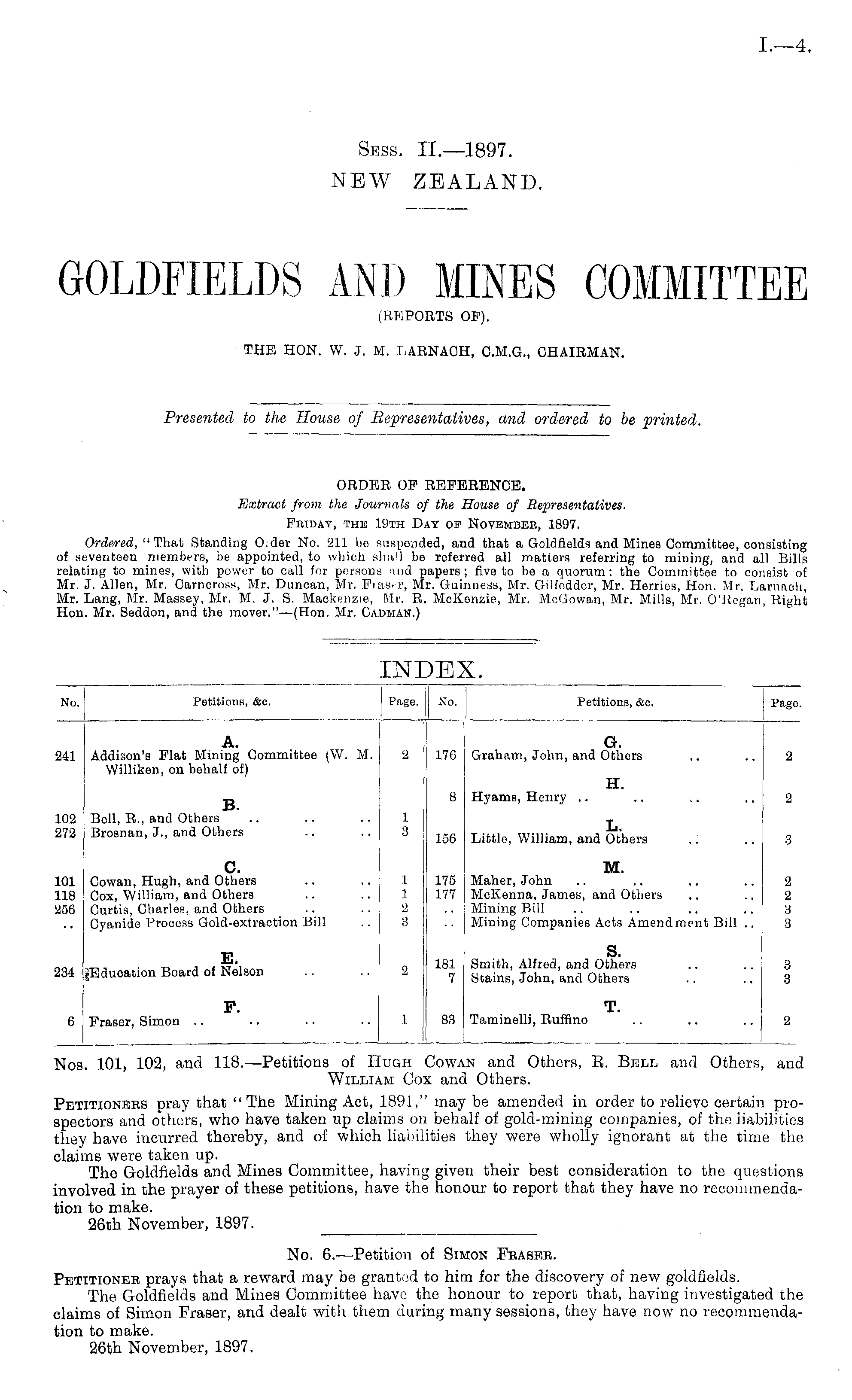 ORDER OF REFERENCE. Extract from the Journals of the House of Representatives. Friday, the 19th Day of November, 1897. Ordered, "That Standing O;der No. 211 bo suspended, and that a Goldfields and Minos Committee, consisting of seventeen members, be appointed, to which shall be referred all matters referring to mining, and all Bills relating to mines, with power to call for persons and papers; five to be a quorum: the Committee to consist of Mr. J. Allen, Mr. Carncross, Mr. Duncan, Mr. Mr. Guinness, Mr. Gil fodder, Mr. Herries, Hon. Mr. Larnaoh, Mr. Lang, Mr. Massey, Mr. M. J. S. Mackenzie, Mr, R. McKenzie, Mr. McGowan, Mr. Mills, Mr. O'Regan, Right Hon. Mr. Seddon, and the mover."—(Hon. Mr. Cadman.)