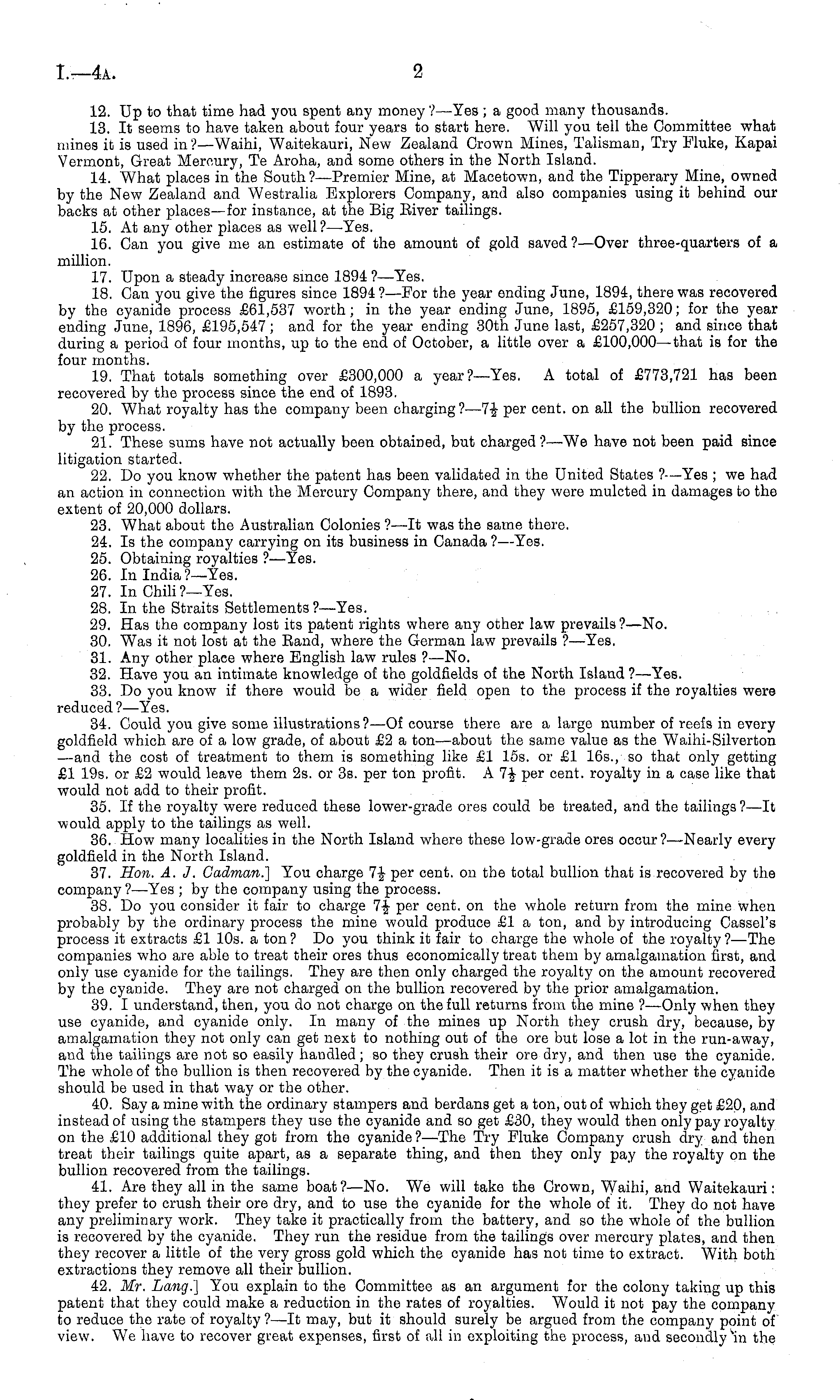 12. Up to that time had you spent any money ?—Yes ; a good many thousands. 13. It seems to have taken about four years to start here. Will you tell the Committee what mines it is used in? —Waihi, Waitekauri, New Zealand Crown Mines, Talisman, Try Fluke, Kapai Vermont, Great Mercury, Te Aroha, and some others in the North Island. 14. What places in the South? —Premier Mine, at Macetown, and the Tipperary Mine, owned by the New Zealand and Westralia Explorers Company, and also companies using it behind our backs at other places —for instance, at the Big Eiver tailings. 15. At any other places as well?— Yes. 16. Can you give me an estimate of the amount of gold saved ?—Over three-quarters of a million. 17. Upon a steady increase since 1894 ?—Yes. 18. Can you give the figures since 1894 ?—For the year ending June, 1894, there was recovered by the cyanide process £61,537 worth; in the year ending June, 1895, £159,320; for the year ending June, 1896, £195,547 ; and for the year ending 30th June last, £257,320 ; and since that during a period of four months, up to the end of October, a little over a £100,000 —that is for the four months. 19. That totals something over £300,000 a year?— Yes. A total of £773,721 has been recovered by the process since the end of 1893. 20. What royalty has the company been charging?—7-J- per cent, on all the bullion recovered by the process. 21. These sums have not actually been obtained, but charged?—We have not been paid since litigation started. 22. Do you know whether the patent has been validated in the United States ?—Yes ; we had an action in connection with the Mercury Company there, and they were mulcted in damages to the extent of 20,000 dollars. 23. What about the Australian Colonies ? —lt was the same there. 24. Is the company carrying on its business in Canada ?—Yes. 25. Obtaining royalties ?—Yes. 26. In India ?—Yes. 27. In Chili?—Yes. 28. In the Straits Settlements ?—Yes. 29. Has the company lost its patent rights where any other law prevails ?—No. 30. Was it not lost at the Band, where the German law prevails ?—Yes. 31. Any other place where English law rules ? —No. 32. Have you an intimate knowledge of the goldfields of the North Island ?—Yes. 33. Do you know if thore would be a wider field open to the process if the royalties were reduced ?—Yes. 34. Could you give some illustrations ?—Of course there are a large number of reefs in every goldfield which are of a low grade, of about £2 a ton—about the same value as the Waihi-Silverton —and the cost of treatment to them is something like £1 15s. or £1 165., so that only getting £1 19s. or £2 would leave them 2s. or 3s. per ton profit. A 7£ per cent, royalty in a case like that would not add to their profit. 35. If the royalty were reduced these lower-grade ores could be treated, and the tailings?—lt would apply to the tailings as well. 36. How many localities in the North Island where these low-grade ores occur? —Nearly every goldfield in the North Island. 37. Hon. A. J. Gadman.] You charge 7-| per cent, on the total bullion that is recovered by the company?— Yes ; by the company using the process. 38. Do you consider it fair to charge 1\ per cent, on the whole return from the mine when probably by the ordinary process the mine would produce £1 a ton, and by introducing Cassel's process it extracts £1 10s. a ton ? Do you think it fair to charge the whole of the royalty ? —The companies who are able to treat their ores thus economically treat them by amalgamation first, and only use cyanide for the tailings. They are then only charged the royalty on the amount recovered by the cyanide. They are not charged on the bullion recovered by the prior amalgamation. 39. I understand, then, you do not charge on the full returns from the mine ?—Only when they use cyanide, and cyanide only. In many of the mines up North they crush dry, because, by amalgamation they not only can get next to nothing out of the ore but lose a lot in the run-away, and the tailings are not so easily handled; so they crush their ore dry, and then use the cyanide. The whole of the bullion is then recovered by the cyanide. Then it is a matter whether the cyanido should be used in that way or the other. 40. Say a mine with the ordinary stampers and berdans get a ton, out of which they get £20, and instead of using the stampers they use the cyanide and so get £30, they would then only pay royalty on the £10 additional they got from the cyanide ?—The Try Fluke Company crush dry and then treat their tailings quite apart, as a separate thing, and then they only pay the royalty on the bullion recovered from the tailings. 41. Are they all in the same boat?— No. We will take the Crown, Waihi, and Waitekauri: they prefer to crush their ore dry, and to use the cyanide for the whole of it. They do not have any preliminary work. They take it practically from the battery, and so the whole of the bullion is recovered by the cyanide. They run the residue from the tailings over mercury plates, and then they recover a little of the very gross gold which the cyanide has not time to extract. With both extractions they remove all their bullion. 42. Mr. Lang.] You explain to the Committee as an argument for the colony taking up this patent that they could make a reduction in the rates of royalties. Would it not pay the company to reduce the rate of royalty?—lt may, but it should surely be argued from the company point of view. We have to recover great expenses, first of all in exploiting the process, aud secondly In the