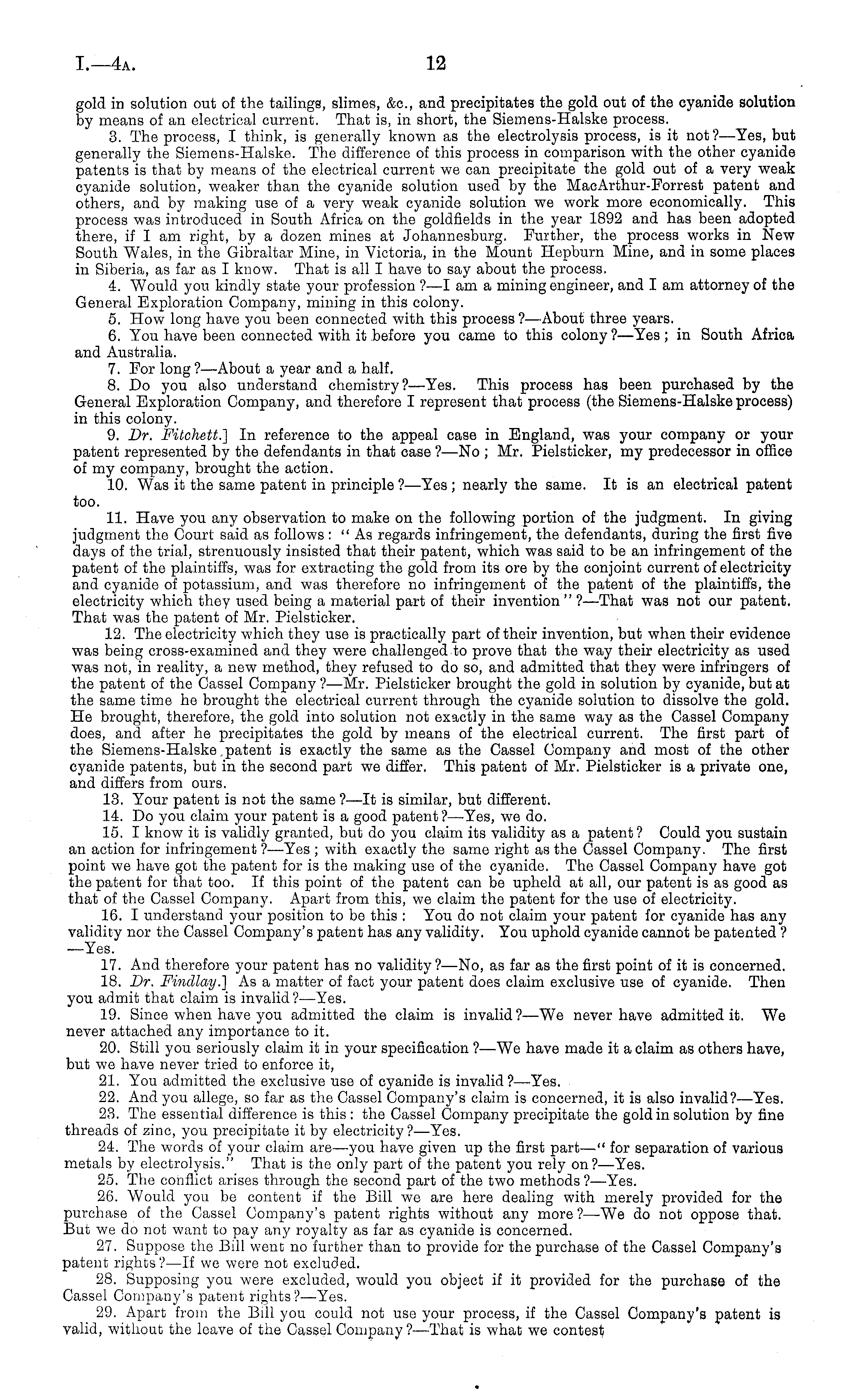 gold in solution out of the tailings, slimes, &c, and precipitates the gold out of the cyanide solution by means of an electrical current. That is, in short, the Siemens-Halske process. 3. The process, I think, is generally known as the electrolysis process, is it not?— Yes, but generally the Siemens-Halske. The difference of this process in comparison with the other cyanide patents is that by means of the electrical current we can precipitate the gold out of a very weak cyanide solution, weaker than the cyanide solution used by the MacArthur-Porrest patent and others, and by making use of a very weak cyanide solution wo work more economically. This process was introduced in South Africa on the goldfields in the year 1892 and has been adopted there, if I am right, by a dozen mines at Johannesburg. Further, the process works in New South Wales, in the Gibraltar Mine, in Victoria, in the Mount Hepburn Mine, and in some places in Siberia, as far as I know. That is all I have to say about the process. 4. Would you kindly state your profession ? —I am a mining engineer, and lam attorney of the General Exploration Company, mining in this colony. 5. How long have you been connected with this process?— About three years. 6. You have been connected with it .before you came to this colony ?—Yes ;in South Africa and Australia. 7. For long ?—About a year and a half. 8. Do you also understand chemistry ?—Yes. This process has been purchased by the General Exploration Company, and therefore I represent that process (the Siemens-Halske process) in this colony. 9. Dr. Fitchett.] In reference to the appeal case in England, was your company or your patent represented by the defendants in that case ? —No ; Mr. Pielsticker, my predecessor in office of my company, brought the action. 10. Was it the same patent in principle ?—Yes; nearly the same. It is an electrical patent too. 11. Have you any observation to make on the following portion of the judgment. In giving judgment the Court said as follows : " As regards infringement, the defendants, during the first five days of the trial, strenuously insisted that their patent, which was said to be an infringement of the patent of the plaintiffs, was for extracting the gold from its ore by the conjoint current of electricity and cyanide of potassium, and was therefore no infringement of tho patent of the plaintiffs, the electricity which they used being a material part of their invention " ?—That was not our patent. That was the patent of Mr. Pielsticker. 12. The electricity which they use is practically part of their invention, but when their evidence was being cross-examined and they were challenged to prove that the way their electricity as used was not, in reality, a new method, they refused to do so, and admitted that they were infringers of the patent of the Cassel Company ?—Mr. Pielsticker brought the gold in solution by cyanide, but at the same time he brought the electrical current through the cyanide solution to dissolve the gold. He brought, therefore, the gold into solution not exactly in the same way as the Cassel Company does, and after he precipitates tho gold by means of the electrical current. The first part of the Siemens-Halske patent is exactly the same as the Cassel Company and most of the other cyanide patents, but in the second part we differ. This patent of Mr. Pielsticker is a private one, and differs from ours. 13. Your patent is not the same ?—lt is similar, but different. 14. Do you claim your patent is a good patent? —Yes, we do. 15. I know it is validly granted, but do you claim its validity as a patent? Could you sustain an action for infringement ?—Yes ; with exactly the same right as tho Cassel Company. The first point we have got the patent for is the making use of the cyanide. The Cassel Company have got the patent for that too. If this point of the patent can be upheld at all, our patent is as good as that of the Cassel Company. Apart from this, we claim the patent for the use of electricity. 16. I understand your position to be this : You do not claim your patent for cyanide has any validity nor the Cassel Company's patent has any validity. You uphold cyanide cannot be patented ? ■—Yes. 17. And therefore your patent has no validity?—No, as far as the first point of it is concerned. 18. Dr. Findlay.] As a matter of fact your patent does claim exclusive use of cyanide. Then you admit that claim is invalid?— Yes. 19. Since when have you admitted the claim is invalid? —We never have admitted it. We never attached any importance to it. 20. Still you seriously claim it in your specification ?—We have made it a claim as others have, but we have never tried to enforce it, 21. You admitted the exclusive use of cyanide is invalid?— Yes. 22. And you allege, so far as the Cassel Company's claim is concerned, it is also invalid?— Yes. 23. The essential difference is this : the Cassel Company precipitate the gold in solution by fine threads of zinc, you precipitate it by electricity?— Yes. 24. The words of your claim are—you have given up the first part—" for separation of various metals by electrolysis." That is the only part of the patent you rely on?— Yes. 25. The conflict arises through the second part of the two methods ?—Yes. 26. Would you be content if the Bill we are here dealing with merely provided for the purchase of tho Cassel Company's patent rights without any more?—We do not oppose that. But we do not want to pay any royalty as far as cyanide is concerned. 27. Suppose the Bill went no further than to provide for the purchase of the Cassel Company's patent rights?—lf we were not excluded. 28. Supposing you were excluded, would you object if it provided for the purchase of the Cassel Company's patent rights?— Yes. 29. Apart from the Bill you could not uso your process, if the Cassel Company's patent is valid, without the leave of the Cassel Company ?—That is what we co