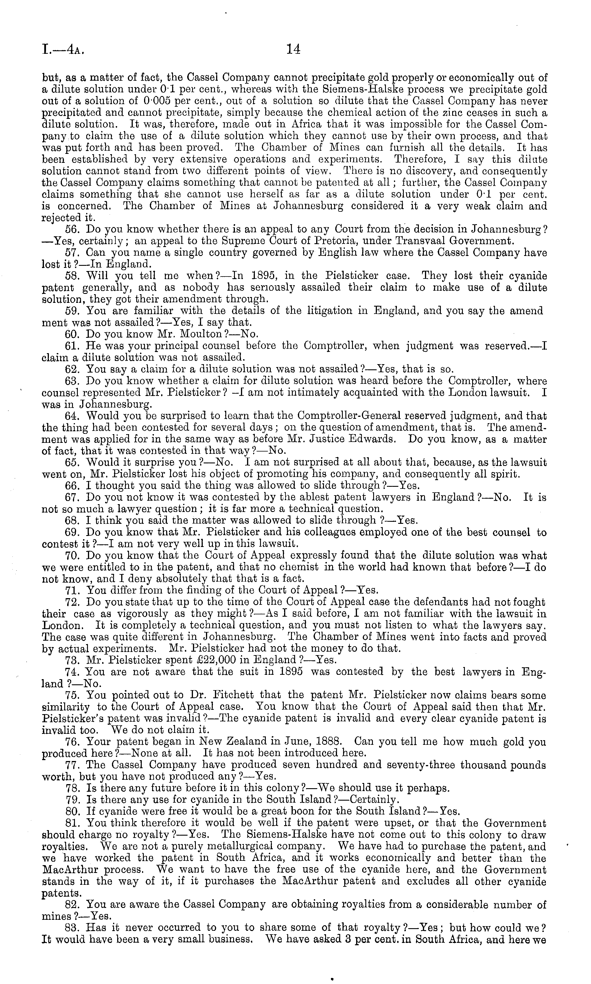 but, as a matter of fact, the Cassel Company cannot precipitate gold properly or economically out of a dilute solution under 01 per cent., whereas with the Siemens-Halske process we precipitate gold out of a solution of 0-005 per cent., out of a solution so dilute that the Cassel Company has never precipitated and cannot precipitate, simply because the chemical action of the zinc ceases in such a dilute solution. It was, therefore, made out in Africa that it was impossible for the Cassel Company to claim the use of a dilute solution which they cannot use by their own process, and that was put forth and has been proved. The Chamber of Mines can furnish all the details. It has been established by very extensive operations and experiments. Therefore, I say this dilate solution cannot stand from two different points of viow. There is no discovery, and consequently the Cassel Company claims something that cannot be patented at all; further, the Cassel Company claims something that she cannot use herself as far as a dilute solution under O'l per cent, is concerned. The Chamber of Mines at Johannesburg considered it a very weak claim and rejected it. 56. Do you know whether there is an appeal to any Court from the decision in Johannesburg ? —Yes, certainly; an appeal to the Supreme Court of Pretoria, under Transvaal Government. 57. Can you name a single country governed by English law where the Cassel Company have lost it ? —ln England. 58. Will you tell me when? —In 1895, in the Pielsticker case. They lost their cyanide patent generally, and as nobody has seriously assailed their claim to make use of a dilute solution, they got their amendment through. 59. You are familiar with the details of the litigation in England, and you say the amend ment was not assailed? —Yes, I say that. 60. Do you know Mr. Moulton ?—No. 61. He was your principal counsel before the Comptroller, when judgment was reserved.—l claim a dilute solution was not assailed. 62. You say a claim for a dilute solution was not assailed?— Yes, that is so. 63. Do you know whether a claim for dilute solution was heard before the Comptroller, where counsel represented Mr. Pielsticker? -I am not intimately acquainted with the London lawsuit. I was in Johannesburg. 64. Would you be surprised to learn that the Comptroller-General reserved judgment, and that the thing had been contested for several days ; on the question of amendment, that is. The amendment was applied for in the same way as before Mr. Justice Edwards. Do you know, as a matter of fact, that it was contested in that way ?—No. 65. Would it surprise you ? —No. I am not surprised at all about that, because, as the lawsuit went on, Mr. Pielsticker lost his object of promoting his company, and consequently all spirit. 66. I thought you said the thing was allowed to slide through?— Yes. 67. Do you not know it was contested by the ablest patent lawyers in England?— No. It is not so much a lawyer question; it is far more a technical question. 68. I think you said the matter was allowed to slide through ?—-Yes. 69. Do you know that Mr. Pielsticker and his colleagues employed one of the best counsel to contest it ?—I am not very well up in this lawsuit. 70. Do you know that the Court of Appeal expressly found that the dilute solution was what we were entitled to in the patent, and that no chemist in the world had known that before ?—I do not know, and I deny absolutely that that is a fact. 71. You differ from the finding of the Court of Appeal ?—Yes. 72. Do you state that up to the time of the Court of Appeal case the defendants had not fought their case as vigorously as they might ?—As I said before, I am not familiar with the lawsuit in London. It is completely a technical question, and you must not listen to what the lawyers say. The case was quite different in Johannesburg. The Chamber of Mines went into facts and proved by actual experiments. Mr. Pielsticker had not the money to do that. 73. Mr. Pielsticker spent £22,000 in England ?—Yes. 74. You are not aware that the suit in 1895 was contested by the best lawyers in England ?—No. 75. You pointed out to Dr. Fitchett that the patent Mr. Pielsticker now claims bears some similarity to the Court of Appeal case. You know that the Court of Appeal said then that Mr. Pielsticker's patent was invalid?— The cyanide patent is invalid and every clear cyanide patent is invalid too. We do not claim it. 76. Your patent began in New Zealand in June, 1888. Can you tell me how much gold you produced here ? —None at all. It has not boon introduced here. 77. The Cassel Company have produced seven hundred and seventy-three thousand pounds worth, but you have not produced any ?—Yes. 78. Is there any future before it in this colony?—We should use it perhaps. 79. Is there any use for cyanide in the South Island?— Certainly. 80. If cyanide were free it would be a great boon for the South Island?— Yes. 81. You think therefore it would be well if the patent were upset, or that the Government should charge no royalty ?—Yes. The Siemens-Halske have not come out to this colony to draw royalties. We are not a purely metallurgical company. We have had to purchase the patent, and we have worked the patent in South Africa, and it works economically and better than the Mac Arthur process. We want to have the free use of the cyanide here, and the Government stands in the way of it, if it purchases the Mac Arthur patent and excludes all other cyanide patents. 82. You are aware the Cassel Company are obtaining royalties from a considerable number of mines ?—Yes. 83. Has it never occurred to you to share some of that royalty ?—Yes; but how could we ? It would have been a very small business. We have asked 3 per cent, in South Africa, and here we