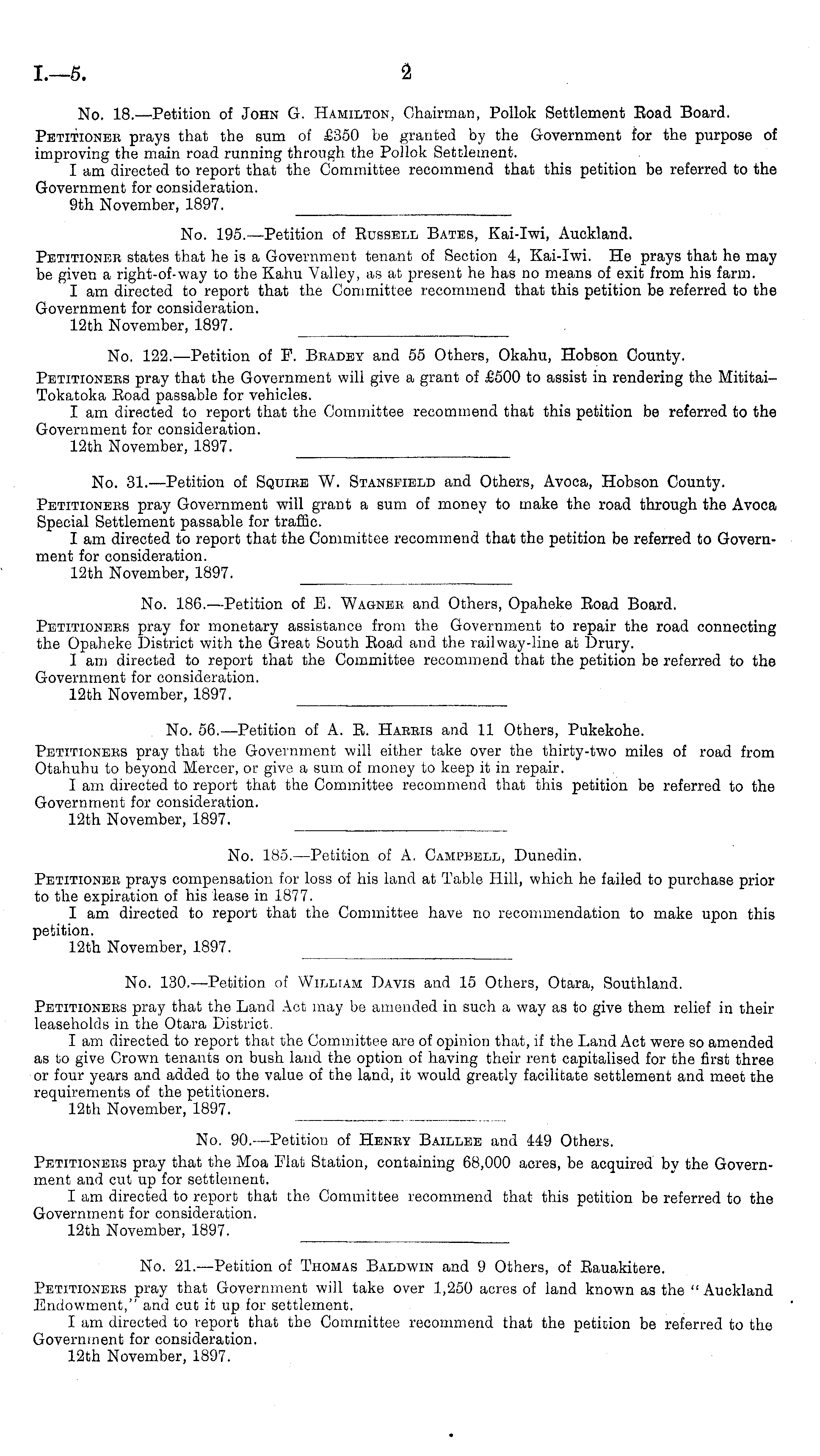 No. 31.—Petition of Squire W. Stansfibld and Others, Avoca, Hobson County. Petitioners pray Government will grant a sum of money to make the road through the Avoca Special Settlement passable for traffic. I am directed to report that the Committee recommend that the petition be referred to Government for consideration. 12th November, 1897.
