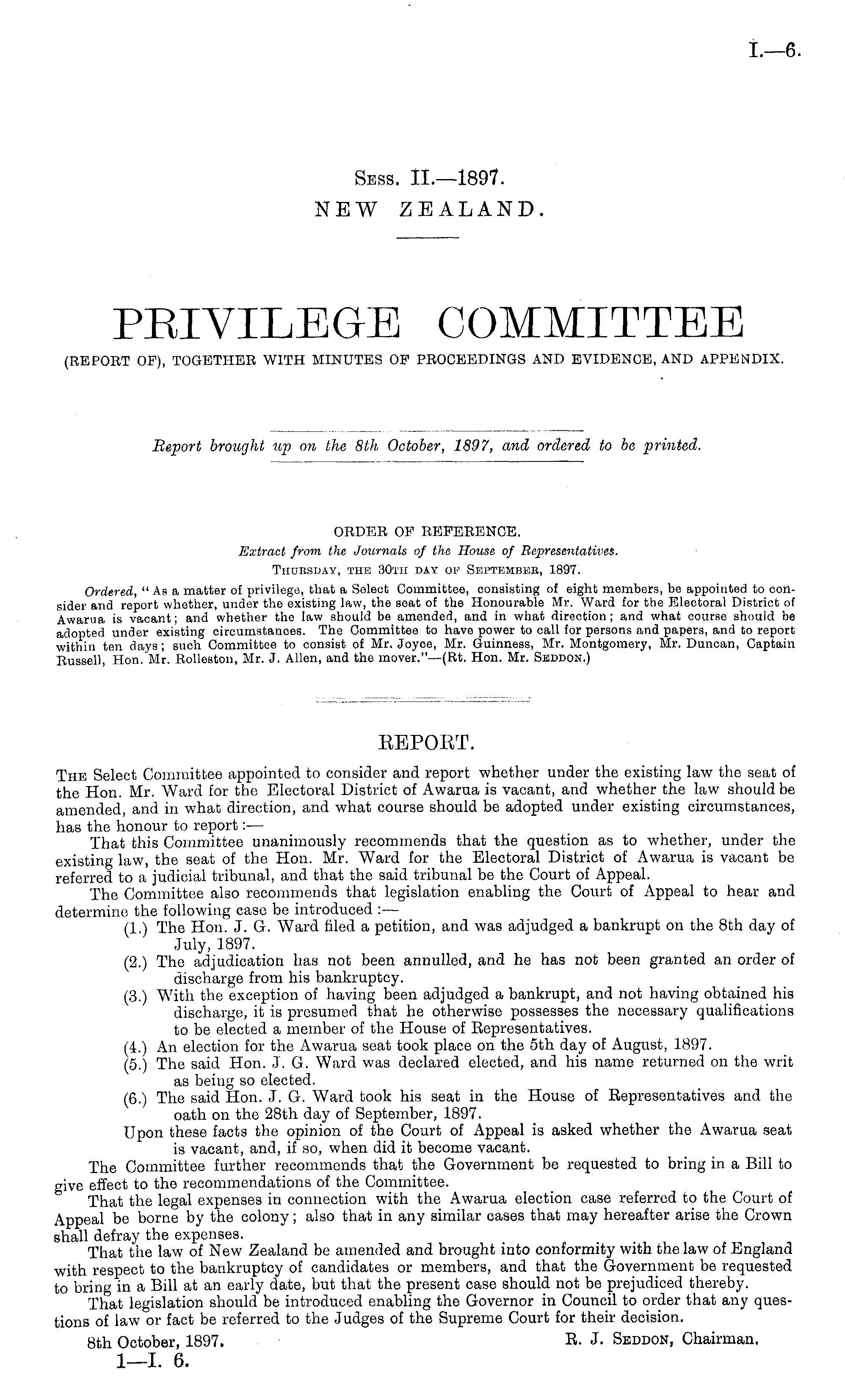 ORDER OP REFERENCE. Extract from the Journals of the House of Representatives. Thubsday, the 30th day of Septembeb, 1897. Ordered, "As a matter of privilege, that a Select Committee, consisting of eight members, be appointed to consider and report whether, under the existing law, the seat of the Honourable Mr. Ward for the Electoral District of Awarua is vacant; and whether the law should be amended, and in what direction; and what course should be adopted under existing circumstances. The Committee to have power to call for persons and papers, and to report within ten days; such Committee to consist of Mr. Joyoe, Mr. Guinness, Mr. Montgomery, Mr. Duncan, Captain Russell, Hon. Mr. Rolleston, Mr. J. Allen, and the mover."—(Rt. Hon. Mr. Seddon.)