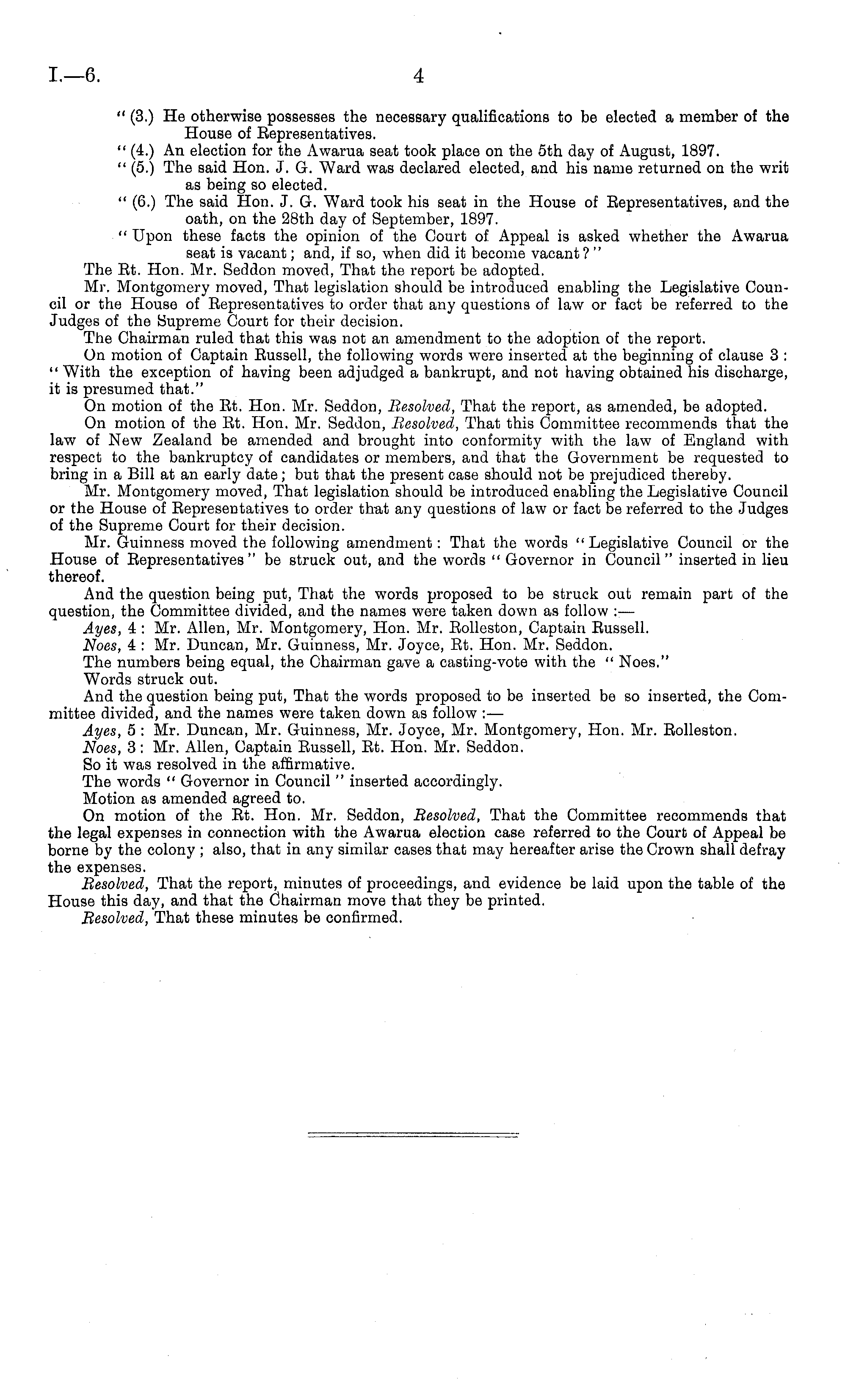" (3.) He otherwise possesses the necessary qualifications to be elected a member of the House of Representatives. " (4.) An election for the Awarua seat took place on the sth day of August, 1897. " (5.) The said Hon. J. G. Ward was declared elected, and his name returned on the writ as being so elected. " (6.) The said Hon. J. G. Ward took his seat in the House of Eepresentatives, and the oath, on the 28th day of September, 1897. " Upon these facts the opinion of the Court of Appeal is asked whether the Awarua seat is vacant; and, if so, when did it become vacant? " The Et. Hon. Mr. Seddon moved, That the report be adopted. Mr. Montgomery moved, That legislation should be introduced enabling the Legislative Council or the House of Representatives to order that any questions of law or fact be referred to the Judges of the Supreme Court for their decision. The Chairman ruled that this was not an amendment to the adoption of the report. On motion of Captain Russell, the following words were inserted at the beginning of clause 3 : " With the exception of having been adjudged a bankrupt, and not having obtained his discharge, it is presumed that." On motion of the Rt. Hon. Mr. Seddon, liesolved, That the report, as amended, be adopted. On motion of the Rt. Hon. Mr. Seddon, Besolved, That this Committee recommends that the law of New Zealand be amended and brought into conformity with the law of England with respect to the bankruptcy of candidates or members, and that the Government be requested to bring in a Bill at an early date; but that the present case should not be prejudiced thereby. Mr. Montgomery moved, That legislation should be introduced enabling the Legislative Council or the House of Representatives to order that any questions of law or fact be referred to the Judges of the Supreme Court for their decision. Mr. Guinness moved the following amendment : That the words "Legislative Council or the House of Representatives " be struck out, and the words " Governor in Council " inserted in lieu thereof. And the question being put, That the words proposed to be struck out remain part of the question, the Committee divided, and the names were taken down as follow : — Ayes, 4 : Mr. Allen, Mr. Montgomery, Hon. Mr. Rolleston, Captain Russell. Noes, 4 : Mr. Duncan, Mr. Guinness, Mr. Joyce, Rt. Hon. Mr. Seddon. The numbers being equal, the Chairman gave a casting-vote with the " Noes." Words struck out. And the question being put, That the words proposed to be inserted be so inserted, the Committee divided, and the names were taken down as follow :— Ayes, 5 : Mr. Duncan, Mr. Guinness, Mr. Joyce, Mr. Montgomery, Hon. Mr. Rolleston. Noes, 3: Mr. Allen, Captain Russell, Rt. Hon. Mr. Seddon. So it was resolved in the affirmative. The words " Governor in Council " inserted accordingly. Motion as amended agreed to. On motion of the Rt. Hon. Mr. Seddon, Resolved, That the Committee recommends that the legal expenses in connection with the Awarua election case referred to the Court of Appeal be borne by the colony ; also, that in any similar cases that may hereafter arise the Crown shall defray the expenses. Besolved, That the report, minutes of proceedings, and evidence be laid upon the table of the House this day, and that the Chairman move that they be printed. Besolved, That these minutes be confirmed.