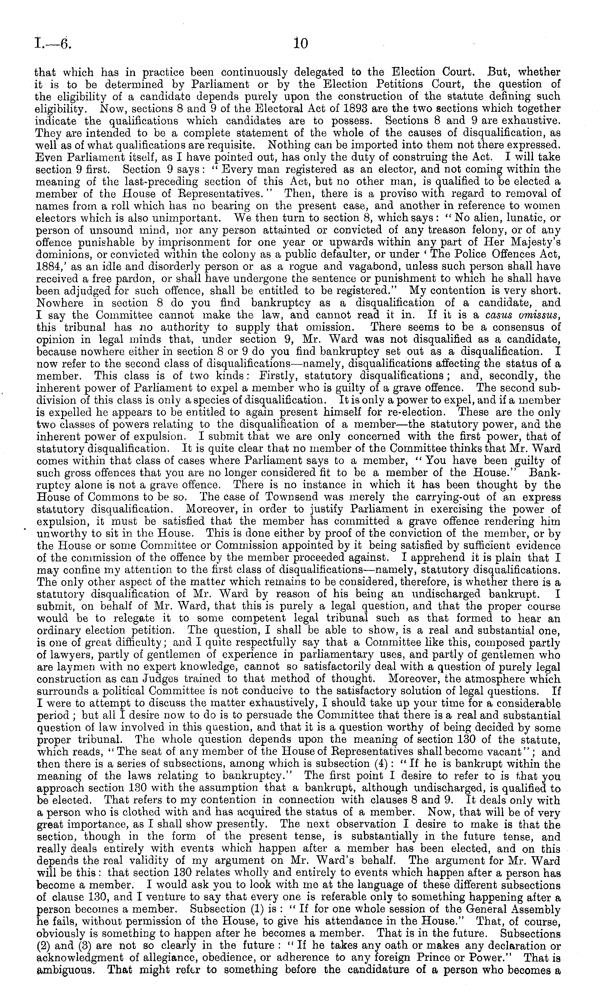 that which has in practice been continuously delegated to the Election Court. But, whether it is to be determined by Parliament or by the Election Petitions Court, the question of the eligibility of a candidate depends purely upon the construction of the statute defining such eligibility. Now, sections 8 and 9of the Electoral Act of 1893 are the two sections which together indicate the qualifications which candidates are to possess. Sections 8 and 9 are exhaustive. They are intended to be a complete statement of tho whole of the causes of disqualification, as well as of what qualifications are requisite. Nothing can be imported into them not there expressed. Even Parliament itself, as I have pointed out, has only the duty of construing the Act. I will take section 9 first. Section 9 says : " Every man registered as an elector, and not coming within the meaning of the last-preceding section of this Act, but no other man, is qualified to be elected a member of the House of Bepresentatives. " Then, there is a proviso with regard to removal of names from a roll which has no bearing on the present case, and another in reference to women electors which is also unimportant. We then turn to section 8, which says :" No alien, lunatic, or person of unsound mind, nor any person attainted or convicted of any treason felony, or of any offence punishable by imprisonment for one year or upwards within any part of Her Majesty's dominions, or convicted within the colony as a public defaulter, or under ' The Police Offences Act, 1884,' as an idle and disorderly person or as a rogue and vagabond, unless such person shall have received a free pardon, or shall have undergone the sentence or punishment to which he shall have been adjudged for such offence, shall be entitled to be registered." My contention is very short. Nowhere in section 8 do you find bankruptcy as a disqualification of a candidate, and I say the Committee cannot make the law, and cannot read it in. If it is a casus omissus, this tribunal has no authority to supply that omission. There seems to be a consensus of opinion in legal minds that, under section 9, Mr. Ward was not disqualified as a candidate, because nowhere either in section Bor9 do you find bankruptcy set out as a disqualification. I now refer to the second class of disqualifications—namely, disqualifications affecting the status of a member. This class is of two kinds: Firstly, statutory disqualifications; and, secondly, the inherent power of Parliament to expel a member who is guilty of a grave offence. The second subdivision of this class is only a species of disqualification. It is only a power to expel, and if a member is expelled he appears to be entitled to again present himself for re-election. These are the only two classes of powers relating to the disqualification of a member—the statutory power, and the inherent power of expulsion. I submit that we are only concerned with the first power, that of statutory disqualification. It is quite clear that no member of the Committee thinks that Mr. Ward comes within that class of cases where Parliament says to a member, " You have been guilty of such gross offences that you are no longer considered fit to be a member of the House." Bankruptcy alone is not a grave offence. There is no instance in which it has been thought by the House of Commons to be so. The case of Townsend was merely the carrying-out of an express statutory disqualification. Moreover, in order to justify Parliament in exercising the power of expulsion, it must be satisfied that the member has committed a grave offence rendering him unworthy to sit in the House. This is done either by proof of the conviction of the member, or by the House or some Committee or Commission appointed by it being satisfied by sufficient evidence of the commission of the offence by the member proceeded against. I apprehend it is plain that I may confine my attention to the first class of disqualifications —namely, statutory disqualifications. The only other aspect of the matter which remains to be considered, therefore, is whether there is a statutory disqualification of Mr. Ward by reason of his being an undischarged bankrupt. I submit, on behalf of Mr. Ward, that this is purely a legal question, and that the proper course would be to relegate it to some competent legal tribunal such as that formed to hear an ordinary election petition. The question, I shall be able to show, is a real and substantial one, is one of great difficulty; and I quite respectfully say that a Committee like this, composed partly of lawyers, partly of gentlemen of experience in parliamentary uses, and partly of gentlemen who are laymen with no expert knowledge, cannot so satisfactorily deal with a question of purely legal construction as can Judges trained to that method of thought. Moreover, the atmosphere which surrounds a political Committee is not conducive to the satisfactory solution of legal questions. If I were to attempt to discuss the matter exhaustively, I should take up your time for a considerable period ; but all I desire now to do is to persuade the Committee that there is a real and substantial question of law involved in this question, and that it is a question worthy of being decided by some proper tribunal. The whole question depends upon the meaning of section 130 of the statute, which reads, " The seat of any member of the House of Representatives shall become vacant" ; and then there is a series of subsections, among which is subsection (4): "If he is bankrupt within the meaning of the laws relating to bankruptcy." The first point I desire to refer to is that you approach section 130 with the assumption that a bankrupt, although undischarged, is qualified to be elected. That refers to my contention in connection with clauses 8 and 9. It deals only with a person who is clothed with and has acquired the status of a member. Now, that will be of very great importance, as I shall sho