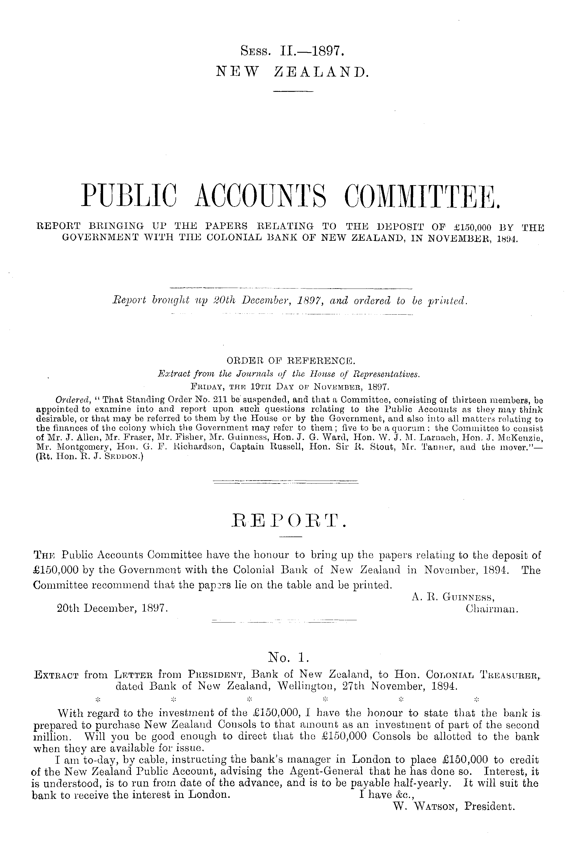 The Public Accounts Committee have the honour to bring up the papers relating to the deposit of £150,000 by the Government with the Colonial Bank of New Zealand in November, 1894. The Committee recommend that the pap2rs lie on the table and be printed. A. E. Guinness, 20th December, 1897. Chairman.