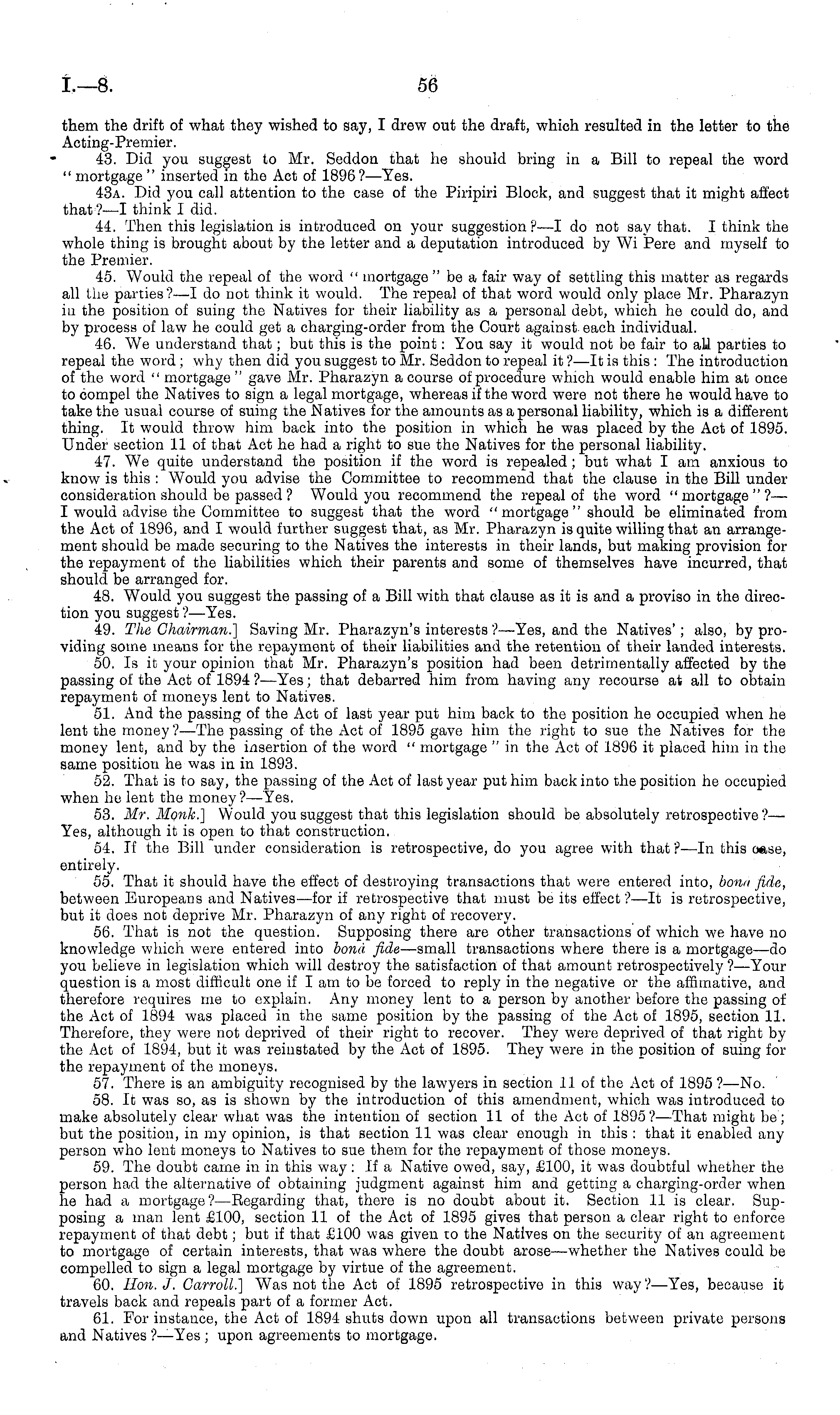 them the drift of what they wished to say, I drew out the draft, which resulted in the letter to the Acting-Premier. 43. Did you suggest to Mr. Seddon that he should bring in a Bill to repeal the word " mortgage " inserted in the Act of 1896? —Yes. 43a. Did you call attention to the case of the Piripiri Block, and suggest that it might affect that?—l think I did. 44. Then this legislation is introduced on your suggestion ?—1 do not say that. I think the whole thing is brought about by the letter and a deputation introduced by Wi Pere and myself to the Premier. 45. Would the repeal of the word " mortgage " be a fair way of settling this matter as regards all the parties?—l do not think it would. The repeal of that word would only place Mr. Pharazyn in the position of suing the Natives for their liability as a personal debt, which he could do, and by process of law he could get a charging-order from the Court against each individual. 46. We understand that; but this is the point: You say it would not be fair to ali parties to repeal the word ; why then did you suggest to Mr. Seddon to repeal it'?—lt is this : The introduction of the word " mortgage " gave Mr. Pharazyn a course of procedure which would enable him at once to compel the Natives to sign a legal mortgage, whereas if the word were not there he would have to take the usual course of suing the Natives for the amounts as a personal liability, which is a different thing. It would throw him back into the position in which he was placed by the Act of 1895. Under section 11 of that Act he had a right to sue the Natives for the personal liability. 47. We quite understand the position if the word is repealed; but what I am anxious to know is this : Would you advise the Committee to recommend that the clause in the Bill under consideration should be passed ? Would you recommend the repeal of the word " mortgage "?— I would advise the Committee to suggest that the word "mortgage" should be eliminated from the Act of 1896, and I would further suggest that, as Mr. Pharazyn is quite willing that an arrangement should be made securing to the Natives the interests in their lands, but making provision for the repayment of the liabilities which their parents and some of themselves have incurred, that should be arranged for. 48. Would you suggest the passing of a Bill with that clause as it is and a proviso in the direction you suggest ?—Yes. 49. The Chairman.'] Saving Mr. Pharazyn's interests ?—Yes, and the Natives'; also, by providing some means for the repayment of their liabilities and the retention of their landed interests. 50. Is it your opinion that Mr. Pharazyn's position had been detrimentally affected by the passing of the Act of 1894 ?—Yes; that debarred him from having any recourse at all to obtain repayment of moneys lent to Natives. 51. And the passing of the Act of last year put him back to the position he occupied when he lent the money ?—The passing of the Act of 1895 gave him the right to sue the Natives for the money lent, and by the insertion of the word " mortgage " in the Act of 1896 it placed him in the same position he was in in 1893. 52. That is to say, the passing of the Act of last year put him back into the position he occupied when he lent the money ?—Yes. 53. Mr. Monk.] Would you suggest that this legislation should be absolutely retrospective ?—- Yes, although it is open to that construction. 54. If the Bill under consideration is retrospective, do you agree with that ?—ln this o*se, entirely. 55. That it should have the effect of destroying transactions that were entered into, bonn fide, between Europeans and Natives—for if retrospective that must be its effect ?—lt is retrospective, but it does not deprive Mr. Pharazyn of any right of recovery. 56. That is not the question. Supposing there are other transactions of which we have no knowledge which were entered into bond fide —small transactions where there is a mortgage—do you believe in legislation which will destroy the satisfaction of that amount retrospectively ?—Your question is a most difficult one if I am to be forced to reply in the negative or the affimative, and therefore requires me to explain. Any money lent to a person by another before the passing of the Act of 1894 was placed in the same position by the passing of the Act of 1895, section 11. Therefore, they were not deprived of their right to recover. They were deprived of that right by the Act of 1894, but it was reinstated by the Act of 1895. They were in the position of suing for the repayment of the moneys. 57. There is an ambiguity recognised by the lawyers in section 11 of the Act of 1895 ? —No. 58. It was so, as is shown by the introduction of this amendment, which was introduced to make absolutely clear what was the intention of section 11 of the Act of 1895? —That might be ; but the position, in my opinion, is that section 11 was clear enough in this : that it enabled any person who lent moneys to Natives to sue them for the repayment of those moneys. 59. The doubt came in in this way : If a Native owed, say, £100, it was doubtful whether the person had the alternative of obtaining judgment against him and getting a charging-order when he had a mortgage?—Eegarding that, there is no doubt about it. Section 11 is clear. Supposing a man lent £100, section 11 of the Act of 1895 gives that person a clear right to enforce repayment of that debt; but if that £100 was given to the Natives on the security of an agreement to mortgage of certain interests, that was where the doubt arose—whether the Natives could be compelled to sign a legal mortgage by virtue of the agreement. 60. Ron. J. Carroll.] Was not the Act of 1895 retrospective in this way ?—Yes, because it travels back and repeals part of a former Act. 61. For instance, the Act of 1894 shuts down upon all transactions between private persons and Natives ?—Yes ; upon agreements to mortgage.