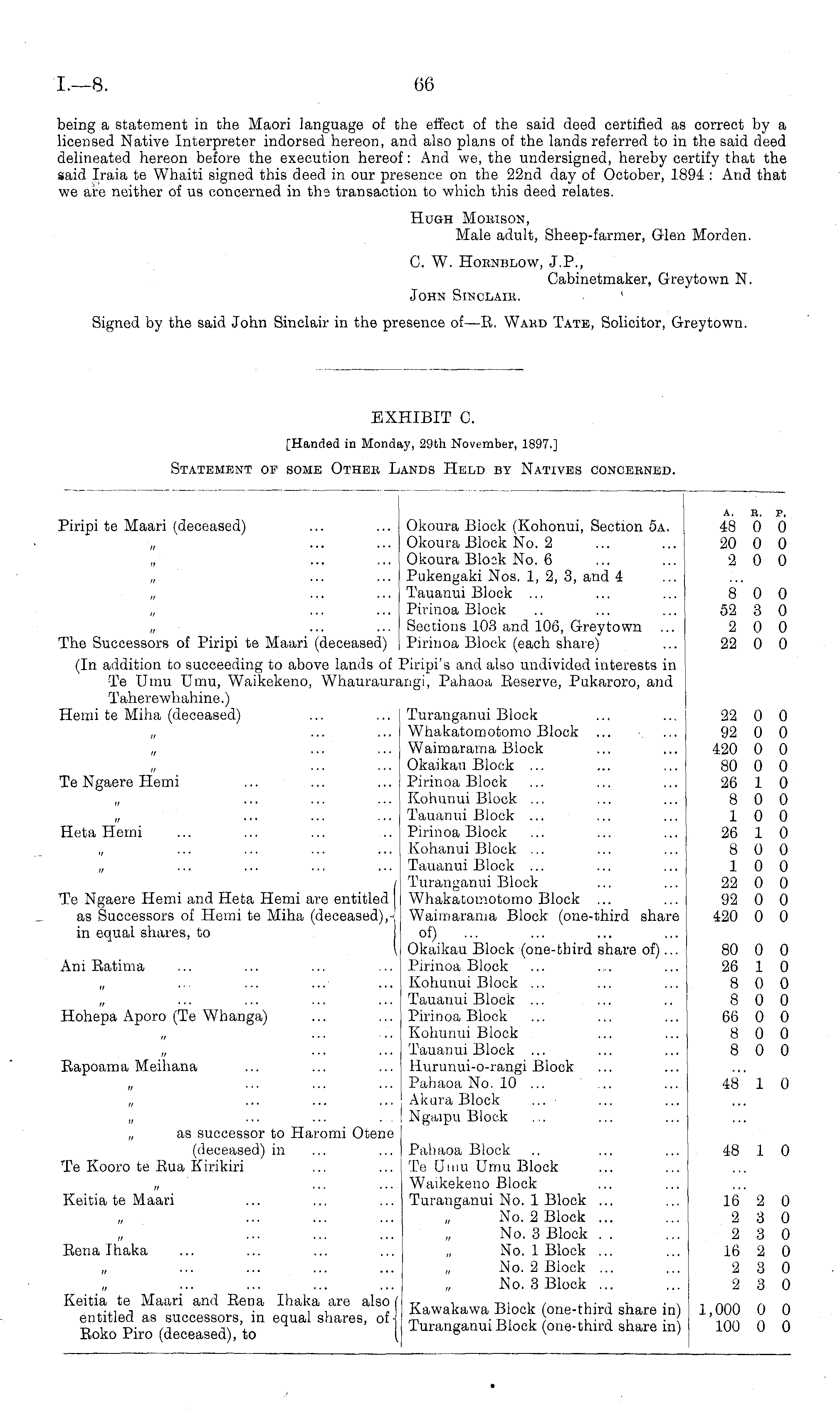 being a statement in the Maori language of the effect of the said deed certified as correct by a licensed Native Interpreter indorsed hereon, and also plans of the lands referred to in the said deed delineated hereon before the execution hereof: And we, the undersigned, hereby certify that the said Iraia te Whaiti signed this deed in our presence on the 22nd day of October, 1894 : And that we are neither of us concerned in the transaction to which this deed relates. Hugh Mobison, Male adult, Sheep-farmer, Glon Morden. 0. W. Hoenblow, J. P., Cabinetmaker, Greytown N. John Sinclair. Signed by the said John Sinclair in the presence of—E. Ward Tatb, Solicitor, Greytown.