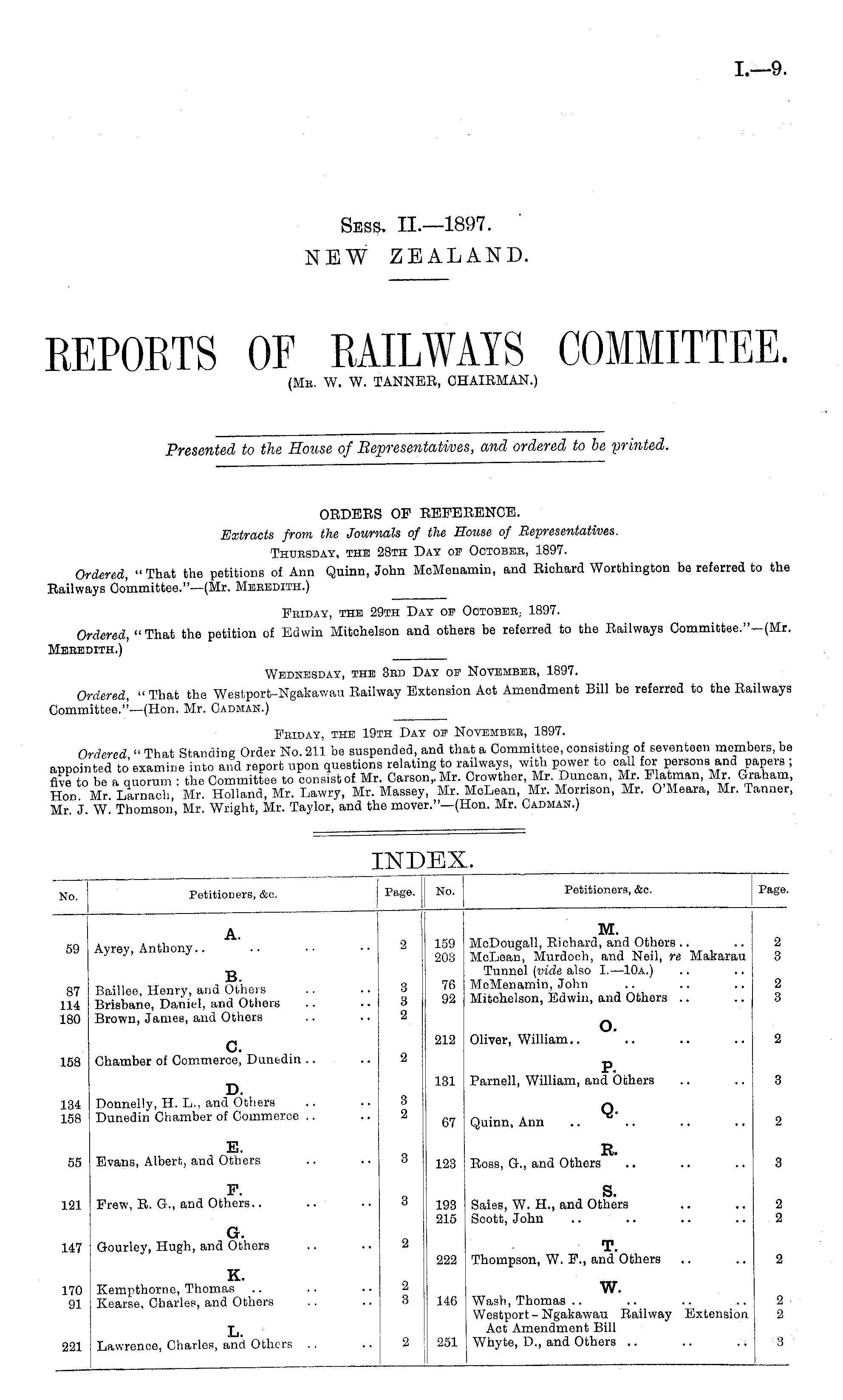 ORDERS OP REFERENCE. Extracts from the Journals of the House of Representatives. Thursday, the 28th Day of October, 1897. Ordered, " That the petitions of Ann Quinn, John MeMenamin, and Richard Worthington be referred to the Railways Committee."—(Mr. Meredith.)
