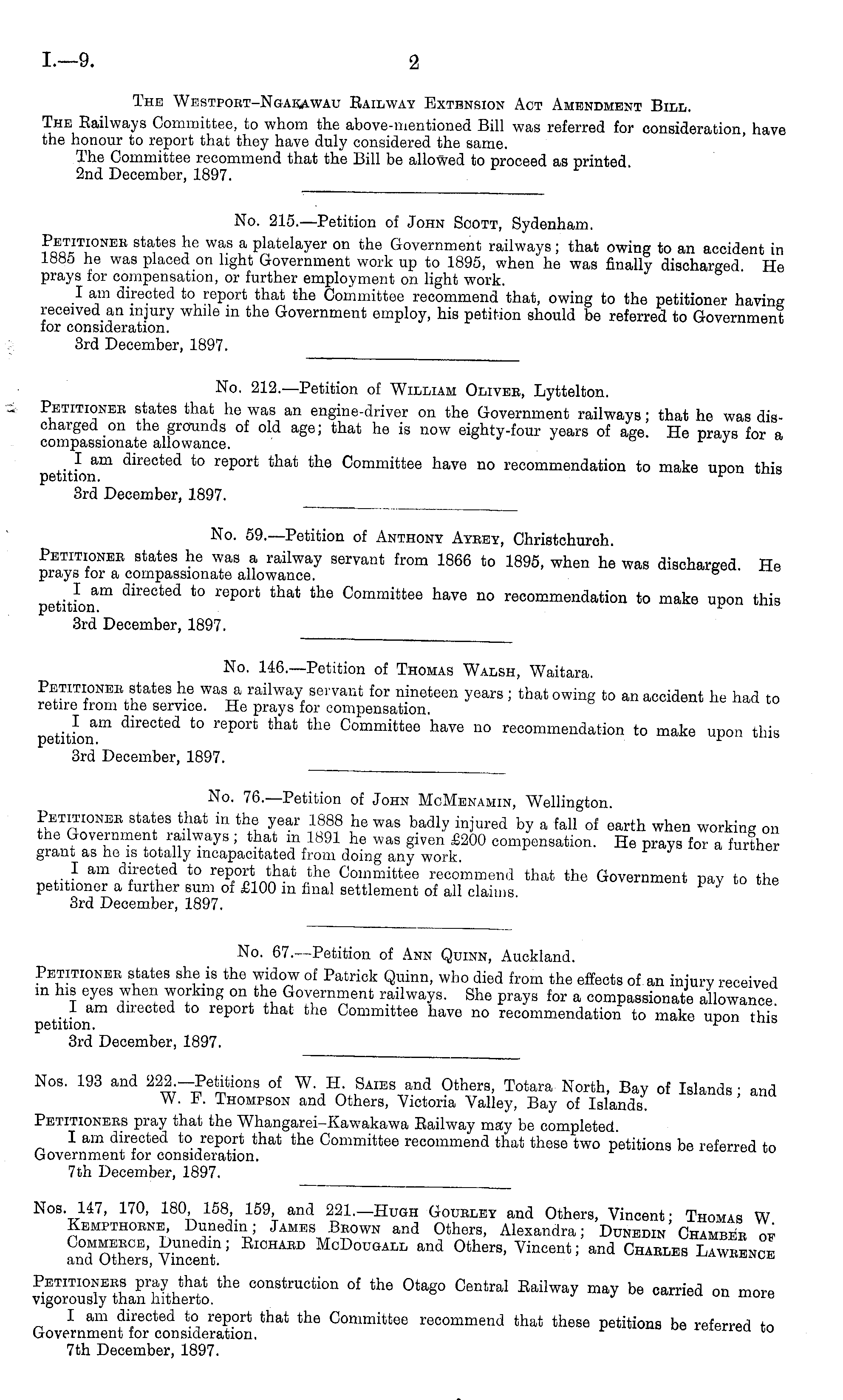 No. 215.—Petition of John Scott, Sydenham. Petitionee states he was a platelayer on the Government railways; that owing to an accident in 1885 he was placed on light Government work up to 1895, when he was finally discharged He prays for compensation, or further employment on light work. I am directed to report that the Committee recommend that, owing to the petitioner having received an injury while in the Government employ, his petition should be referred to Government tor consideration. 3rd December, 1897.