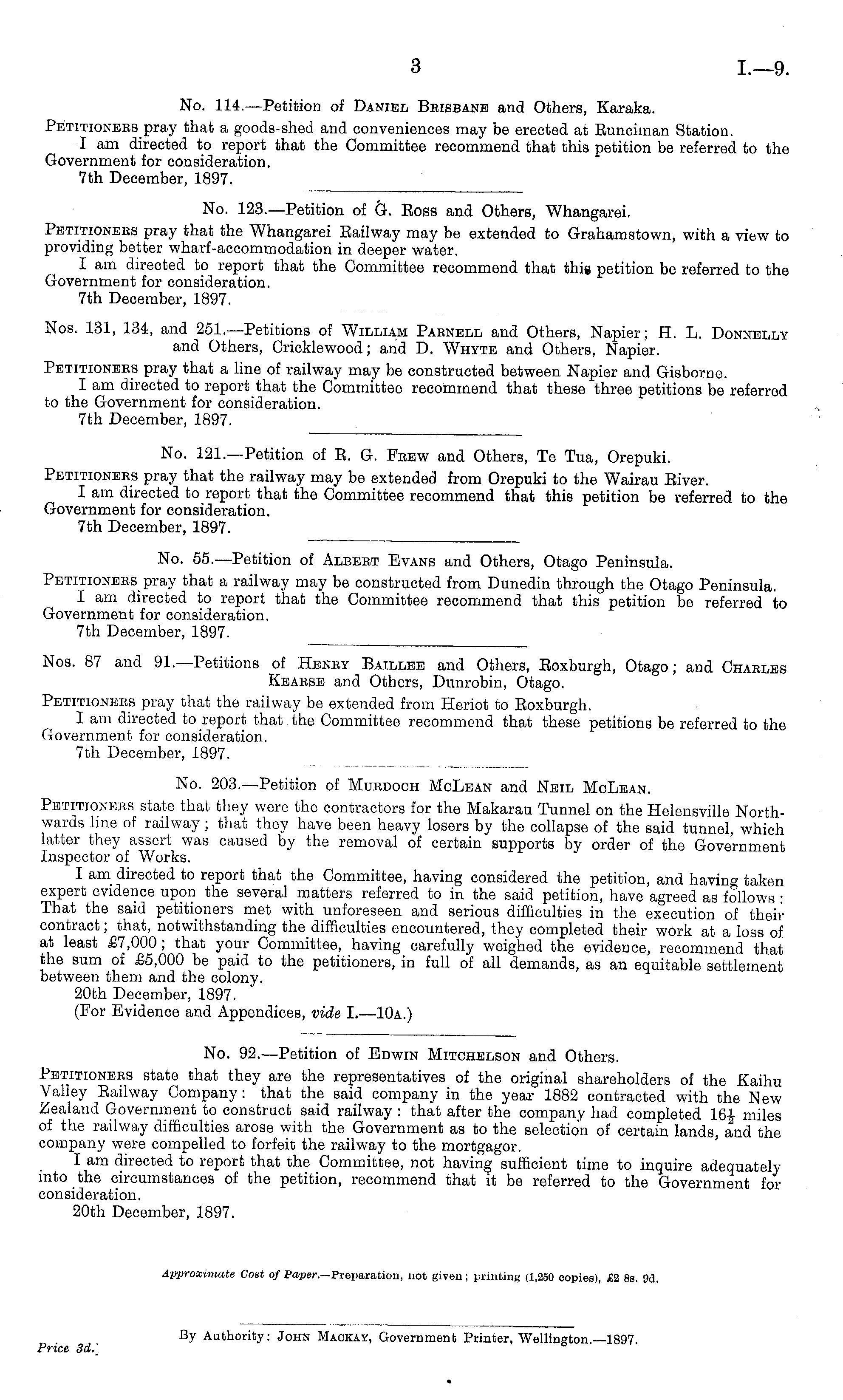 Nos. 131, 134, and 251.—Petitions of William Paenell and Others, Napier: H. L. Donnelly and Others, Cricklewood; and D. Whyte and Others, Napier. Petitionees pray that a line of railway may be constructed between Napier and Gisborne. I am directed to report that the Committee recommend that these three petitions be referred to the Government for consideration. 7th December, 1897.