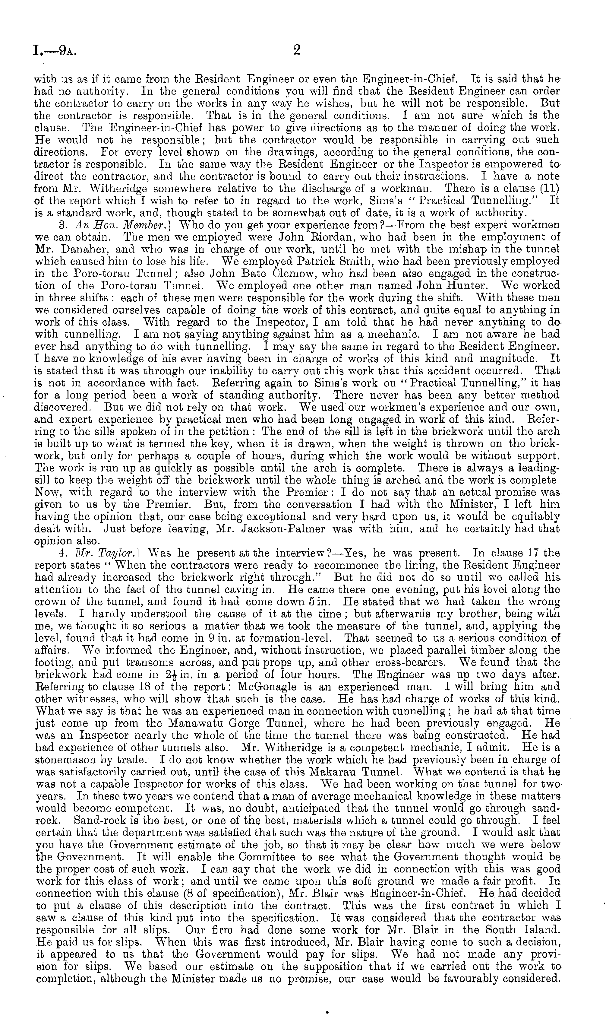 with us as if it came from the Besident Engineer or even the Engineer-in-Chief. It is said that he had no authority. In the general conditions you will find that the Besident Engineer can order the contractor to carry on the works in any way he wishes, but he will not be responsible. But the contractor is responsible. That is in the general conditions. I am not sure which is the clause. The Engineer-in-Chief has power to give directions as to the manner of doing the work. He would not be responsible; but the contractor would be responsible in carrying out such directions. For every level shown on the drawings, according to the general conditions, the contractor is responsible. In the same way the Besident Engineer or the Inspector is empowered to direct the contractor, and the contractor is bound to carry out their instructions. I have a note from Mr. Witheridge somewhere relative to the discharge of a, workman. There is a clause (11) of the report which I wish to refer to in regard to the work, Sims's " Practical Tunnelling." It is a standard work, and, though stated to be somewhat out of date, it is a work of authority. 3. An Hon. Member.] Who do you get your experience from?— From the best expert workmen we can obtain. The men we employed were John Biordan, who had been in the employment of Mr. Danaher, and who was in charge of our work, until he met with the mishap in the tunnel which caused him to lose his life. We employed Patrick Smith, who had been previously employed in the Poro-torau Tunnel; also John Bate Clemow, who had been also engaged in the construction of the Poro-torau Tunnel. We employed one other man named John Hunter. We worked in three shifts : each of these men were responsible for the work during the shift. With these men we considered ourselves capable of doing the work of this contract, and quite equal to anything in work of this class. With regard to the Inspector, lam told that he had never anything to do with tunnelling. lam not saying anything against him as a mechanic. lam not aware he had ever had anything to do with tunnelling. I may say the same in regard to the Besident Engineer. I have no knowledge of his ever having been in charge of works of this kind and magnitude. It is stated that it was through our inability to carry out this work that this accident occurred. That is not in accordance with fact. Beferring again to Sims's work on "Practical Tunnelling," it has for a long period been a work of standing authority. There never has been any better method discovered. But we did not rely on that work. We used our workmen's experience and our own, and expert experience by practical men who had been long engaged in work of this kind. Beferring to the sills spoken of in the petition : The end of the sill is left in the brickwork until the arch is built up to what is termed the key, when it is drawn, when the weight is thrown on the brickwork, but only for perhaps a couple of hours, during which the work would be without support. The work is run up as quickly as possible until the arch is complete. There is always a leadingsill to keep the weight off the brickwork until the whole thing is arched and the work is complete Now, with regard to the interview with the Premier : I do not say that an actual promise was given to us by the Premier. But, from the conversation. I had with the Minister, I left him having the opinion that, our case being exceptional and very hard upon us, it would be equitably dealt with. Just before leaving, Mr. Jackson-Palmer was with him, and he certainly had that opinion also. 4. Mr. Taylor.) Was he present at the interview?— Yes, he was present. In clause 17 the report states " When the contractors were ready to recommence the lining, the Besident Engineer had already increased the brickwork right through." But he did not do so until we called his attention to the fact of the tunnel caving in. He came there one evening, put his level along the crown of the tunnel, and found it had come down 5 in. He stated that we had taken the wrong levels. I hardly understood the cause of it at the time ; but afterwards my brother, being with me, we thought it so serious a matter that we took the measure of the tunnel, and, applying the level, found that it had come in 9 in. at formation-level. That seemed to us a serious condition of affairs. We informed the Engineer, and, without instruction, we placed parallel timber along the footing, and put transoms across, and put props up, and other cross-bearers. We found that the brickwork had come in 2|-in. in a period of four hours. The Engineer was up two days after. Beferring to clause 18 of the report: McGonagle is an experienced man. I will bring him and other witnesses, who will show that such is the case. He has had charge of works of this kind. What we say is that he was an experienced man in connection with tunnelling; he had at that time just come up from the Manawatu Gorge Tunnel, where he had been previously engaged. He was an Inspector nearly the whole of the time the tunnel there was being constructed. He had had experience of other tunnels also. Mr. Witheridge is a competent mechanic, I admit. He is a stonemason by trade. Ido not know whether the work which he had previously been in charge of was satisfactorily carried out, until the case of this Makarau Tunnel. What we contend is that he was not a capable Inspector for works of this class. We had been working on that tunnel for two years. In these two years we contend that a man of average mechanical knowledge in these matters would become competent. It was, no doubt, anticipated that the tunnel would go through sandrock. Sand-rock is the best, or one of the best, materials which a tunnel could go through. I feel certain that the department was satisfied that such was the nature of the ground. I would ask that you have the Government estimate of the job, so that it may be clear how much we were below the Government. It will enable th