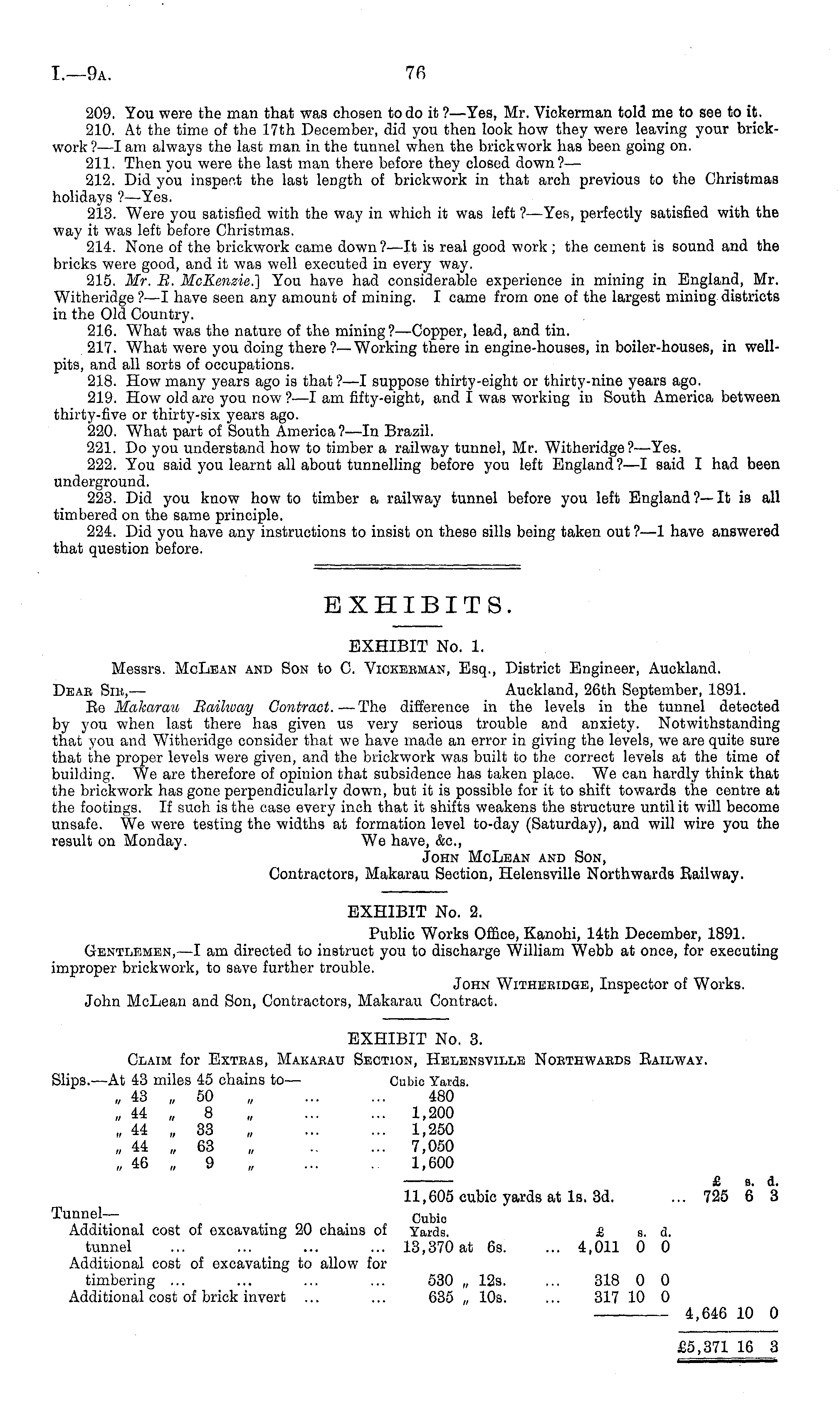 EXHIBITS. EXHIBIT No. 1. Messrs. McLean and Son to C. Vickebman, Esq., District Engineer, Auckland. Dbab Sim, — Auckland, 26th September, 1891. Ec Makarau Raihvay Contract. —The difference in the levels in the tunnel detected by you when last there has given us very serious trouble and anxiety. Notwithstanding that you and Witheridge consider that we have made an error in giving the levels, we are quite sure that the proper levels were given, and the brickwork was built to the correct levels at the time of building. We are therefore of opinion that subsidence has taken place. We can hardly think that the brickwork has gone perpendicularly down, but it is possible for it to shift towards the centre at the footings. If such is the case every inch that it shifts weakens the structure until it will become unsafe. We were testing the widths at formation level to-day (Saturday), and will wire you the result on Monday. We have, &c, John McLean and Son, Contractors, Makarau Section, Helensville Northwards Railway. EXHIBIT No. 2. Public Works Office, Kanohi, 14th December, 1891. Gentlemen, —I am directed to instruct you to discharge William Webb at once, for executing improper brickwork, to save further trouble. John Witheeidge, Inspector of Works. John McLean and Son, Contractors, Makarau Contract. EXHIBIT No. 3. Claim for Exteas, Makabau Section, Helensville Noethwaeds Eailway. Slips.—At 43 miles 45 chains to — Cubic Yards. „43 „ 50 , 480 „44 „ 8 „ 1,200 „44 „ 33 „ 1,250 „44 „ 63 „ 7,050 „46 „ 9 „ 1,600 £ b. a. 11,605 cubic yards at Is. 3d. ... 725 6 3 Tunnel— Cubic Additional cost of excavating 20 chains of Yards. £ s. d. tunnel ... ... ... ... 13,370 at 6s. ... 4,011 0 0 Additional cost of excavating to allow for timbering ... ... ... ... 530 „ 12s. ... 318 0 0 Additional cost of brick invert ... ... 635 „ 10s. ... 317 10 0 4,646 10 0 £5,371 16 3