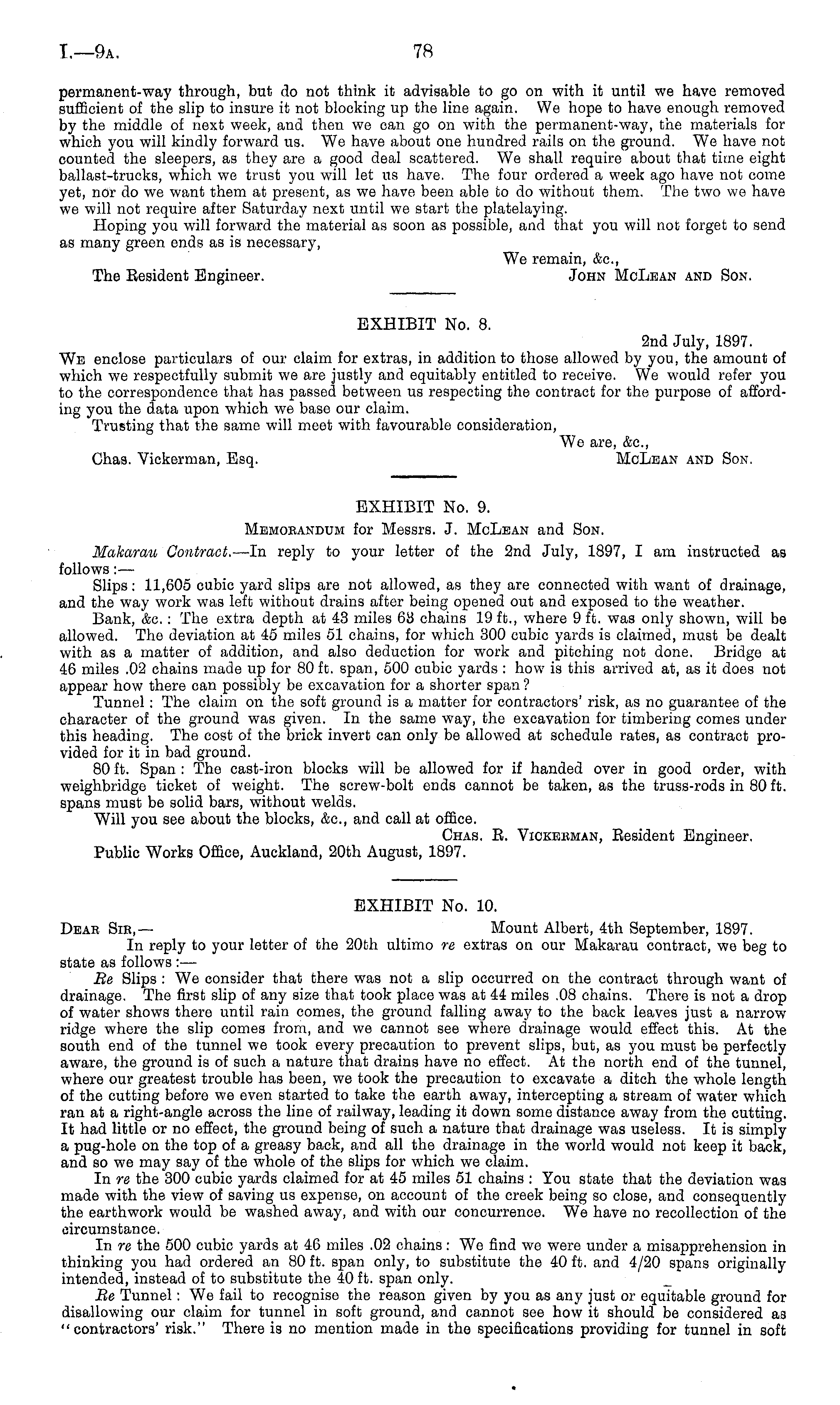 EXHIBIT No. 9. Memorandum for Messrs. J. McLean and Son. Makarau Contract. —In reply to your letter of the 2nd July, 1897, I am instructed as follows: — Slips: 11,605 cubic yard slips are not allowed, as they are connected with want of drainage, and the way work was left without drains after being opened out and exposed to the weather. Bank, &c.: The extra depth at 43 miles 63 chains 19 ft., where 9 ft. was only shown, will be allowed. The deviation at 45 miles 51 chains, for which 300 cubic yards is claimed, must be dealt with as a matter of addition, and also deduction for work and pitching not done. Bridge at 46 miles .02 chains made up for 80 ft. span, 500 cubic yards : how is this arrived at, as it does not appear how there can possibly be excavation for a shorter span ? Tunnel: The claim on the soft ground is a matter for contractors' risk, as no guarantee of the character of the ground was given. In the same way, the excavation for timbering comes under this heading. The cost of the brick invert can only be allowed at schedule rates, as contract provided for it in bad ground. 80 ft. Span : The cast-iron blocks will be allowed for if handed over in good order, with weighbridge ticket of weight. The screw-bolt ends cannot be taken, as the truss-rods in 80 ft. spans must be solid bars, without welds. Will you see about the blocks, &c, and call at office. Chas. E. Vickekman, Eesident Engineer. Public Works Office, Auckland, 20th August, 1897.