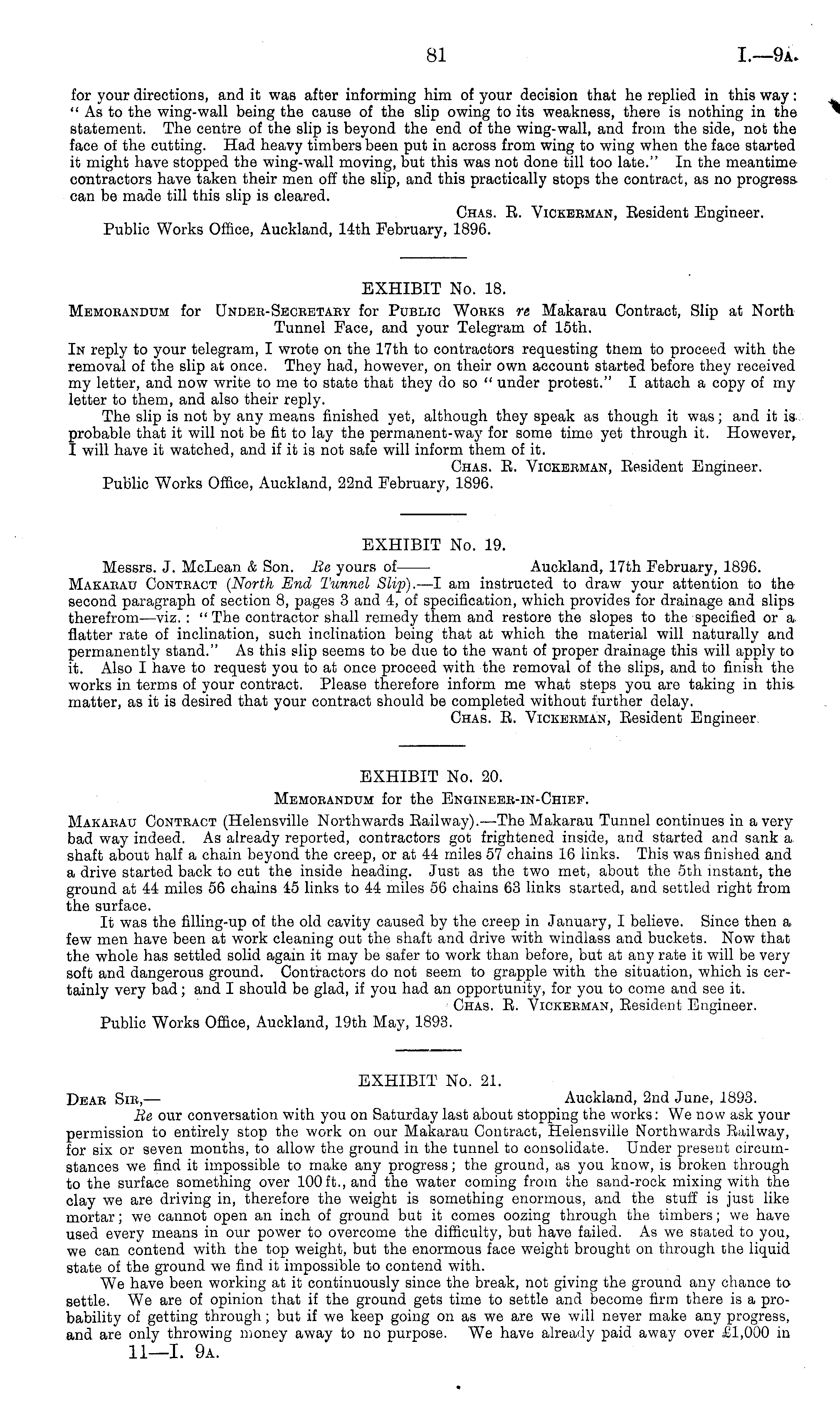 EXHIBIT No. 18. Memorandum for Under-Secretary for Public Works re Makarau Contract, Slip at North Tunnel Face, and your Telegram of 15th. In reply to your telegram, I wrote on the 17th to contractors requesting tnern to proceed with the removal of the slip at once. They had, however, on their own account started before they received my letter, and now write to me to state that they do so " under protest." I attach a copy of my letter to them, and also their reply. The slip is not by any means finished yet, although they speak as though it was; and it is. probable that it will not be fit to lay the permanent-way for some time yet through it. However, I will have it watched, and if it is not safe will inform them of it. Chas. E. Vickerman, Eesident Engineer. Public Works Office, Auckland, 22nd February, 1896.