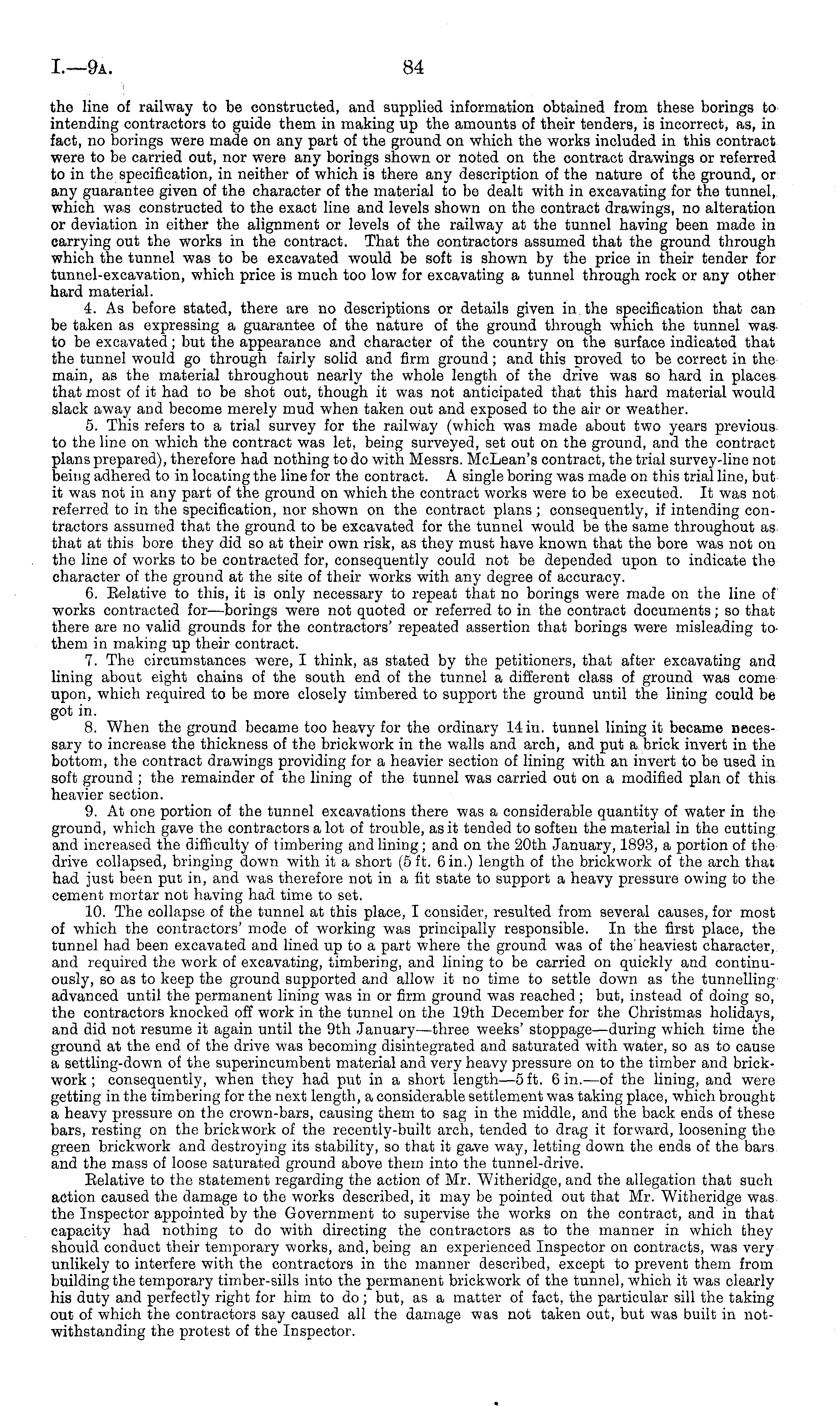 the line of railway to be constructed, and supplied information obtained from these borings to intending contractors to guide them in making up the amounts of their tenders, is incorrect, as, in fact, no borings were made on any part of the ground on which the works included in this contract were to be carried out, nor were any borings shown or noted on the contract drawings or referred to in the specification, in neither of which is there any description of the nature of the ground, or any guarantee given of the character of the material to be dealt with in excavating for the tunnel, which was constructed to the exact line and levels shown on the contract drawings, no alteration or deviation in either the alignment or levels of the railway at the tunnel having been made in carrying out the works in the contract. That the contractors assumed that the ground through which the tunnel was to be excavated would be soft is shown by the price in their tender for tunnel-excavation, which price is much too low for excavating a tunnel through rock or any other hard material. 4. As before stated, there are no descriptions or details given in the specification that can be taken as expressing a guarantee of the nature of the ground through which the tunnel was to be excavated; but the appearance and character of the country on the surface indicated that the tunnel would go through fairly solid and firm ground; and this rjroved to bo correct in the main, as the material throughout nearly the whole length of the drive was so hard in places that most of it had to be shot out, though it was not anticipated that this hard material would slack away and become merely mud when taken out and exposed to the air or weather. 5. This refers to a trial survey for the railway (which was made about two years previous to the line on which the contract was let, being surveyed, set out on the ground, and the contract plans prepared), therefore had nothing to do with Messrs. McLean's contract, the trial survey-line not being adhered to in locating the line for the contract. A single boring was made on this trial line, but it was not in any part of the ground on which the contract works were to be executed. It was not referred to in the specification, nor shown on the contract plans ; consequently, if intending contractors assumed that the ground to be excavated for the tunnel would be the same throughout as that at this bore they did so at their own risk, as they must have known that the bore was not on the line of works to be contracted for, consequently could not be depended upon to indicate the character of the ground at the site of their works with any degree of accuracy. 6. Relative to this, it is only necessary to repeat that no borings were made on the line of works contracted for —borings were not quoted or referred to in the contract documents; so that there are no valid grounds for the contractors' repeated assertion that borings were misleading tothem in making up their contract. 7. The circumstances were, I think, as stated by the petitioners, that after excavating and lining about eight chains of the south end of the tunnel a different class of ground was come upon, which required to be more closely timbered to support the ground until the lining could be got in. 8. When the ground became too heavy for the ordinary 14 in. tunnel lining it became necessary to increase the thickness of the brickwork in the walls and arch, and put a brick invert in the bottom, the contract drawings providing for a heavier section of lining with an invert to be used in soft ground ; the remainder of the lining of the tunnel was carried out on a modified plan of this heavier section. 9. At one portion of the tunnel excavations there was a considerable quantity of water in the ground, which gave the contractors a lot of trouble, as it tended to soften the material in the cutting and increased the difficulty of timbering and lining; and on the 20th January, 1893, a portion of the drive collapsed, bringing down with it a short (5 ft. 6 in.) length of the brickwork of the arch that had just been put in, and was therefore not in a fit state to support a heavy pressure owing to the cement mortar not having had time to set. 10. The collapse of the tunnel at this place, I consider, resulted from several causes, for most of which the contractors' mode of working was principally responsible. In the first place, the tunnel had been excavated and lined up to a part where the ground was of the heaviest character, and required the work of excavating, timbering, and lining to be carried on quickly and continuously, so as to keep the ground supported and allow it no time to settle down as the tunnelling advanced until the permanent lining was in or firm ground was reached; but, instead of doing so, the contractors knocked off work in the tunnel on the 19th December for the Christmas holidays, and did not resume it again until the 9th January—three weeks' stoppage—during which time the ground at the end of the drive was becoming disintegrated and saturated with water, so as to cause a settling-down of the superincumbent material and very heavy pressure on to the timber and brickwork ; consequently, when they had put in a short length—s ft. 6 in.—of the lining, and were getting in the timbering for the next length, a considerable settlement was taking place, which brought a heavy pressure on the crown-bars, causing them to sag in the middle, and the back ends of these bars, resting on the brickwork of the recently-built arch, tended to drag it forward, loosening the green brickwork and destroying its stability, so that it gave way, letting down the ends of the bars and the mass of loose saturated ground above them into the tunnel-drive. Eelative to the statement regarding the action of Mr. Witheridge, and the allegation that such action caused the damage to the works described, it may be pointed out that Mr. Witheridge was the Inspecto