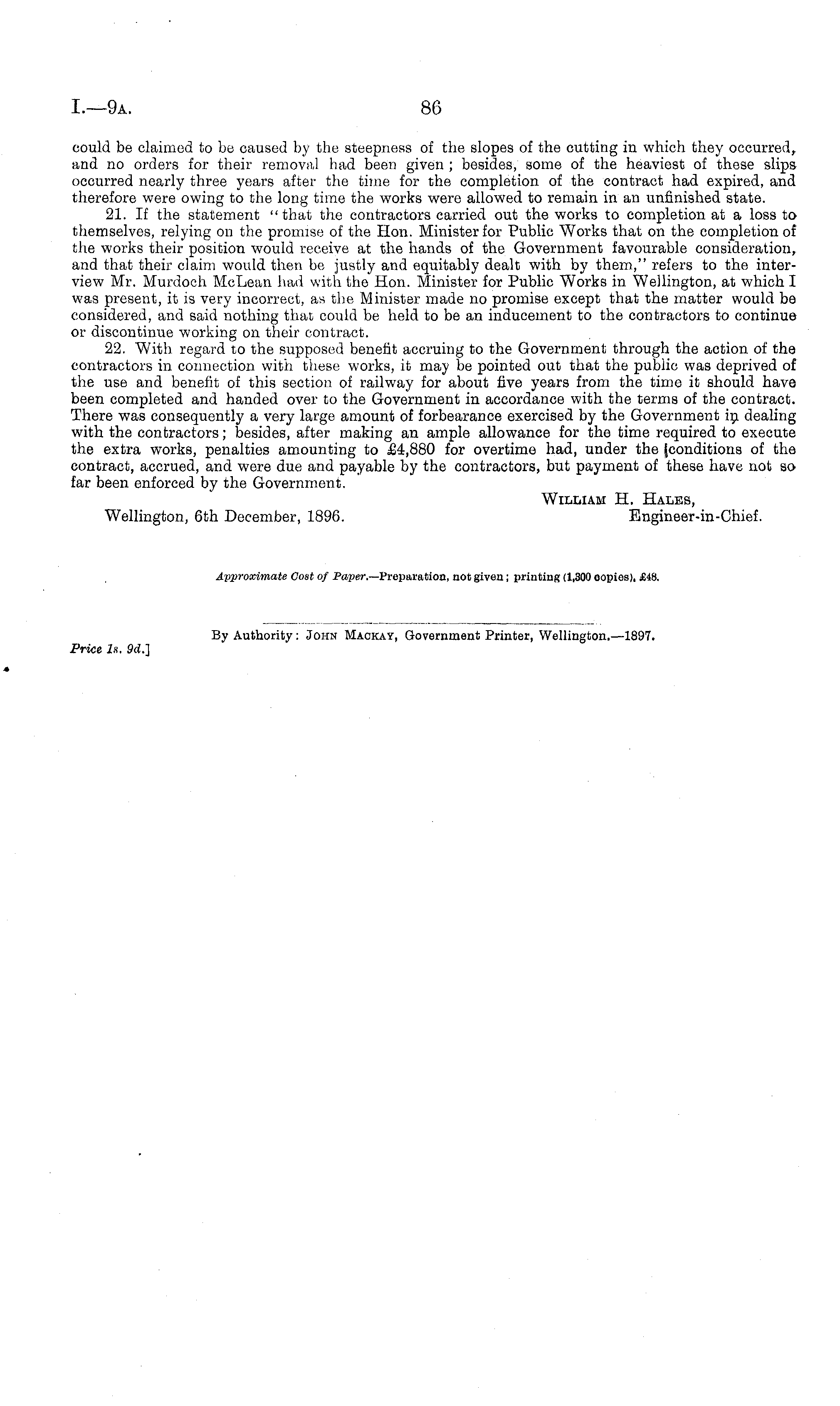 could be claimed to be caused by the steepness of the slopes of the cutting in which they occurred, and no orders for their removal had been given ; besides, some of the heaviest of these slips occurred nearly throe years after the time for the completion of the contract had expired, and therefore were owing to the long time the works were allowed to remain in an unfinished state. 21. If the statement "that the contractors carried out the works to completion at a loss to themselves, relying on the promise of the Hon. Minister for Public Works that on the completion of the works their position would receive at the hands of the Government favourable consideration, and that their claim would then be justly and equitably dealt with by them," refers to the interview Mr. Murdoch McLean had with the Hon. Minister for Public Works in Wellington, at which I was present, it is very incorrect, as the Minister made no promise except that the matter would be considered, and said nothing that could be held to be an inducement to the contractors to continue or discontinue working on their contract. 22. With regard to the supposed benefit accruing to the Government through the action of the contractors in connection with these works, it may be pointed out that the public was deprived of the use and benefit of this section of railway for about five years from the time it should have been completed and handed over to the Government in accordance with the terms of the contract. There was consequently a very large amount of forbearance exercised by the Government in dealing with the contractors; besides, after making an ample allowance for the time required to execute the extra works, penalties amounting to £4,880 for overtime had, under the {conditions of the contract, accrued, and were due and payable by the contractors, but payment of these have not so far been enforced by the Government. William H. Hales, Wellington, 6th December, 1896. Engineer-in-Chief. Approximate Cost of Paper. —Preparation, not given; printing (1,300 copies), £43.