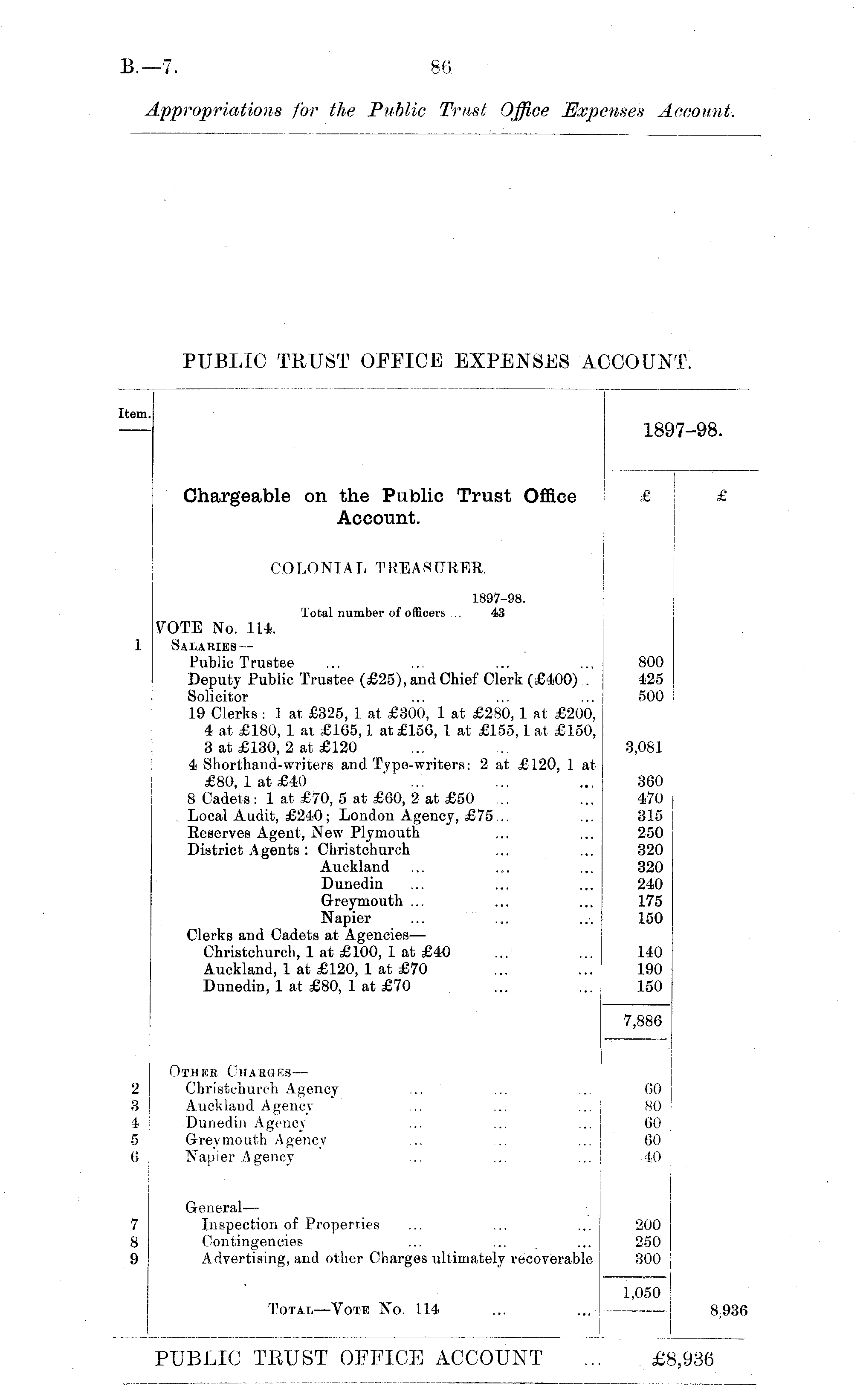 Item. 1897-98. Chargeable on the Public Trust Office £ Account. COLONIAL TREASURER. 1897-98. Total number of officers ... 43 VOTE No. 114. Salaries — Public Trustee Deputy Public Trustee (£25), and Chief Clerk (£400) . Solicitor 19 Clerks : 1 at £325, 1 at £300, 1 at £280, 1 at £200, 4 at £180, 1 at £165,1 at £156, 1 at £155,1 at £150, 3 at £130, 2 at £120 4 Shorthand-writers and Type-writers: 2 at £120, 1 at £80, 1 at £40 8 Cadets: 1 at £70, 5 at £60, 2 at £50 ... , Local Audit, £240; London Agency, £75... Reserves Agent, New Plymouth District Agents : Christchurch Auckland Dunedin Greymouth ... Napier Clerks and Cadets at Agencies — Christchurch, 1 at £100, 1 at £40 Auckland, 1 at £120, 1 at £70 Dunedin, 1 at £80, 1 at £70 800 425 500 3,081 360 470 315 250 320 320 240 175 150 140 190 150 7,886 2 3 4 5 6 Other Charges— Christchurch Agency Auckland Agency Dunedin Agency Greymouth Agency Napier Agency 60 80 60 60 40 7 8 9 General — Inspection of Properties Contingencies Advertising, and other Charges ultimately recoverable 200 250 300 1,050 Total —Vote No. 114 8,936 PUBLIC TEUST OFFICE ACCOUNT m 936