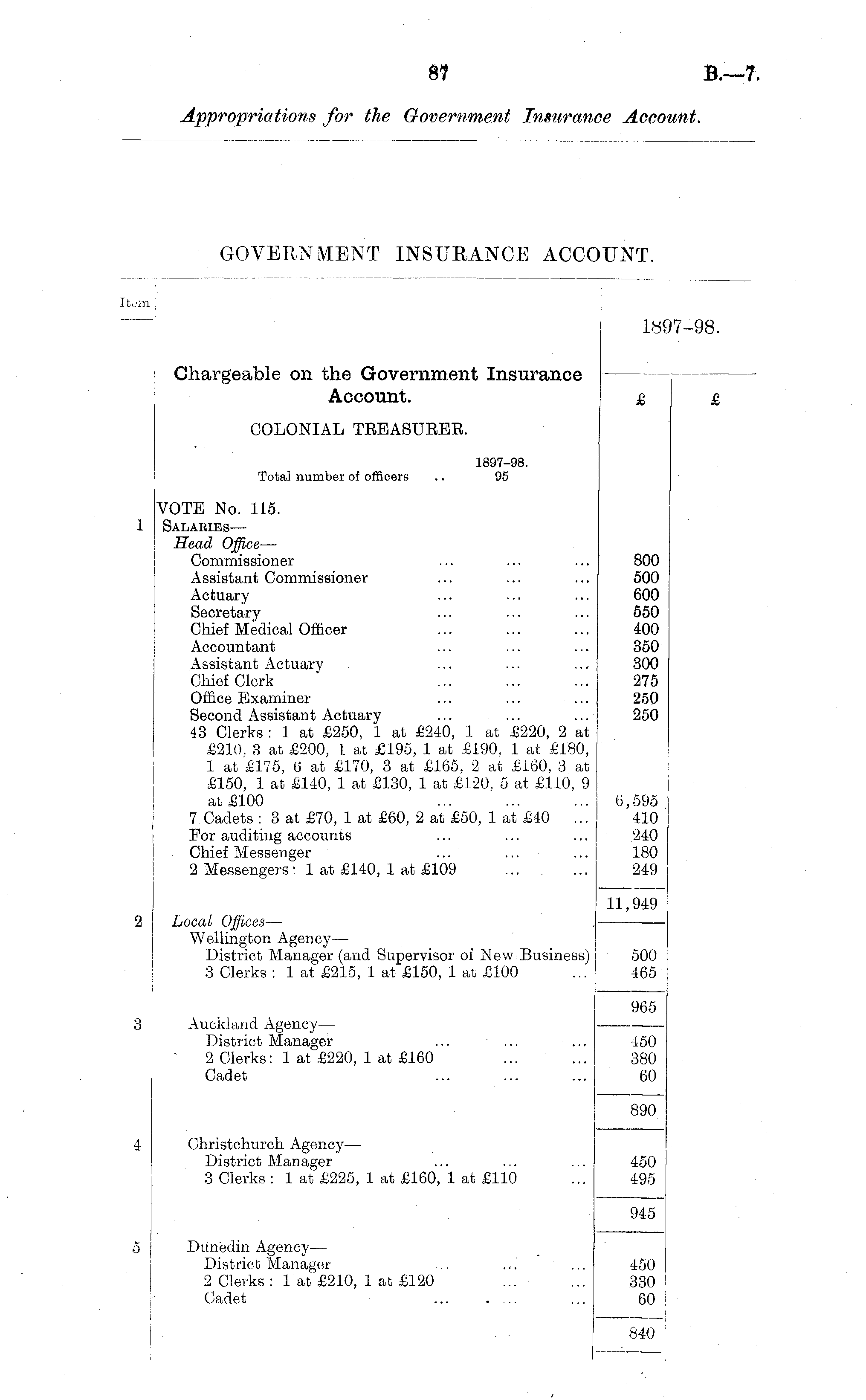 [tern 1897-98 Chargeable on the Government Insurance i Account. £ i COLONIAL TREASURER. 1897-98. Total number of officers .. 95 VOTE No. 115. Salaries — Head Office — Commissioner Assistant Commissioner Actuary Secretary Chief Medical Officer Accountant Assistant Actuary Chief Clerk Office Examiner Second Assistant Actuary 43 Clerks : 1 at £250, 1 at £240, 1 at £220, 2 at £210, 3 at £200, 1 at £195, 1 at £190, 1 at £180, 1 at £175, 6 at £170, 3 at £165, 2 at £160, 3 at £150, 1 at £140, 1 at £130, 1 at £120, 5 at £110, 9 at £100 7 Cadets : 3 at £70, 1 at £60, 2 at £50, 1 at £40 ... For auditing accounts Chief Messenger 2 Messengers: 1 at £140, 1 at £109 800 500 600 550 400 350 300 275 250 250 6,595 410 240 180 249 Local Offices — Wellington Agency — District Manager (and Supervisor of New Business) 3 Clerks : 1 at £215, 1 at £150, 1 at £100 11,949 500 465 Auckland Agency — District Manager ... ... 2 Clerks: 1 at £220, 1 at £160 Cadet 965 3 450 380 60 Christchurch Agency — District Manager 3 Clerks : 1 at £225, 1 at £160, 1 at £110 890 450 495 945 5 Dunedjn Agency— District Manager 2 Clerks : 1 at £210, 1 at £120 Cadet ... .... 450 330 60