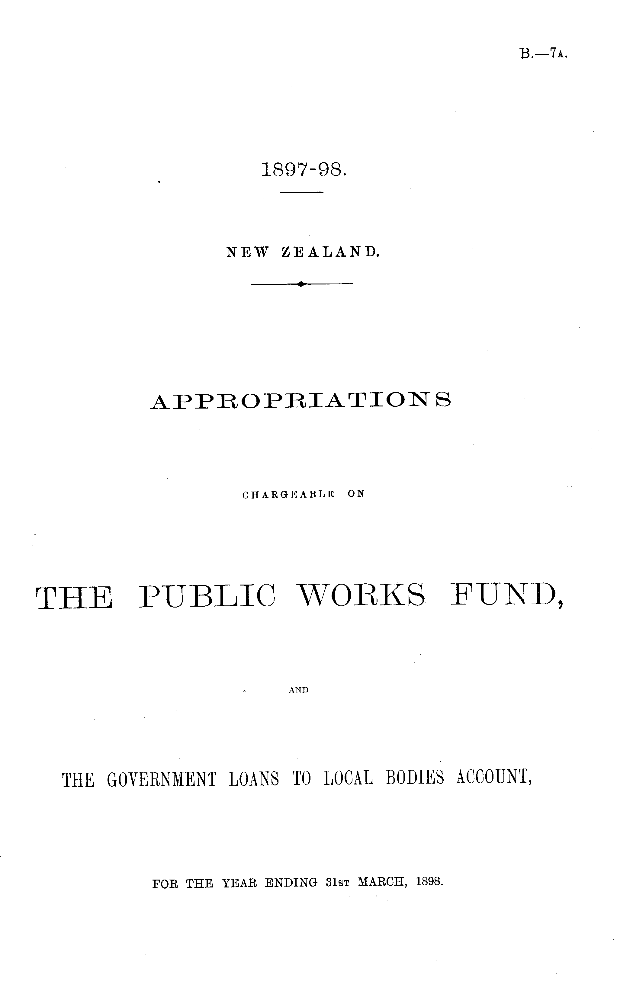 APPROPRIATIONS CHARGEABLE ON THE PUBLIC WORKS FUND, AND THE GOVERNMENT LOANS TO LOCAL BODIES ACCOUNT, FOR THE YEAR ENDING 31st MARCH, 1898.