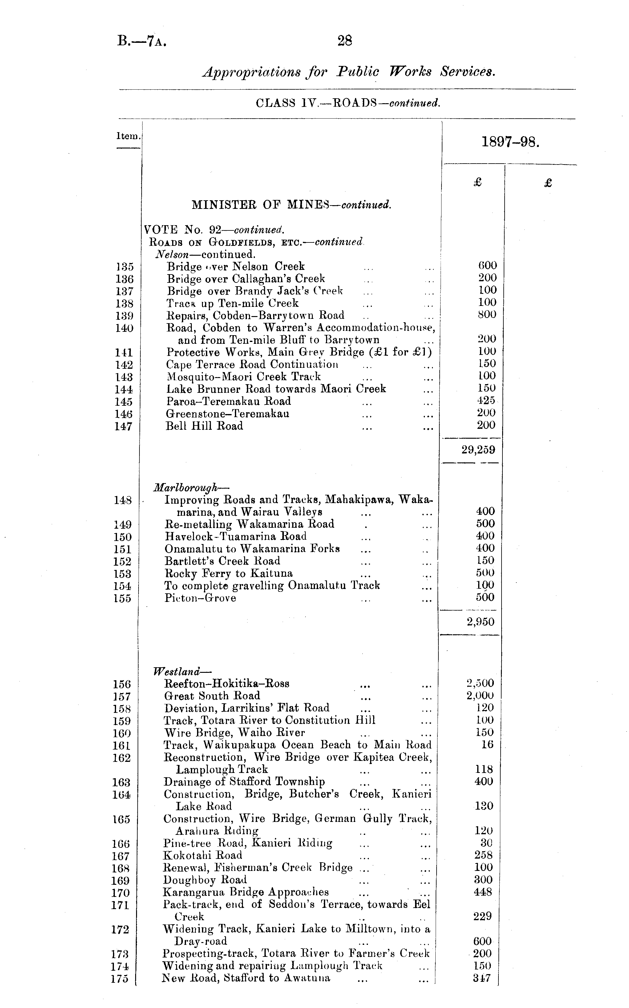 Item. 189 '-98. MINISTER OF MINES— continued. 135 136 137 138 189 140 VOTE No. 92 — continued. Roads on Goldfields, etc.- — continued Nelson —continued. Bridge'.ver Nelson Creek ... ... Bridge over Callaghan's Creek Bridge over Brandy Jack's Creek Tracn up Ten-mile Creek Repairs, Cobden-Barrytown Road Road, Cobden to Warren's Accommodation-house, and from Ten-mile Blufl' to Barrytown Protective Works, Main Grey Bridge (£1 for £]) Cape Terrace Road Continuation Mosquito-Maori Creek Track Lake Brunner Road towards Maori Creek Paroa-Teremakau Road Green stone—Teremakau Bell Hill Road 600 200 100 100 800 200 100 150 100 150 425 200 200 141 142 143 144 145 14(5 147 29,259 148 149 150 151 152 153 154 155 Marlborough — Improving Roads and Tracks, Mahakipawa, Wakamarina, and Wairau Valleys Re-metalling Wakarnarina Road Havelock-Tuamarina Road Onamalutu to Wakamarina Forks Bartlett's Creek Road Rocky Ferry to Kaituna To complete gravelling Onamalutu Track Picton-Grove 400 500 400 400 L50 500 100 500 2,950 156 157 158 159 160 161 162 163 164 165 Westland — Reefton-Hokitika-Ross Great South Road Deviation, Larrikins'Flat Road Track, Totara River to Constitution Hill Wire Bridge, Waiho River Track, Waikupakupa Ocean Beach to Main Road Reconstruction, Wire Bridge over Kapitea Creek, Lamplough Track Drainage of Stafford Township Construction, Bridge, Butcher's Creek, Kanieri Lake Road Construction, Wire Bridge, German Gully Track, Araiiura Riding Pine-tree Road, Kanieri Riding Kokotahi Road Renewal, Fisherman's Creek Bridge ... Doughboy Road Karangarua Bridge Approaches Pack-track, end of Seddon's Terrace, towards Eel Creek Widening Track, Kanieri Lake to Milltown, into a Dray-road ... ... j Prospecting-track, Totara River to Farmer's Creek Widening and repairing Lamplough Track New Road, Stafford to Awatuna 2,500 2,000 120 L00 150 16 118 400 120 106 167 168 169 170 171 120 30 258 100 300 448 229 172 600 200 150 317 173 174 175