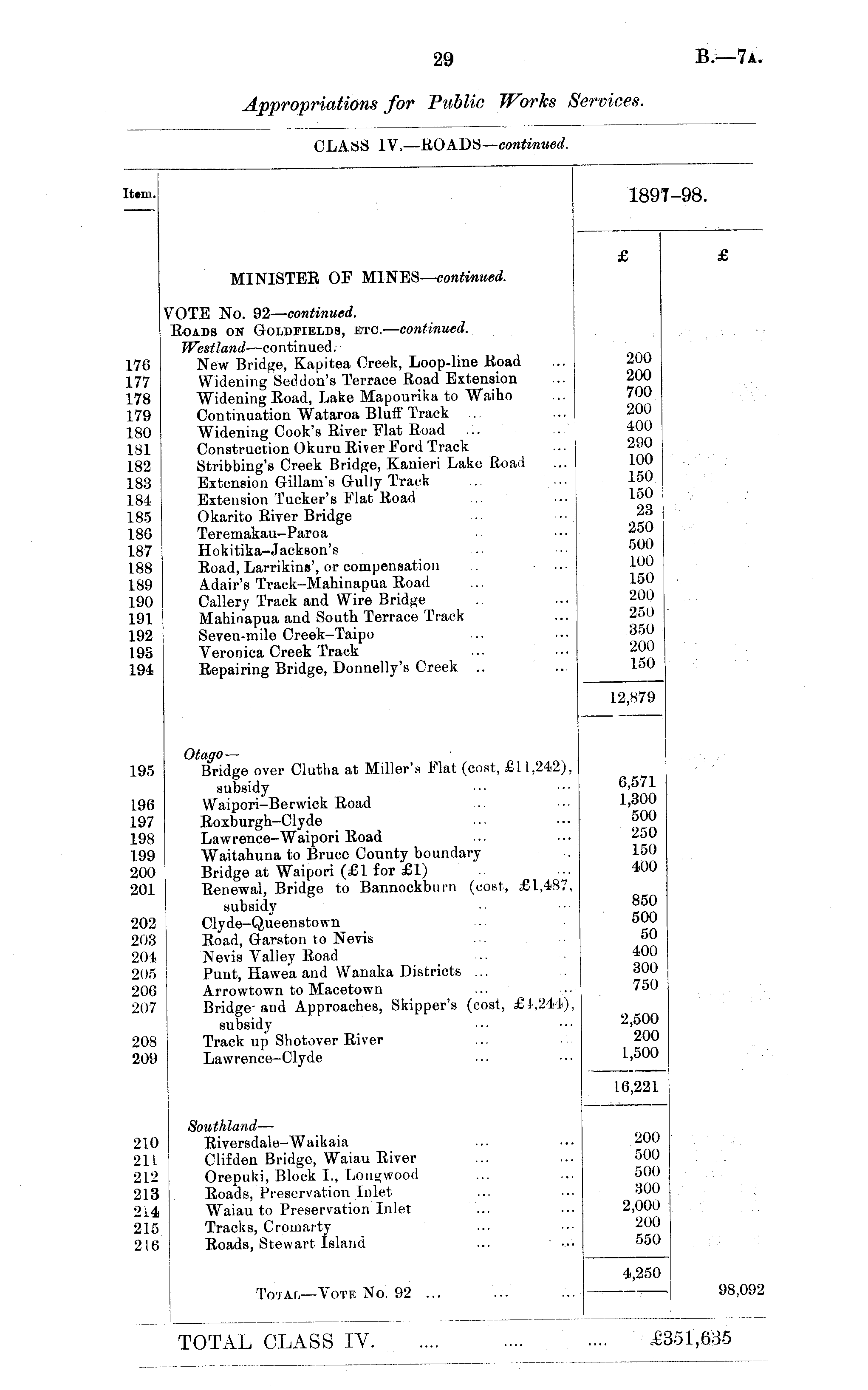 :t«n. 1897-98. MINISTEE OF MINES— continued. 176 177 178 179 180 181 182 183 184 185 186 187 188 189 190 191 192 193 194, VOTE No. 92— continued. Roads on Goldfields, etc. — continued. Westland —continued. New Bridge, Kapitea Creek, Loop-line Road Widening Seddon's Terrace Road Extension Widening Road, Lake Mapourika to Waiho Continuation Wataroa Bluff Track Widening Cook's River Plat Road ... Construction Okuru River Ford Track Stribbing's Creek Bridge, Kanieri Lake Road Extension G-illam's Gully Track Extension Tucker's Flat Road Okarito River Bridge Teremakau-Paroa Hokitika-Jackson's Road, Larrikins', or compensation Adair's Track-Mahinapua Road Gallery Track and Wire Bridge Mahinapua and South Terrace Track Seven-mile Creek-Taipo Veronica Creek Track Repairing Bridge, Donnelly's Creek .. 200 200 700 200 400 290 100 150 150 23 250 500 100 150 200 250 350 200 150 12,879 195 196 197 198 199 200 201 Otago — Bridge over Clutha at Miller's Flat (cost, £11,242), subsidy Waipori-Berwick Road Roxburgh-Clyde Lawrence-Waipori Road Waitahuna to Bruce County boundary Bridge at Wai pori (£1 for £1) Renewal, Bridge to Bannockburn (cost, £1,487, subsidy Clyde-Queen sto wn Road, Garston to Nevis Nevis Valley Road Punt, Hawea and Wanaka Districts ... Arrowtown to Macetown Bridge and Approaches, Skipper's (cost, £1,244!), su bsidy Track up Shotover River Lawrence-Clyde 6,571 1,300 500 250 150 400 850 500 50 400 300 750 202 203 201 205 206 207 208 209 2,500 200 1,500 16,221 210 21L 2L2 213 2i4 215 216 Southland — Riversdale-Waikaia Clifden Bridge, Waiau River Orepuki, Block I., Longwood Roads, Preservation Inlet Waiau to Preservation Inlet Tracks, ■Cromarty Roads, Stewart Island 200 500 500 300 2,000 200 550 To'iAr Vote No. 92 ... 4,250 98,09: TOTAL CLASS IV ;51,635