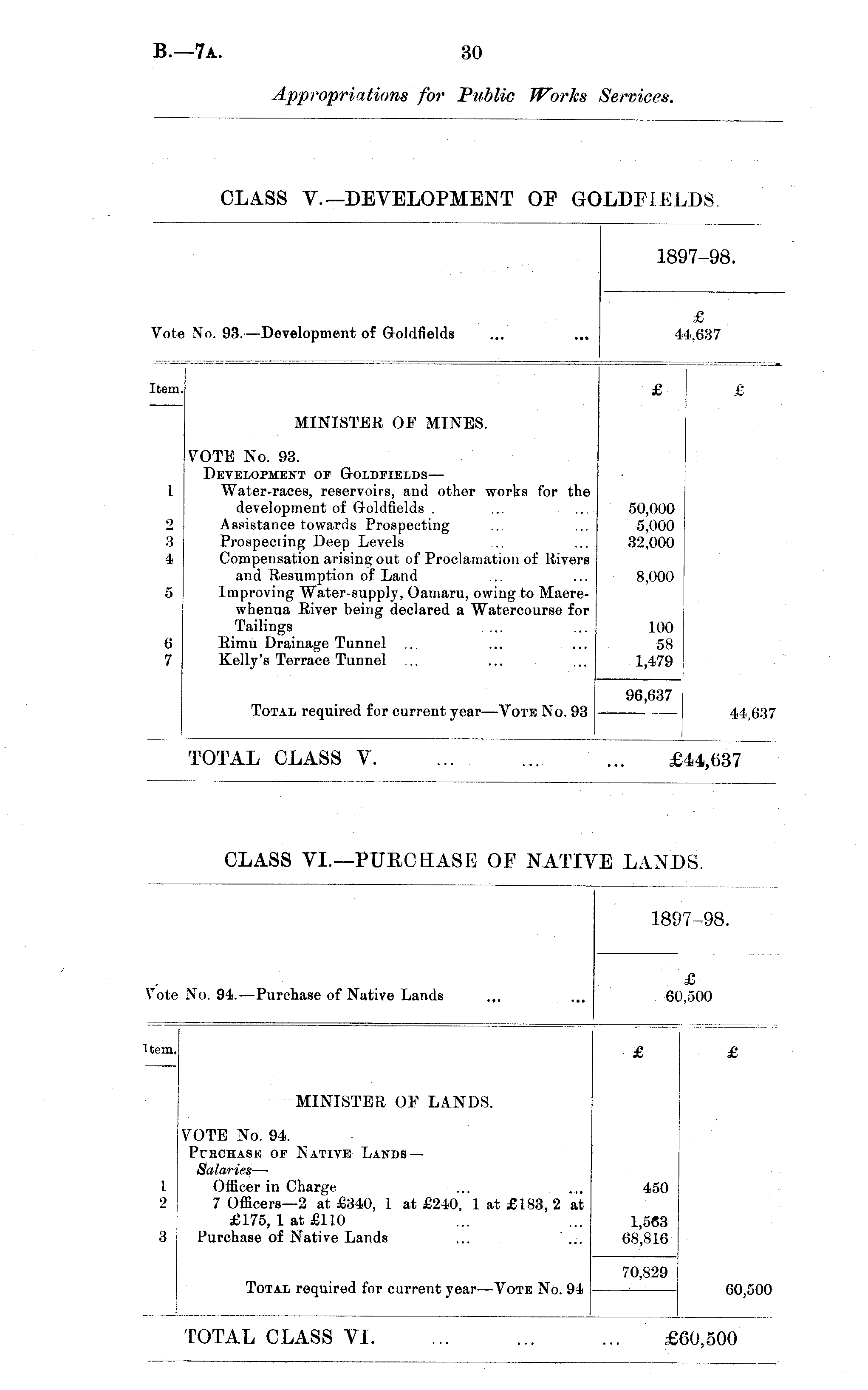 1897-98. Vote No. 94. —Purchase of Native Lands £ i,500 Item. MINISTER OF LANDS. £ £ 1 •> VOTE No. 94. Pubchask of Native Lands — Salaries — Officer in Charge 7 Officers—2 at £340, 1 at £240, 1 at £183, 2 at £175, 1 at £110 Purchase of Native Lands ... ... 450 60,500 a 1,563 68,816 Total required for current year—Vote No. 94 70,829 TOTAL CLASS VI. 160,500