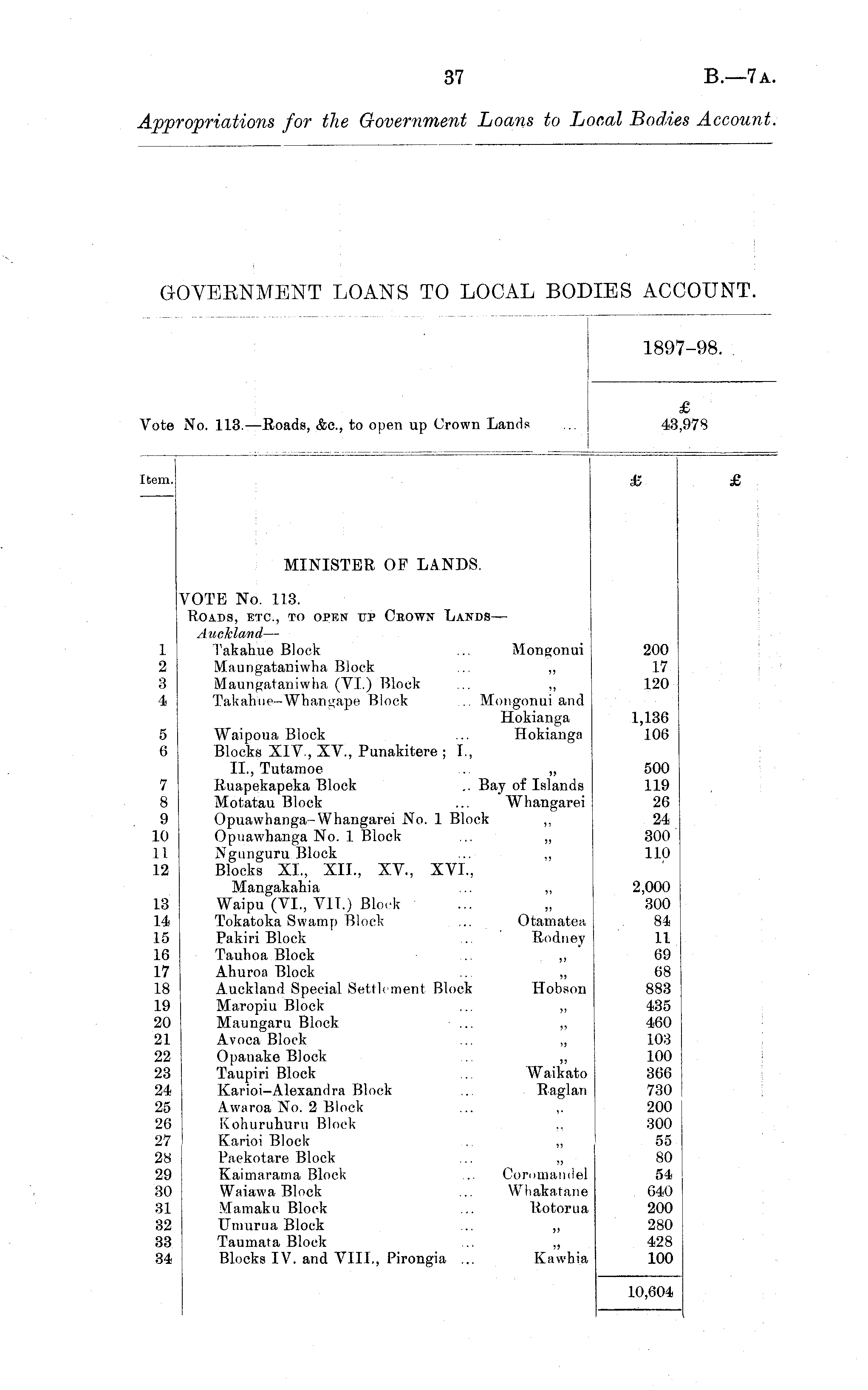 1897-98. . ote No. 113. —Roads, &c, to open up Crown Lands £ :,978 tem. £ £ MINISTER OF LANDS. 1 2 3 4 5 6 7 8 9 10 11 12 13 14 15 16 17 18 19 20 21 22 23 24 25 26 27 28 29 30 31 32 33 34 VOTE No. 113. ROADS, ETC., TO OPEN UP CrOWN LANDS Auckland — Takahue Block ... Mongonui Maungataniwha Block ... „ Maungataniwha (VI.) Block ... ,, Takahue— Wbany;apo Block .. Mongonui and Hokianga Waipoua Block ... Hokianga Blocks XIV., XV., Punakitere ; I., II., Tutamoe ... „ Ruapekapeka Block .. Bay of Islands Motatau Block ... Whangarei Opuawhanga-Whangarei No. 1 Block ,, Opuawhanga No. 1 Block ... „ Ngunguru Block ... ,. Blocks XI., XII., XV., XVI., Mangakahia ... ,, Waipu (VI., VII.) Block Tokatoka Swamp Block ... Otanaatea Pakiri Block . Rodney Tauhoa Block .. ,, Ahuroa Block ... „ Auckland Special Settlement Block Hobson Maropiu Block ... ,, Maungaru Block ... ,, Avoca Block ... „ Opanake Block ... ,, Taupiri Block ... Waikato Karioi-Alexandra Block ... Raglan Avvaroa No. 2 Block ... ,. Kohuruhuru Block ,, Karioi Block ., ,, Paekotare Block ... ,, Kaiuiarama Block ... Coromamiel Waiawa Block ... Whakatane Mamaku Block ... Rotorua Umurua Block ... „ Tauniata Block ... „ Blocks IV. and VIII., Pirongia ... Kawhia 200 17 120 1,136 106 500 119 26 24 300 110 2,000 300 84 11 69 68 883 435 460 103 100 366 730 200 300 55 80 54 640 200 280 428 100 10,604