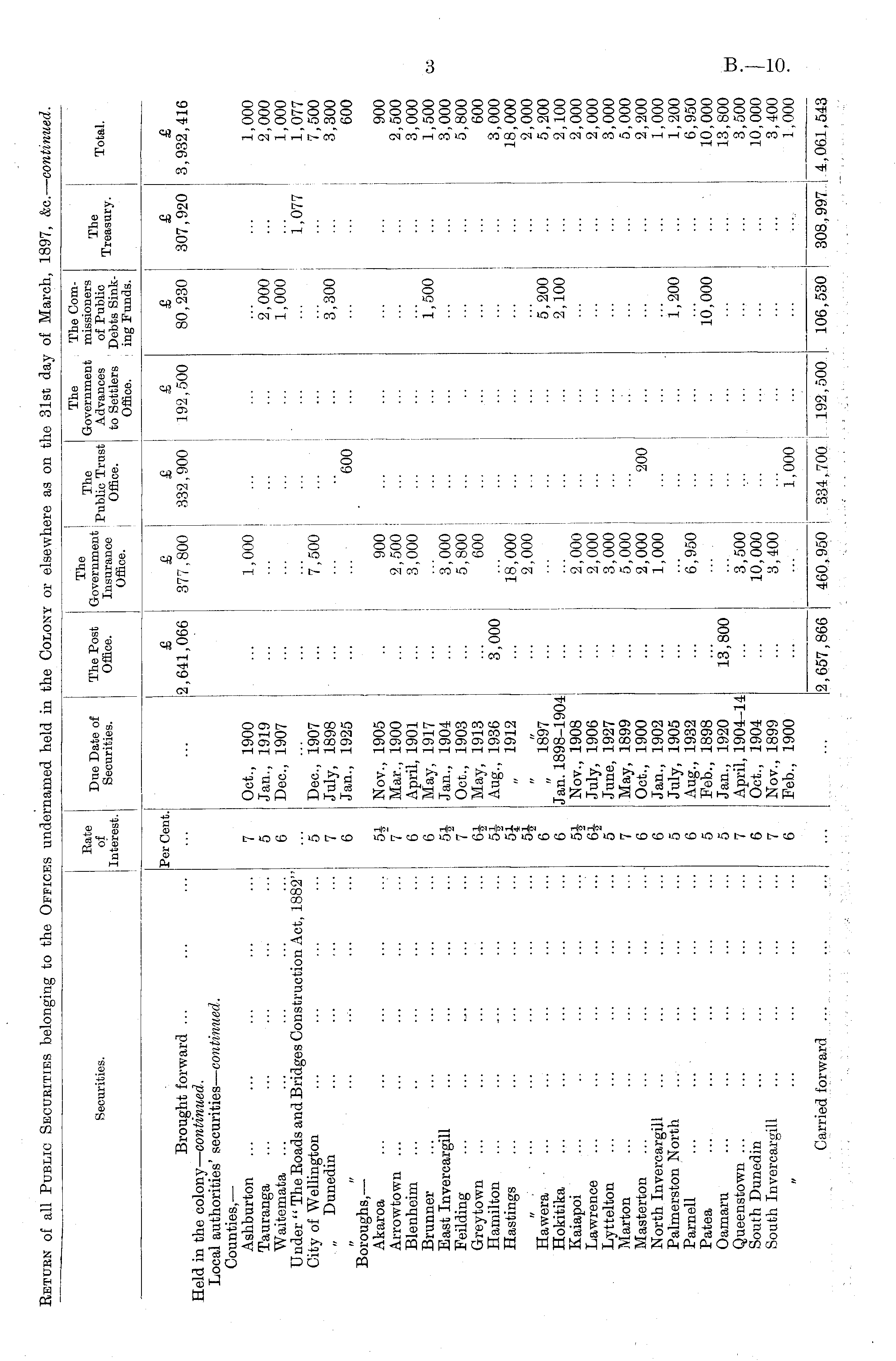 Securities. Bate Interest. Due Date of Securities. The Post Office. The The Government pbu Tt Insurance Qffi Office. The The CornGovernment missioners Advances of Public to Settlers Debts SinkOffice, ing Funds. The Treasury. Total. Brought forward ... Held in the colony — continued. Local authorities' securities — continued. Counties, — Ashburton Tauranga Waitemata ... Under " The Eoads and Bridges Construction Act, 1882" City of Wellington „ Dunedin PerCent. £ 2,641,066 £ 377,800 332,900 192,500 £ 80,230 £ 307,920 £ 3,932,416 7 5 6 Oct., 1900 Jan., 1919 Dec, 1907 1,000 2,000 1,000 1,000 2,000 1,000 1,077 7,500 3,300 600 ... ... ... ... 1,077 I 6* 7 6 ... Dec, 1907 July, 1898 Jan., 1925 ... ... 3,000 13,800 7,500 900 \ 2,500 J 3,000 3,000 5,800 600 18,000 2,000 2,000 2,000 3,000 5,000 2,000 1,000 6,960 3,500 10,000 3,400 i ■ "600 ... "200 ... 1,000 3,300 I It n • • ' ' ' • • • • Boroughs, — Akaroa Arrowtown ... Blenheim Brunner East Invercargill Feilding Grey town Hamilton Hastings 5| Sir 6 6 5 7 6 6 5 6 5 5 7 6 7 6 Nov., 1905 Mar., 1900 April, 1901 May, 1917 Jan., 1904 Oct., 1903 May, 1913 Aug., 1936 „ 1912 1,500 ... 900 2,500 3,000 1,500 3,000 5,800 600 3,000 18,000 2,000 5,200 2,100 2,000 2,000 3,000 5,000 2,200 1,000 1,200 6,950 10,000 13,800 3,500 10,000 3,400 1,000 ... Hawera ... Hokitika Kaiapoi Lawrence Lyttelton Marton Masterton ... ... ... ... ... North Invercargill ... ... ... Palmerston North Parnell ... ... Patea Oamaru Queenstown ... South Dunedin South Invercargill „ 1897 Jan.1898-1904 Nov., 1908 I July, 1906 I June, 1927 i May, 1899 Oct., 1900 Jan., 1902 July, 1905 Aug., 1932 Feb., 1898 Jan., 1920 April, 1904-14 Oct., 1904 Nov., 1899 Feb., 1900 5,200 2,100 1,200 io','ooo it • • - • * • ■■■ • • • Carried forward ... ... 12,657,866 460,950 j 334,700 i 192,500 106,530 308,997 [ 4,061,543