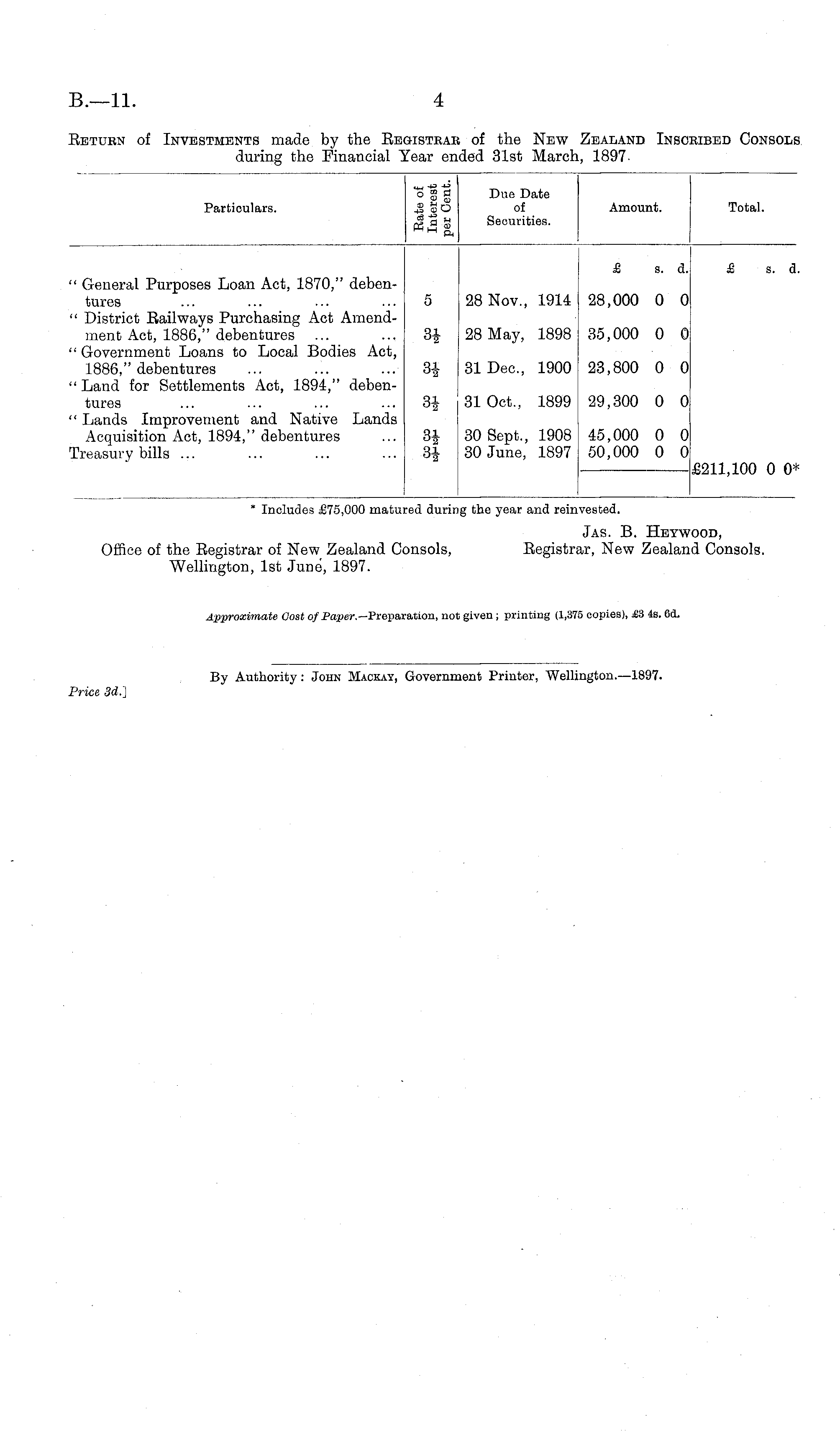 Jas. B. Heywood, Office of the Eegistrar of New Zealand Consols, Eegistrar, New Zealand Consols. Wellington, 1st June, 1897.
