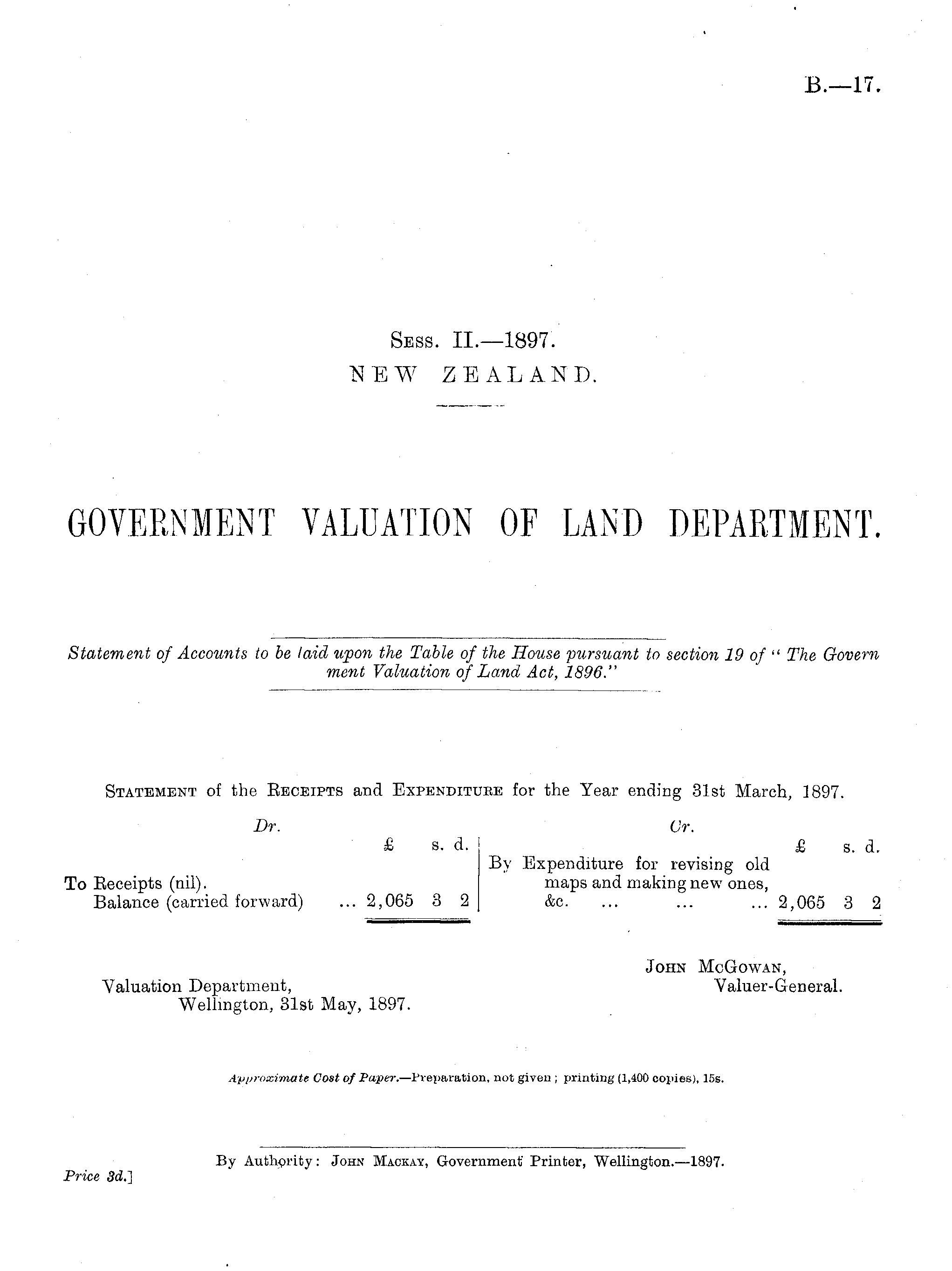 Statement of the Eeoeipts and Expenditure for the Year ending 31st March, 1897. Dr. Or. £ s. d. £ s. d. By Expenditure for revising old To Eeceipts (nil). maps and making new ones, Balance (carried forward) ... 2,065 3 2 &c. ... ... ... 2,065 3 2 John McGowan, Valuation Department, Valuer-General. Wellington, 31st May, 1897. Approximate Cost of Paper. —Preparation, not given ; printing (1,400 copies), 15s.