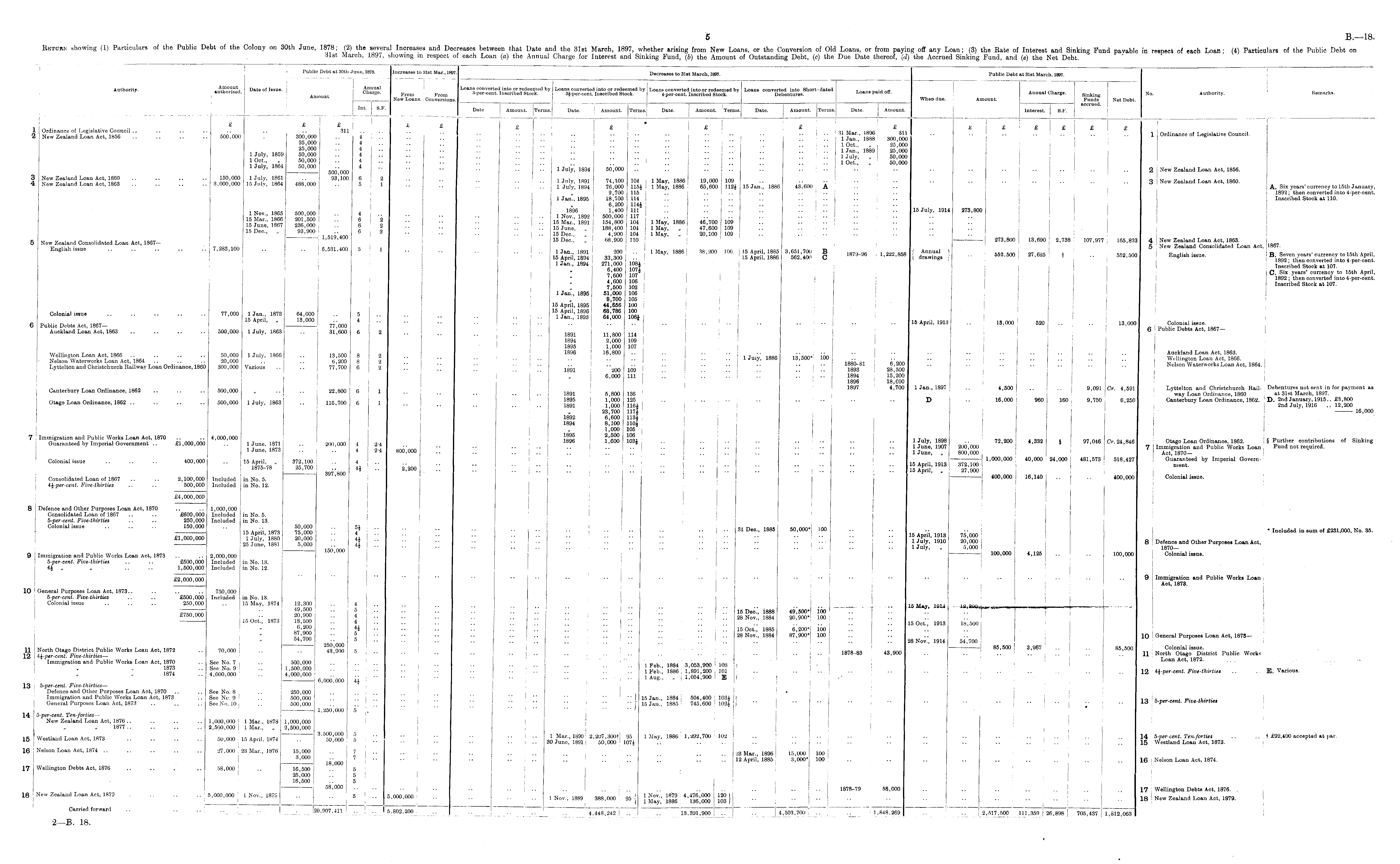 Public Debt at 30th Ji rune, 1878. Increases to 31st Mar., 1897. Decreases to 31st March, 1897. Public Debt at 31st March, 18ff7. Authority. Amount authorised. Date of Issue. iiint. Annual Charge. Loans converted into or redeemed by 3-per-cent. Inscribed Stock. Loans converted into or redeei 3J-per-cent. Inscribed Sto< med by Loans converted into or redeemed by -k. 4-per-cent. Inscribed Stock. Loans convert* Del jd into Short-dated ventures. Annual Charge. Sm]dng Ponds No. J Authority. Remarks. From From Now Loans. Conversions. Loans paid off. Ann Int. S.F. When due. Araoi int. Net Debt. .... Date Amount. Terms. Date. Amount. Amount. Terms. Date. Amount. Terms. Date. Amount. Terms. Date. Amount. Interest. S.F. I I Ordinance of Legislative Council .. I New Zealand Loan Act, 1856 £ £ £ 311 •fc £ £ £ H 31 Mar., 1896 ; 1 Jan., 1888 1 Oct., 1 Jan., 1889 1 J uly, 1 Oct., £ 31 300,000 25,000 25,000 50,000 50,000 ••! £ 2 4 4 4 4 4 4 £ £ £ £ £ £ 1 Ordinance of Legislative Council. 500,000 300,000 25,000 25,000 1 July, 1859 50,000 1 Oct., „ 50,000 1 July, 1864 50,000 .. .. 3 4 J New Zealand Loan Act, I860 I j New Zealand Loan Act, 1863 150,000 3,000.000 1 July, 1861 15 July, 1864 488,000 93,100 I ' I 1 July', 1894 5M00 1 July, 1891 74,100 1 July, 1894 76,000 2,700 1 Jan., 1895 18,700 6,200 1896 1,400 1 Nov., 1892 ' 500,000 15 Mar., 1891 I 154,800 15 June, „ 188,400 15 Dec, „ 4,900 15 Dec, „ I 68,900 104 115J 115 114 114J 111 117 104 104 104 110 i •• I 1 May, 1886 1 May, 1886 1 May, 1886 1 May, , 1 May, „ 19,000 109 65,600 112J 109 47,600 109 20,100 109 15 Jan., 1886 43,600 A 15 July, 1914 273,800 2 New Zealand Loan Act, 1856. 3 New Zealand Loan Act, 1860. A. Six years' currency to 15th January, 1892; then converted into 4-per-cent. Inscribed Stock at 110. 2 3 i New Zealand Consolidated Loan Act, 1867— English issue 1 Nov., 1865 500,000 15 Mar., 1866 201,500 15 June, 1867 236,000 15 Dec, „ 93,900 i 6 6 6 2 2 2 4 New Zealand Loan Act, 1863. 5 New Zealand Consolidated Loan Act. ! 1867. 1,519^400 1 273,800 2,738 I 107,977 6,531,400 5 1 15 April, 1888 15 April, 1886 3,651,700 B 562.40C C I Annual ) t drawings 13,690 165,82 4 6 7,2S3,1OO Uan., 1891 I 200 15 April, 1894 p 33,300 1 Jan., 1894 271,000 6,400 7,600 4,600 7,500 1 Jan., 1895 J 51.000 8,700 15 April, 1895 44,656 15 April, 1896 68,786 1 Jan., 1893 : 64,000 1 May, 1886 38,200 106 1879-96 1,222,85 552,500 27.625 § 552,500 108J 107} 107 106 102 106 105 100 100 106J 107} 107 106 English issue. j B. Seven years'currency to 15th April. 1892; then converted into 4-per-cent. Inscribed Stock at 107. C. Six years' currency to 15th April, 1892 ; then converted into 4-per-cent. Inscribed Stock at 107. Colonial issue 102 I 77,000 1 Jan., 1873 15 April, „ 64,000 13,000 31,600 S 4 1 .. Colonial issue. 6 Public Debts Act, 1867— Auckland Loan Act, 1863. Wellington Loan Act, 1866. Nelson Waterworks Loan Act, 1864. Public Debts Act, 1867— Auckland Loan Act, 1863 500,000 15 April, 1913 13,000 520 13,000 1 July, 1868 6 2 1891 11,800 1894 2,000 1895 1,000 1896 16,800 114 109 107 Wellington Loan Act, 1866 Nelson Waterworks Loan Act, 1864 Lyttelton and Christchurch Railway Loan Ordinance, 1860 50,000 20,000 300,000 1 July, 1866 Various 13,500 6,200 77,700 .. 1 July, 1886 13 \ 500- 100 8 8 6 2 2 2 1880-81 1893 1894 1896 1897 6,200 23,500 15,200 18,600 4,700 1891 "200 6,000 109 111 I .. 1 Jan., 1897 9,091 Canterbury Loan Ordinance, 1862 500,000 22,800 136 125 116J 117J 113J 110J 105 106 1034 4,500 Cr. 4,591 Lyttelton and Christchurch Rail- Debentures not sent in for payment as way Loan Ordinance, 1860 at 31st March, 1897. Canterbury Loan Ordinance, 1862. D. 2nd January, 1915.. £3,800 2nd July, 1916 .. 12,200 16,000 6 1 1891 5,800 1895 1,000 1891 1,000 23,700 1892 6,600 1894 8,100 1,000 1895 2,500 1896 1,000 Otago Loan Ordinance, 1862 500,000 1 July, 1863 116,700 6 1 D 16,000 960 160 9,750 6,250 ' " Immigration and Public Works Loan Act, 1870 .. ., I Guaranteed by Imperial Government .. £1,000,000 j 4,000,000 1 June, 1871 1 June, 1873 1 July, 1898 1 June, 1907 1 June, 200,000 4 4 2-4 2-4 800,000 72,200 200,000 800,000 1 1,000,000 I 372,100 •' 27,900 ! ; 400,000 4,332 § 97,046 Cr. 24,846 Otago Loan Ordinance, 1862. I § Further contributions of Sinking 7 J Immigration and Public Works Loan Fund not required. ! Act, 1870— Guaranteed by Imperial Government. I Colonial issue .. .. .. 400,000 15 April, „ 1875-78 372,100 25,700 4 2,200 5 April, 1913 5 April, . 40,000 24,000 481,573 518,427 Consolidated Loan of 1867 .. .. 2,100,000 Five-thirties .. .. 500,000 £4,000,000 Included Included 397^800 I 16,140 400,000 Colonial issue. in No. 5. in No. 12. I Defence and Obher Purposes Loan Act, 1870 Consolidated Loan of 1867 .. .. £600,000 5-per-cent. Five-thirties .. .. 250,000 Colonial issue .. .. .. 150,000 £1,000,000 1,000,000 Included Included in No. 5. in No. 13. * Included in sum of £231,000, No. 35. 15 April, 1873 1 July, 1880 25 June, 1881 50,000 I 75,000 I I 20,000 5,000 H H 81 Dec, 1885 50,000* 100 .. 15 April, 1913 1 July, 1910 1 July, » 78,000 20,000 5,000 1 100,000 4,125 .. .. 100,000 Immigration and Public Works Loan Act, 1873 b-per-cent. Five-thirties .. .. £500,000 4J „ » .. .. 1,500,000 £2,000,000 2,000,000 Included Included 150,000 ' 8 Defence and Other Purposes Loan Act, 1870— Colonial issue. in No. 18. in No. 12. 4,125 100,000 750,000 Included in No. 18. 15 May, 1874 9 Immigration and Public Works Loan Aot, 1873. 10 General Purposes Loan Act, 1873 b-per-cent. Five-thirties .. .. £500,000 Colonial issue .. .. .. 250,000 £750,000 12,300 49,500 20,900 18,800 6,200 87,900 54,700 15 Oct.! 1873 4 5 4 i H 5 5 ' } . "" ' .'■ ■■ 15 Dec.', 1888 28 Nov., 1884 15 Oct., 1885 28 Nov., 1884 49,500-' 100 20,900' 100 6\200* 100 .'. 87,900* 100 5 Iky, 1911 5 Oct., 1913 v^mm^mmm 18,500 J 85,500 3,967 .. .. 85,500 North Otago District Public Works Loan Aot, 1872 l$-per-cent. Five-thirties — Immigration and Publ