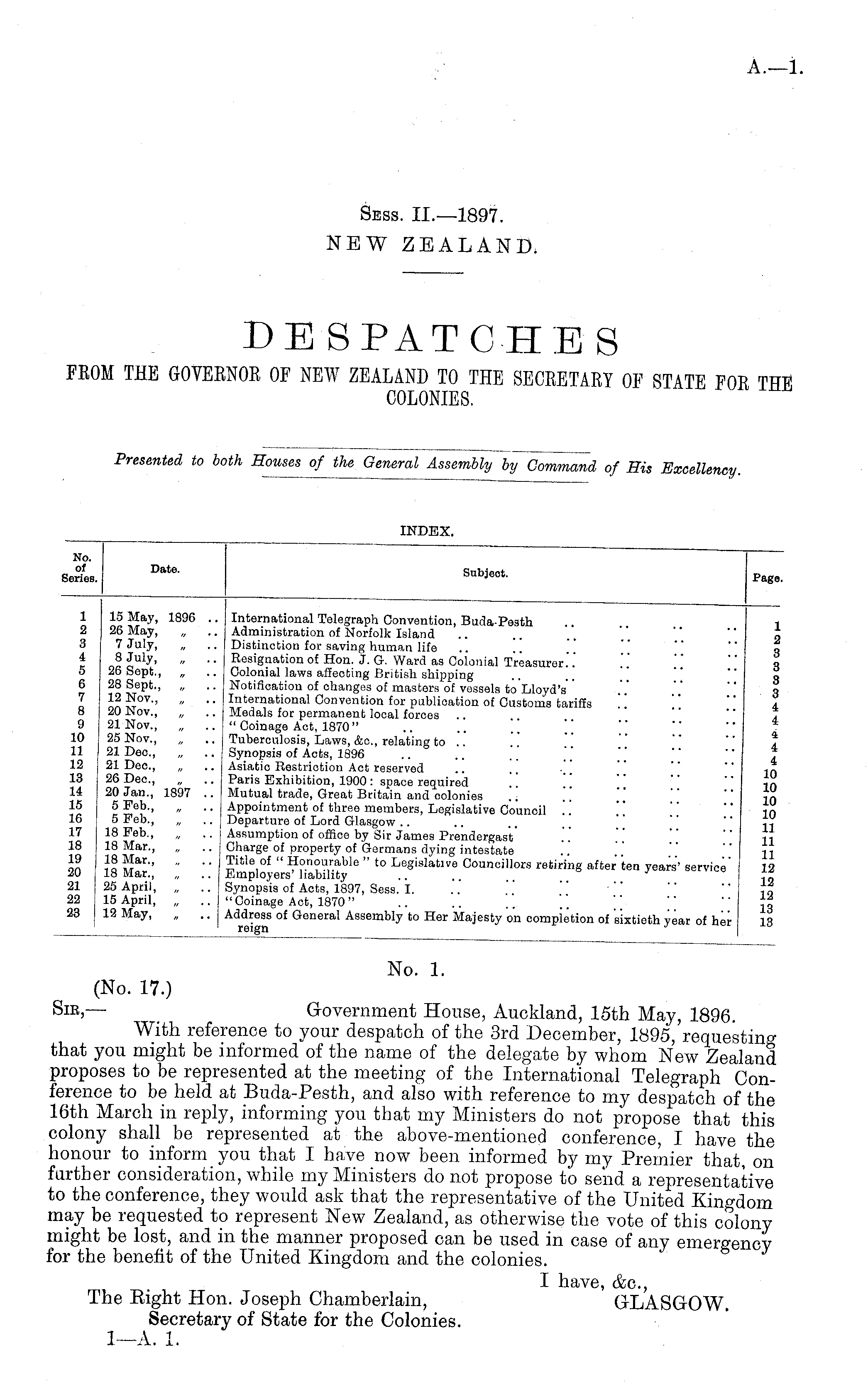 No. 1. (No. 17.) SlE , — Government House, Auckland, 15th May, 1896. With reference to your despatch of the 3rd December, 1895, requesting that you might be informed of the name of the delegate by whom New Zealand proposes to be represented at the meeting of the International Telegraph Conference to be held at Buda-Pesth, and also with reference to my despatch of the 16th March in reply, informing you that my Ministers do not propose that this colony shall be represented at the above-mentioned conference, I have the honour to inform you that I have now been informed by my Premier that, on farther consideration, while my Ministers do not propose to send a representative to the conference, they would ask that the representative of the United Kingdom may be requested to represent New Zealand, as otherwise the vote of this colony might be lost, and in the manner proposed can be used in case of any emergency for the benefit of the United Kingdom and the colonies. I have, &c, The Eight Hon. Joseph Chamberlain, GLASGOW. Secretary of State for the Colonies. I—A. 1.