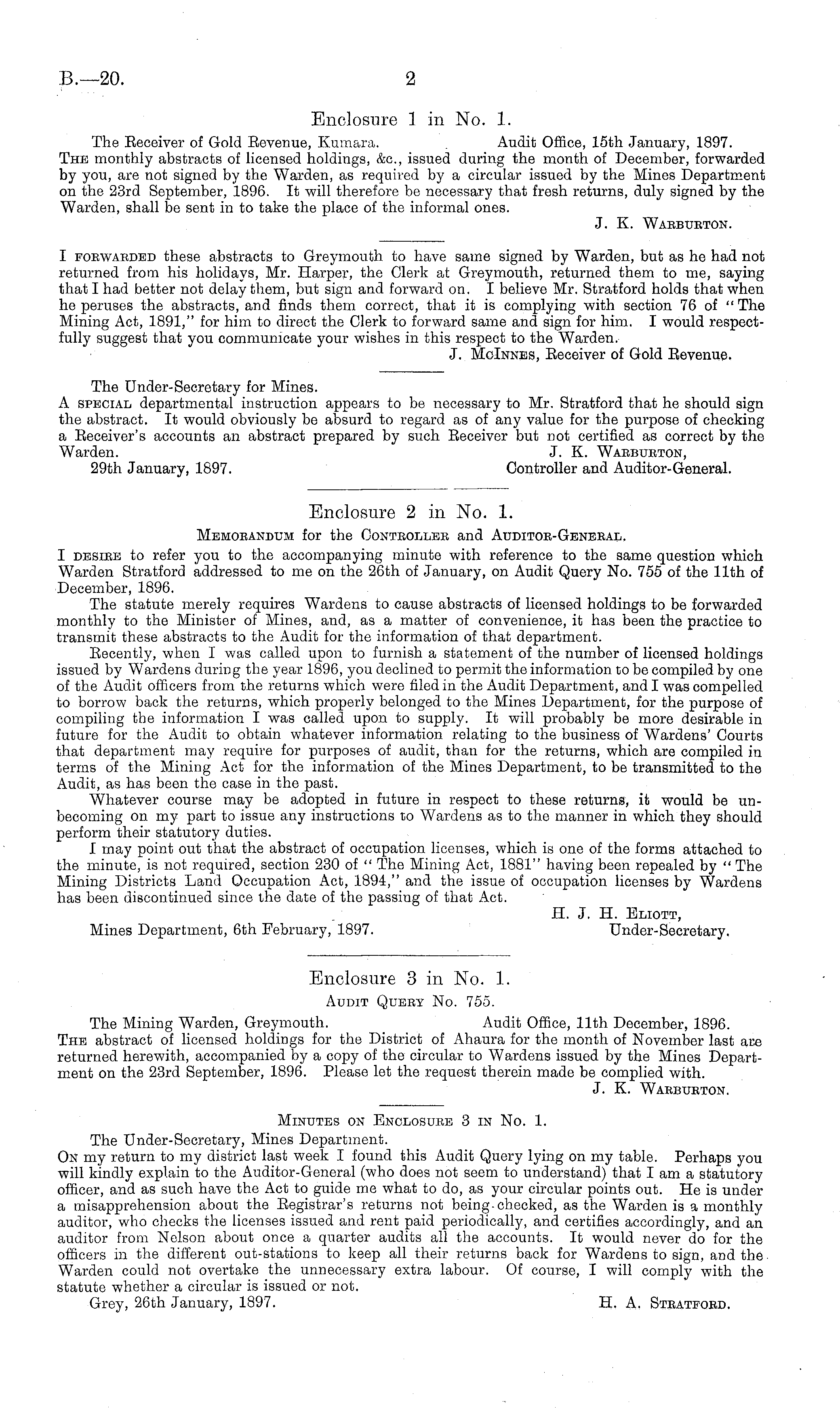 Minutes on Enclosure 3 in No. 1. The Under-Secretary, Mines Department. On my return to my district last week I found this Audit Query lying on my table. Perhaps you will kindly explain to the Auditor-General (who does not seem to understand) that I am a statutory officer, and as such have the Act to guide me what to do, as your circular points out. He is under a misapprehension about the Eegistrar's returns not being-checked, as the Warden is a monthly auditor, who checks the licenses issued and rent paid periodically, and certifies accordingly, and an auditor from Nelson about once a quarter audits all the accounts. It would never do for the officers in the different out-stations to keep all their returns back for Wardens to sign, and the Warden could not overtake the unnecessary extra labour. Of course, I will comply with the statute whether a circular is issued or not. Grey, 26th January, 1897. H. A. Stratford.