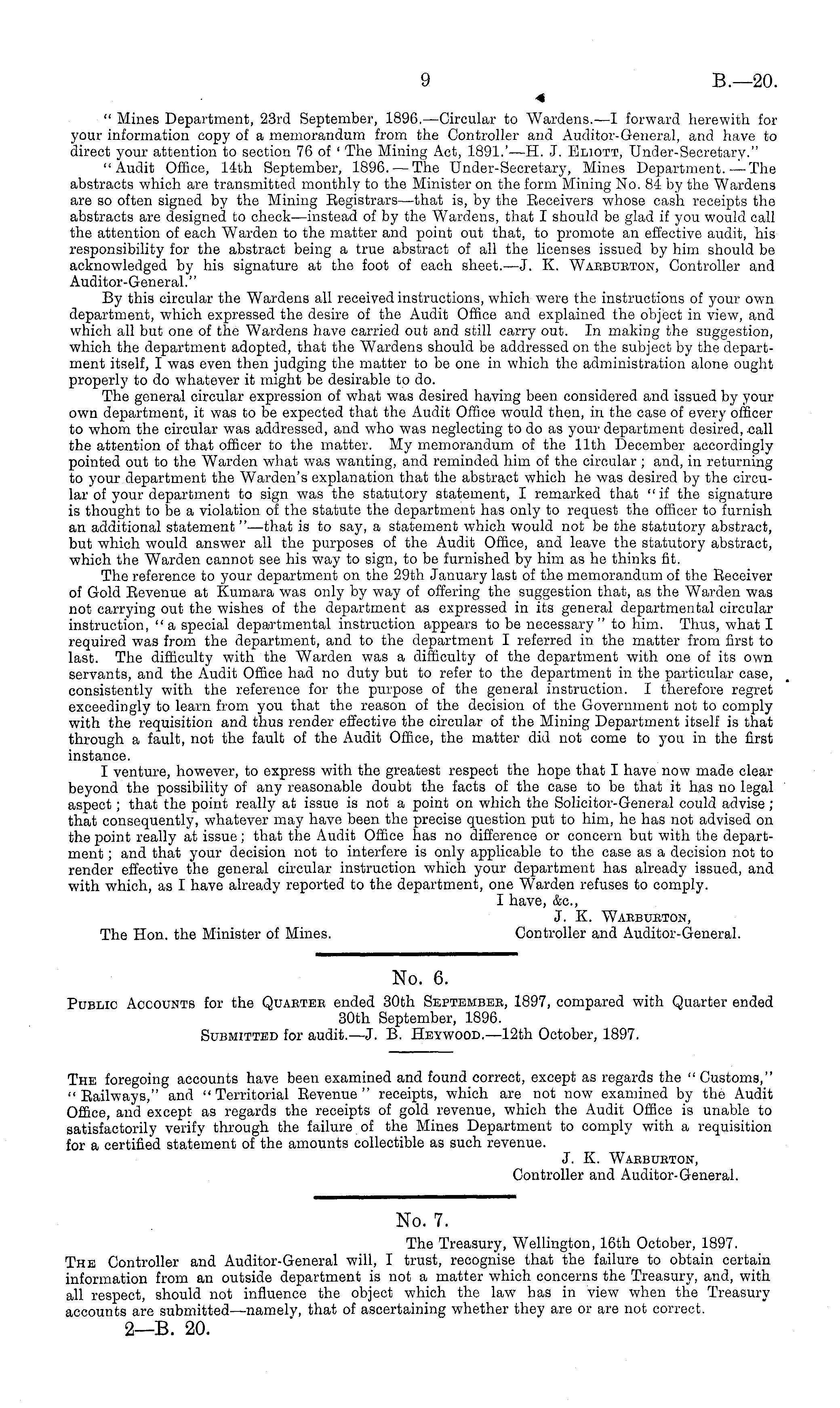 " Mines Department, 23rd September, 1896.—Circular to Wardens.—l forward herewith for your information copy of a memorandum from the Controller and Auditor-General, and have to direct your attention to section 76 of ' The Mining Act, 1891.'— H. J. Eliott, Under-Secretary." "Audit Office, 14th September, 1896. — The Under-Secretary, Mines Department.—The abstracts which are transmitted monthly to the Minister on the form Mining No. 84 by the Wardens are so often signed by the Mining Eegistrars—that is, by the Eeceivers whose cash receipts the abstracts are designed to check—instead of by the Wardens, that I should be glad if you would call the attention of each Warden to the matter and point out that, to promote an effective audit, his responsibility for the abstract being a true abstract of all the licenses issued by him should be acknowledged by his signature at the foot of each sheet.—J. K. Warburton, Controller and Auditor-General.'' By this circular the Wardens all received instructions, which were the instructions of your own department, which expressed the desire of the Audit Office and explained the object in view, and which all but one of the Wardens have carried out and still carry out. In making the suggestion, which the department adopted, that the Wardens should be addressed on the subject by the department itself, I was even then judging the matter to be one in which the administration alone ought properly to do whatever it might be desirable to do. The general circular expression of what was desired having been considered and issued by your own department, it was to be expected that the Audit Office would then, in the case of every officer to whom the circular was addressed, and who was neglecting to do as your department desired, .call the attention of that officer to the matter. My memorandum of the 11th December accordingly pointed out to the Warden what was wanting, and reminded him of the circular ; and, in returning to your department the Warden's explanation that the abstract which he was desired by the circular of your department to sign was the statutory statement, I remarked that "if the signature is thought to be a violation of the statute the department has only to request the officer to furnish an additional statement " —that is to say, a statement which would not be the statutory abstract, but which would answer all the purposes of the Audit Office, and leave the statutory abstract, which the Warden cannot see his way to sign, to be furnished by him as he thinks fit. The reference to your department on the 29th January last of the memorandum of the Eeceiver of Gold Eevenue at Kumara was only by way of offering the suggestion that, as the Warden was not carrying out the wishes of the department as expressed in its general departmental circular instruction, "a special departmental instruction appears to be necessary" to him. Thus, what I required was from the department, and to the department I referred in the matter from first to last. The difficulty with the Warden was a difficulty of the department with one of its own servants, and the Audit Office had no duty but to refer to the department in the particular case, consistently with the reference for the purpose of the general instruction. I therefore regret exceedingly to learn from you that the reason of the decision of the Government not to comply with the requisition and thus render effective the circular of the Mining Department itself is that through a fault, not the fault of the Audit Office, the matter did not come to you in the first instance. I venture, however, to express with the greatest respect the hope that I have now made clear beyond the possibility of any reasonable doubt the facts of the case to be that it has no legal aspect; that the point really at issue is not a point on which the Solicitor-General could advise; that consequently, whatever may have been the precise question put to him, he has not advised on the point really at issue; that the Audit Office has no difference or concern but with the department ; and that your decision not to interfere is only applicable to the case as a decision not to render effective the general circular instruction which your department has already issued, and with which, as I have already reported to the department, one Warden refuses to comply. I have, &c, J. K. Warburton, The Hon. the Minister of Mines. Controller and Auditor-General.