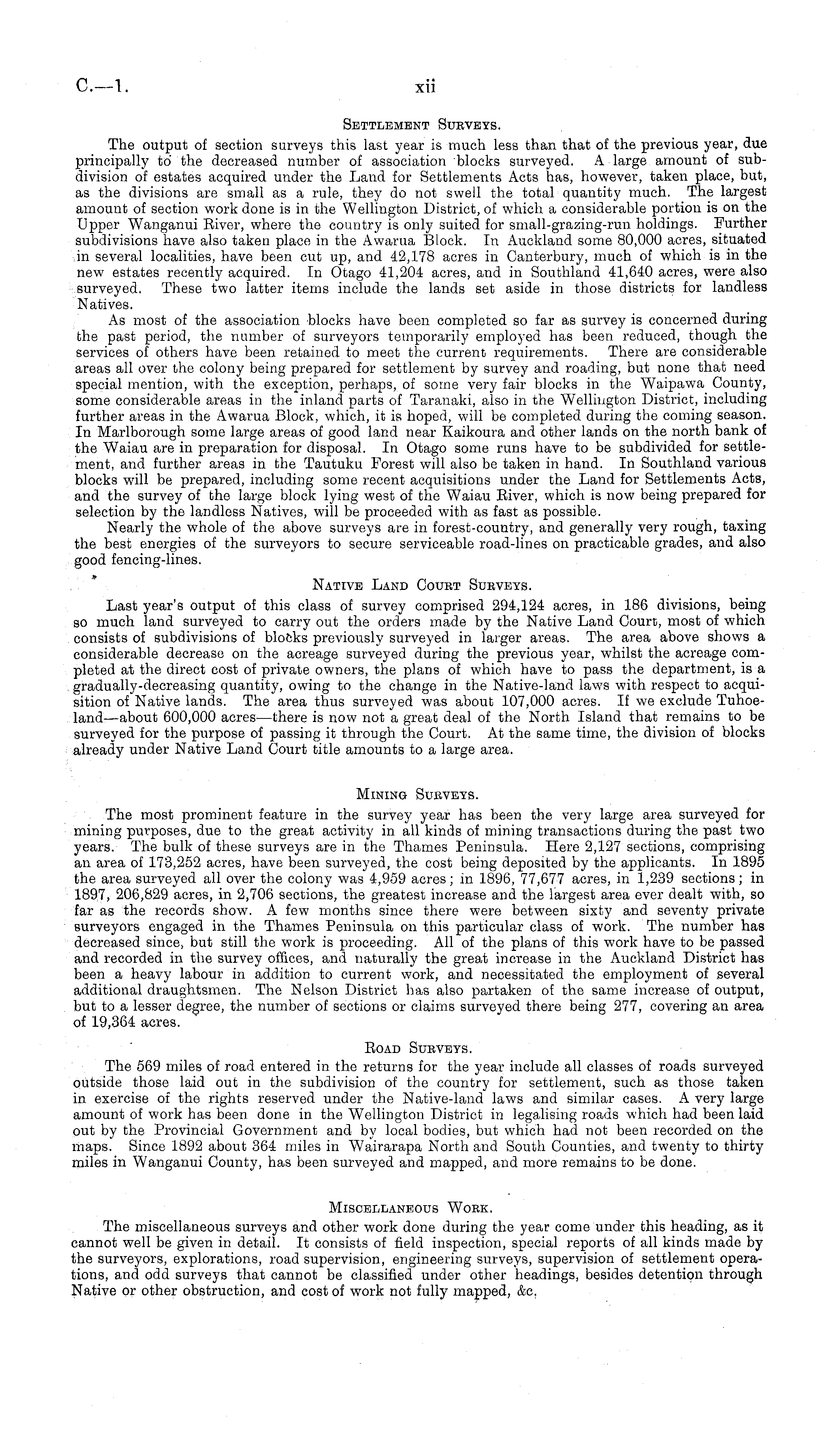 Settlement Surveys. The output of section surveys this last year is much less than that of the previous year, due principally to the decreased number of association blocks surveyed. A large amount of subdivision of estates acquired under the Land for Settlements Acts has, however, taken place, but, as the divisions are small as a rule, they do not swell the total quantity much. The largest amount of section work done is in the Wellington District, of which a considerable portion is on the Upper Wanganui Eiver, where the country is only suited for small-grazing-run holdings. Further subdivisions have also taken place in the Awarua Block. In Auckland some 80,000 acres, situated in several localities, have been cut up, and 42,178 acres in Canterbury, much of which is in the new estates recently acquired. In Otago 41,204 acres, and in Southland 41,640 acres, were also surveyed. These two latter items include the lands set aside in those districts for landless Natives. As most of the association blocks have been completed so far as survey is concerned during the past period, the number of surveyors temporarily employed has been reduced, though the services of others have been retained to meet the current requirements. There are considerable areas all over the colony being prepared for settlement by survey and roading, but none that need special mention, with the exception, perhaps, of some very fair blocks in the Waipawa County, some considerable areas in the inland parts of Taranaki, also in the Wellington District, including further areas in the Awarua Block, which, it is hoped, will be completed during the coming season. In Marlborough some large areas of good land near Kaikoura and other lands on the north bank of the Waiau are in preparation for disposal. In Otago some runs have to be subdivided for settlement, and further areas in the Tautuku Forest will also be taken in hand. In Southland various blocks will be prepared, including some recent acquisitions under the Land for Settlements Acts, and the survey of the large block lying west of the Waiau Eiver, which is now being prepared for selection by the landless Natives, will be proceeded with as fast as possible. Nearly the whole of the above surveys are in forest-country, and generally very rough, taxing the best energies of the surveyors to secure serviceable road-lines on practicable grades, and also good fencing-lines. Native Land Court Surveys. Last year's output of this class of survey comprised 294,124 acres, in 186 divisions, being so much land surveyed to carry out the orders made by the Native Land Court, most of which consists of subdivisions of blocks previously surveyed in larger areas. The area above shows a considerable decrease on the acreage surveyed during the previous year, whilst the acreage completed at the direct cost of private owners, the plans of which have to pass the department, is a gradually-decreasing quantity, owing to the change in the Native-land laws with respect to acquisition of Native lands. The area thus surveyed was about 107,000 acres. If we exclude Tuhoeland—about 600,000 acres —there is now not a great deal of the North Island that remains to be surveyed for the purpose of passing it through the Court. At the same time, the division of blocks already under Native Land Court title amounts to a large area. Mining Surveys. The most prominent feature in the survey year has been the very large area surveyed for mining purposes, due to the great activity in all kinds of mining transactions during the past two years. The bulk of these surveys are in the Thames Peninsula. Here 2,127 sections, comprising an area of 173,252 acres, have been surveyed, the cost being deposited by the applicants. In 1895 the area surveyed all over the colony was 4,959 acres; in 1896, 77,677 acres, in 1,239 sections; in 1897, 206,829 acres, in 2,706 sections, the greatest increase and the largest area ever dealt with, so far as the records show. A few months since there were between sixty and seventy private surveyors engaged in the Thames Peninsula on this particular class of work. The number has decreased since, but still the work is proceeding. All of the plans of this work have to be passed and recorded in the survey offices, and naturally the great increase in the Auckland District has been a heavy labour in addition to current work, and necessitated the employment of several additional draughtsmen. The Nelson District has also partaken of the same increase of output, but to a lesser degree, the number of sections or claims surveyed there being 277, covering an area of 19,364 acres. Eoad Surveys. The 569 miles of road entered in the returns for the year include all classes of roads surveyed outside those laid out in the subdivision of the country for settlement, such as those taken in exercise of the rights reserved under the Native-land laws and similar cases. A very large amount of work has been done in the Wellington District in legalising roads which had been laid out by the Provincial Government and by local bodies, but which had not been recorded on the maps. Since 1892 about 364 miles in Wairarapa North and South Counties, and twenty to thirty miles in Wanganui County, has been surveyed and mapped, and more remains to be done. Miscellaneous Work. The miscellaneous surveys and other work done during the year come under this heading, as it cannot well be given in detail. It consists of field inspection, special reports of all kinds made by the surveyors, explorations, road supervision, engineering surveys, supervision of settlement operations, and odd surveys that cannot be classified under other headings, besides detention through Native or other obstruction, and cost of work not fully mapped, &c.