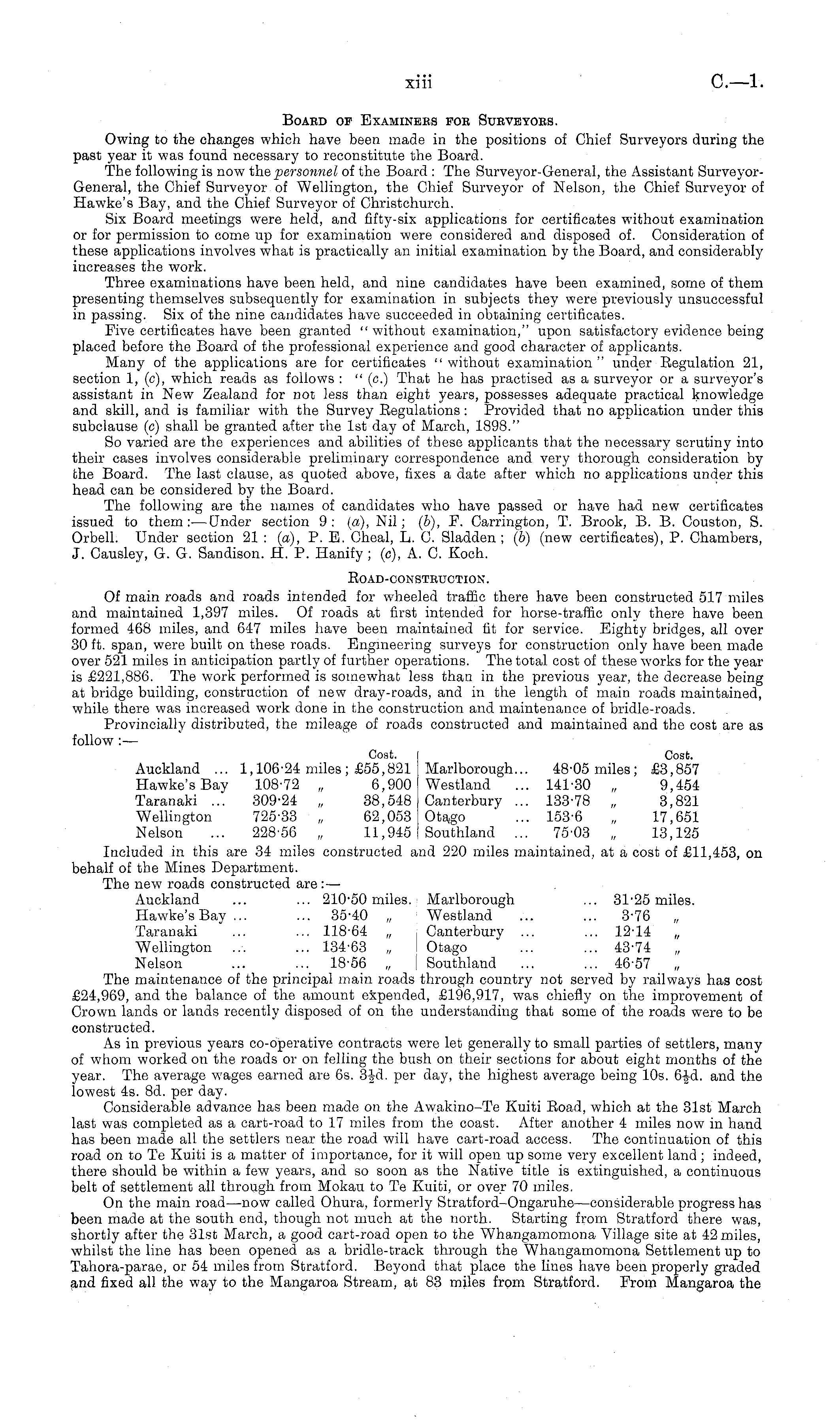 Board op Examiners for Surveyors. Owing to the changes which have been made in the positions of Chief Surveyors during the past year it was found necessary to reconstitute the Board. The following is now the personnel of the Board : The Surveyor-General, the Assistant SurveyorGeneral, the Chief Surveyor of Wellington, the Chief Surveyor of Nelson, the Chief Surveyor of Hawke's Bay, and the Chief Surveyor of Christchurch. Six Board meetings were held, and fifty-six applications for certificates without examination or for permission to come up for examination were considered and disposed of. Consideration of these applications involves what is practically an initial examination by the Board, and considerably increases the work. Three examinations have been held, and nine candidates have been examined, some of them presenting themselves subsequently for examination in subjects they were previously unsuccessful in passing. Six of the nine candidates have succeeded in obtaining certificates. Five certificates have been granted "without examination," upon satisfactory evidence being placed before the Board of the professional experience and good character of applicants. Many of the applications are for certificates " without examination " under Eegulation 21, section 1, (c), which reads as follows : " (c) That he has practised as a surveyor or a surveyor's assistant in New Zealand for not less than eight years, possesses adequate practical knowledge and skill, and is familiar with the Survey Begulations : Provided that no application under this subclause (c) shall be granted after the Ist day of March, 1898." So varied are the experiences and abilities of these applicants that the necessary scrutiny into their cases involves considerable preliminary correspondence and very thorough consideration by the Board. The last clause, as quoted above, fixes a date after which no applications under this head can be considered by the Board. The following are the names of candidates who have passed or have had new certificates issued to them:—Under section 9: (a), Nil; (b), F. Carrington, T. Brook, B. B. Couston, S. Orbell. Under section 21 : (a), P. E. Cheal, L. C. Sladden ; (&) (new certificates), P. Chambers, J. Causley, G. G. Sandison. H. P. Hanify ; (c), A. C. Koch. EOAD-CONSTRUCTION. Of main roads and roads intended for wheeled traffic there have been constructed 517 miles and maintained 1,397 miles. Of roads at first intended for horse-traffic only there have been formed 468 miles, and 647 miles have been maintained fit for service. Eighty bridges, all over 30 ft. span, were built on these roads. Engineering surveys for construction only have been made over 521 miles in anticipation partly of further operations. The total cost of these works for the year is £221,886. The work performed is somewhat less than in the previous year, the decrease being at bridge building, construction of new dray-roads, and in the length of main roads maintained, while there was increased work done in the construction and maintenance of bridle-roads. Provincially distributed, the mileage of roads constructed and maintained and the cost are as follow :— Cost. Cost. Auckland ... 1,106-24 miles; £55,821 Marlborough... 48-05 miles; £3,857 Hawke's Bay 108-72 „ 6,900 Westland ... 141-30 „ 9,454 Taranaki ... 309-24 „ 38,548 Canterbury ... 133-78 „ 3,821 Wellington 725-33 „ 62,053 Otago ... 153-6 „ 17,651 Nelson ... 228-56 „ 11,945 Southland ... 75-03 „ 13,125 Included in this are 34 miles constructed and 220 miles maintained, at a cost of £11,453, on behalf of the Mines Department. The new roads constructed are: — Auckland ... ... 210-50 miles. Marlborough ... 31-25 miles. Hawke's Bay ... ... 35-40 „ Westland ... ... 3-76 „ Taranaki ... ... 118-64 „ , Canterbury ... ... 12-14 „ Wellington ... ... 134-63 „ I Otago ... ... 43-74 Nelson ... ... 18-56 „ \ Southland ... ... 4657 „ The maintenance of the principal main roads through country not served by railways has cost £24,969, and the balance of the amount expended, £196,917, was chiefly on the improvement of Crown lands or lands recently disposed of on the understanding that some of the roads were to be constructed. As in previous years co-operative contracts were let generally to small parties of settlers, many of whom worked on the roads or on felling the bush on their sections for about eight months of the year. The average wages earned are 6s. 3id. per day, the highest average being 10s. 6fd. and the lowest 4s. Bd. per day. Considerable advance has been made on the Awakino-Te Kuiti Eoad, which at the Slst March last was completed as a cart-road to 17 miles from the coast. After another 4 miles now in hand has been made all the settlers near the road will have cart-road access. The continuation of this road on to Te Kuiti is a matter of importance, for it will open up some very excellent land ; indeed, there should be within a few years, and so soon as the Native title is extinguished, a continuous belt of settlement all through from Mokau to Te Kuiti, or over 70 miles, On the main road —now called Ohura, formerly Stratford-Ongaruhe —considerable progress has been made at the south end, though not much at the north. Starting from Stratford there was, shortly after the 31st March, a good cart-road open to the Whangamomona Village site at 42 miles, whilst the line has been opened as a bridle-track through the Whangamomona Settlement up to Tahora-parae, or 54 miles from Stratford. Beyond that place the lines have been properly graded and fixed all the way to the Mangaroa Stream, at 83 miles from Stratford. From Mangaroa the