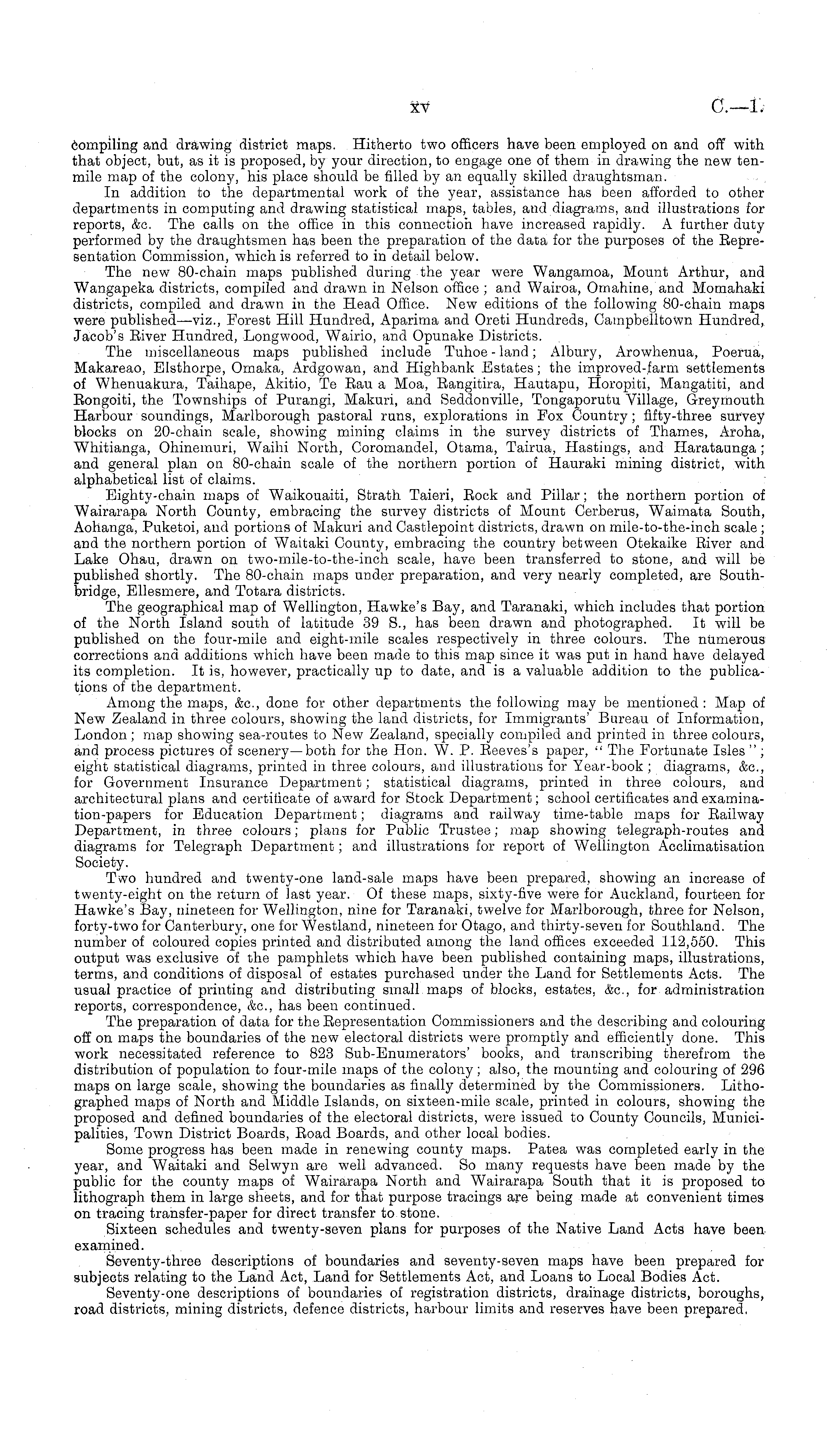 compiling and drawing district maps. Hitherto two officers have been employed on and off with that object, but, as it is proposed, by your direction, to engage one of them in drawing the new tenmile map of the colony, his place should be filled by an equally skilled draughtsman. In addition to the departmental work of the year, assistance has been afforded to other departments in computing and drawing statistical maps, tables, and diagrams, and illustrations for reports, &c. The calls on the office in this connection have increased rapidly. A further duty performed by the draughtsmen has been the preparation of the data for the purposes of the Bepresentation Commission, which is referred to in detail below. The new 80-chain maps published during the year were Wangamoa, Mount Arthur, and Wangapeka districts, compiled and drawn in Nelson office ; and Wairoa, Omahine, and Momahaki districts, compiled and drawn in the Head Office. New editions of the following 80-chain maps were published —viz., Forest Hill Hundred, Aparima and Oreti Hundreds, Campbelltown Hundred, Jacob's Biver Hundred, Longwood, Wairio, and Opunake Districts. The miscellaneous maps published include Tuhoe - land; Albury, Arowhenua, Poerua, Makareao, Elsthorpe, Omaka, Ardgowan, and Highbank Estates; the improved-farm settlements of Whenuakura, Taihape, Akitio, Te Eau a Moa, Bangitira, Hautapu, Horopiti, Mangatiti, and Bongoiti, the Townships of Purangi, Makuri, and Seddonville, Tongaporutu Village, Greymouth Harbour soundings, Marlborough pastoral runs, explorations in Fox Country; fifty-three survey blocks on 20-chain scale, showing mining claims in the survey districts of Thames, Aroha, Whitianga, Ohinemuri, Waihi North, Coromandel, Otama, Tairua, Hastings, and Harataunga ; and general plan on 80-chain scale of the northern portion of Hauraki mining district, with alphabetical list of claims. Eighty-chain maps of Waikouaiti, Strath Taieri, Bock and Pillar; the northern portion of Wairarapa North County, embracing the survey districts of Mount Cerberus, Waimata South, Aohanga, Puketoi, and portions of Makuri and Castlepoint districts, drawn on mile-to-the-inch scale ; and the northern portion of Waitaki County, embracing the country between Otekaike Biver and Lake Ohau, drawn on two-mile-to-the-inch scale, have been transferred to stone, and will be published shortly. The 80-chain maps under preparation, and very nearly completed, are Southbridge, EUesmere, and Totara districts. The geographical map of Wellington, Hawke's Bay, and Taranaki, which includes that portion of the North Island south of latitude 39 S., has been drawn and photographed. It will be published on the four-mile and eight-mile scales respectively in three colours. The numerous corrections and additions which have been made to this map since it was put in hand have delayed its completion. It is, however, practically up to date, and is a valuable addition to the publications of the department. Among the maps, &c, done for other departments the following may be mentioned : Map of New Zealand in three colours, showing the land districts, for Immigrants' Bureau of Information, London; map showing sea-routes to New Zealand, specially compiled and printed in three colours, and process pictures of scenery—both for the Hon. W. P. fieeves's paper, " The Fortunate Isles " ; eight statistical diagrams, printed in three colours, and illustrations for Year-book ; diagrams, &c, for Government Insurance Department; statistical diagrams, printed in three colours, and architectural plans and certificate of award for Stock Department; school certificates and examina-tion-papers for Education Department; diagrams and railway time-table maps for Bailway Department, in three colours; plans for Public Trustee; map showing telegraph-routes and diagrams for Telegraph Department; and illustrations for report of Wellington Acclimatisation Society. Two hundred and twenty-one land-sale maps have been prepared, showing an increase of twenty-eight on the return of last year. Of these maps, sixty-five were for Auckland, fourteen for Hawke's Bay, nineteen for Wellington, nine for Taranaki, twelve for Marlborough, three for Nelson, forty-two for Canterbury, one for Westland, nineteen for Otago, and thirty-seven for Southland. The number of coloured copies printed and distributed among the land offices exceeded 112,550. This output was exclusive of the pamphlets which have been published containing maps, illustrations, terms, and conditions of disposal of estates purchased under the Land for Settlements Acts. The usual practice of printing and distributing small maps of blocks, estates, &c, for administration reports, correspondence, &c, has been continued. The preparation of data for the Eepresentation Commissioners and the describing and colouring off on maps the boundaries of the new electoral districts were promptly and efficiently done. This work necessitated reference to 823 Sub-Enumerators' books, and transcribing therefrom the distribution of population to four-mile maps of the colony; also, the mounting and colouring of 296 maps on large scale, showing the boundaries as finally determined by the Commissioners. Lithographed maps of North and Middle Islands, on sixteen-mile scale, printed in colours, showing the proposed and defined boundaries of the electoral districts, were issued to County Councils, Municipalities, Town District Boards, Boad Boards, and other local bodies. Some progress has been made in renewing county maps. Patea was completed early in the year, and Waitaki and Selwyn are well advanced. So many requests have been made by the public for the county maps of Wairarapa North and Wairarapa South that it is proposed to lithograph them in large sheets, and for that purpose tracings are being made at convenient times on tracing transfer-paper for direct transfer to stone. Sixteen schedules and twenty-seven plans for purposes of the Native Land Acts have been examin