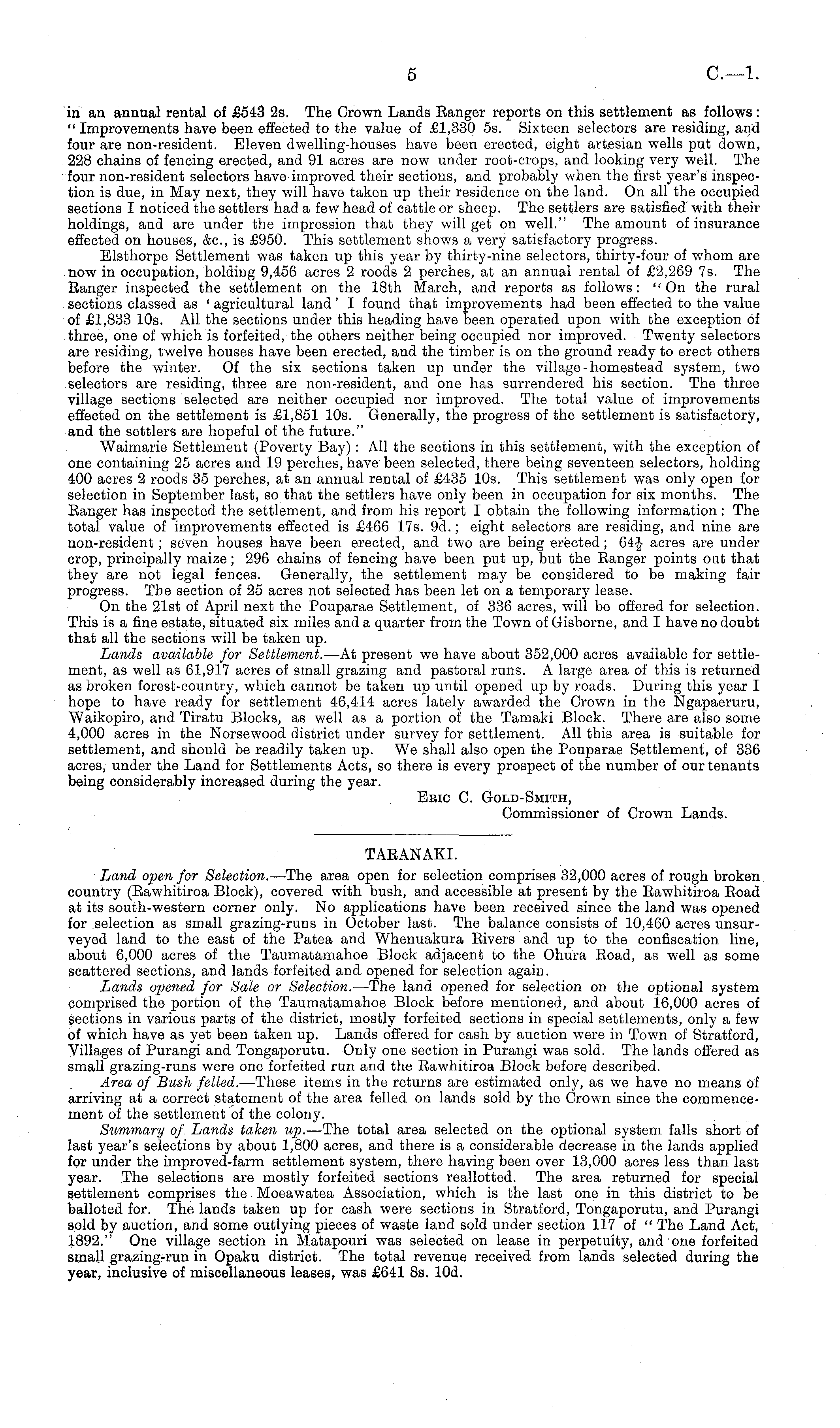 in an annual rental of £543 2s. The Crown Lands Banger reports on this settlement as follows: " Improvements have been effected to the value of £1,330 ss. Sixteen selectors are residing, and four are non-resident. Eleven dwelling-houses have been erected, eight artesian wells put down, 228 chains of fencing erected, and 91 acres are now under root-crops, and looking very well. The four non-resident selectors have improved their sections, and probably when the first year's inspection is due, in May next, they will have taken up their residence on the land. On all the occupied sections I noticed the settlers had a few head of cattle or sheep. The settlers are satisfied with their holdings, and are under the impression that they will get on well." The amount of insurance effected on houses, &c, is £950. This settlement shows a very satisfactory progress. Elsthorpe Settlement was taken up this year by thirty-nine selectors, thirty-four of whom are now in occupation, holding 9,456 acres 2 roods 2 perches, at an annual rental of £2,269 7s. The Eanger inspected the settlement on the 18th March, and reports as follows: "On the rural sections classed as ' agricultural land' I found that improvements had been effected to the value of £1,833 10s. All the sections under this heading have been operated upon with the exception of three, one of which is forfeited, the others neither being occupied nor improved. Twenty selectors are residing, twelve houses have been erected, and the timber is on the ground ready to erect others before the winter. Of the six sections taken up under the village-homestead system, two selectors are residing, three are non-resident, and one has surrendered his section. The three village sections selected are neither occupied nor improved. The total value of improvements effected on the settlement is £1,851 10s. Generally, the progress of the settlement is satisfactory, and the settlers are hopeful of the future." Waimarie Settlement (Poverty Bay): All the sections in this settlement, with the exception of one containing 25 acres and 19 perches, have been selected, there being seventeen selectors, holding 400 acres 2 roods 35 perches, at an annual rental of £435 10s. This settlement was only open for selection in September last, so that the settlers have only been in occupation for six months. The Banger has inspected the settlement, and from his report I obtain the following information: The total value of improvements effected is £466 17s. 9d.; eight selectors are residing, and nine are non-resident; seven houses have been erected, and two are being erected; 64|- acres are under crop, principally maize; 296 chains of fencing have been put up, but the Banger points out that they are not legal fences. Generally, the settlement may be considered to be making fair progress. The section of 25 acres not selected has been let on a temporary lease. On the 21st of April next the Pouparae Settlement, of 336 acres, will be offered for selection. This is a fine estate, situated six miles and a quarter from the Town of Gisborne, and I have no doubt that all the sections will be taken up. Lands available for Settlement. —At present we have about 352,000 acres available for settlement, as well as 61,917 acres of small grazing and pastoral runs. A large area of this is returned as broken forest-country, which cannot be taken up until opened up by roads. During this year I hope to have ready for settlement 46,414 acres lately awarded the Crown in the Ngapaeruru, Waikopiro, and Tiratu Blocks, as well as a portion of the Tamaki Block. There are also some 4,000 acres in the Norsewood district under survey for settlement. All this area is suitable for settlement, and should be readily taken up. We shall also open the Pouparae Settlement, of 336 acres, under the Land for Settlements Acts, so there is every prospect of the number of our tenants being considerably increased during the year. Eric C. Gold-Smith, Commissioner of Crown Lands.